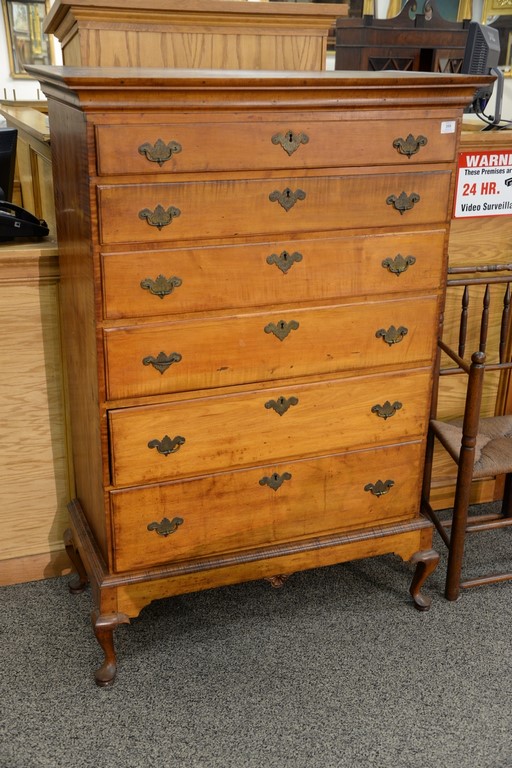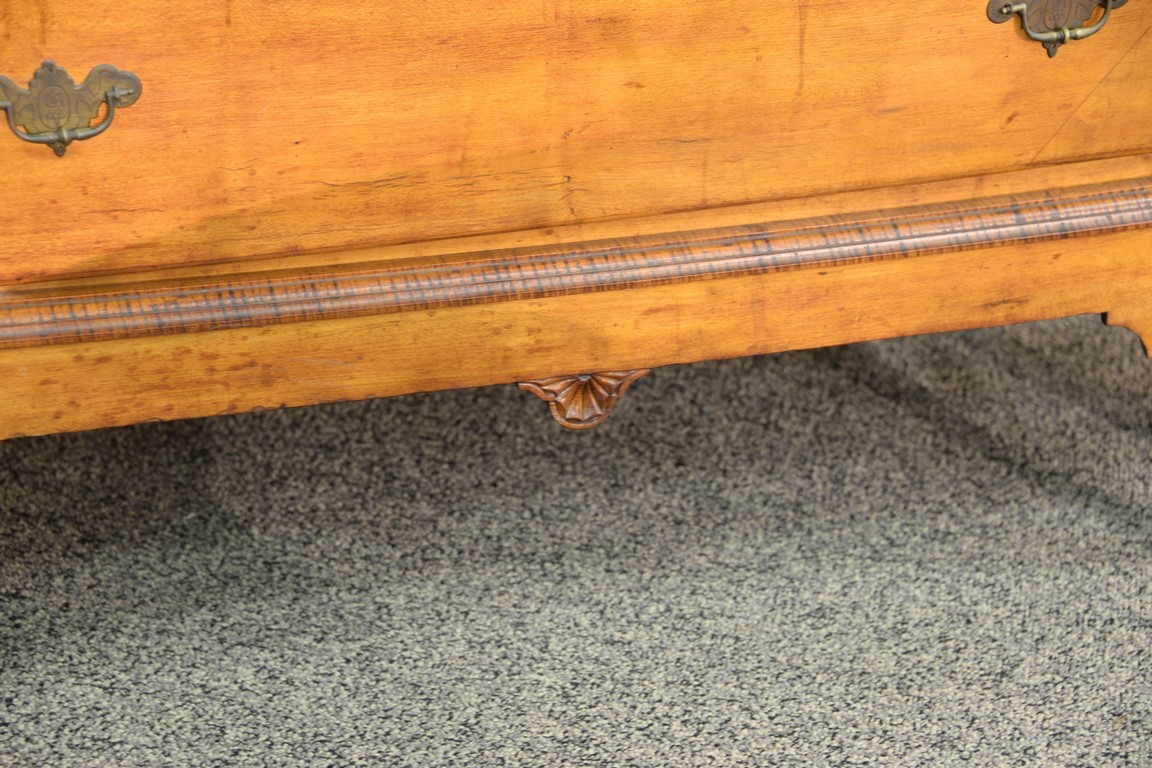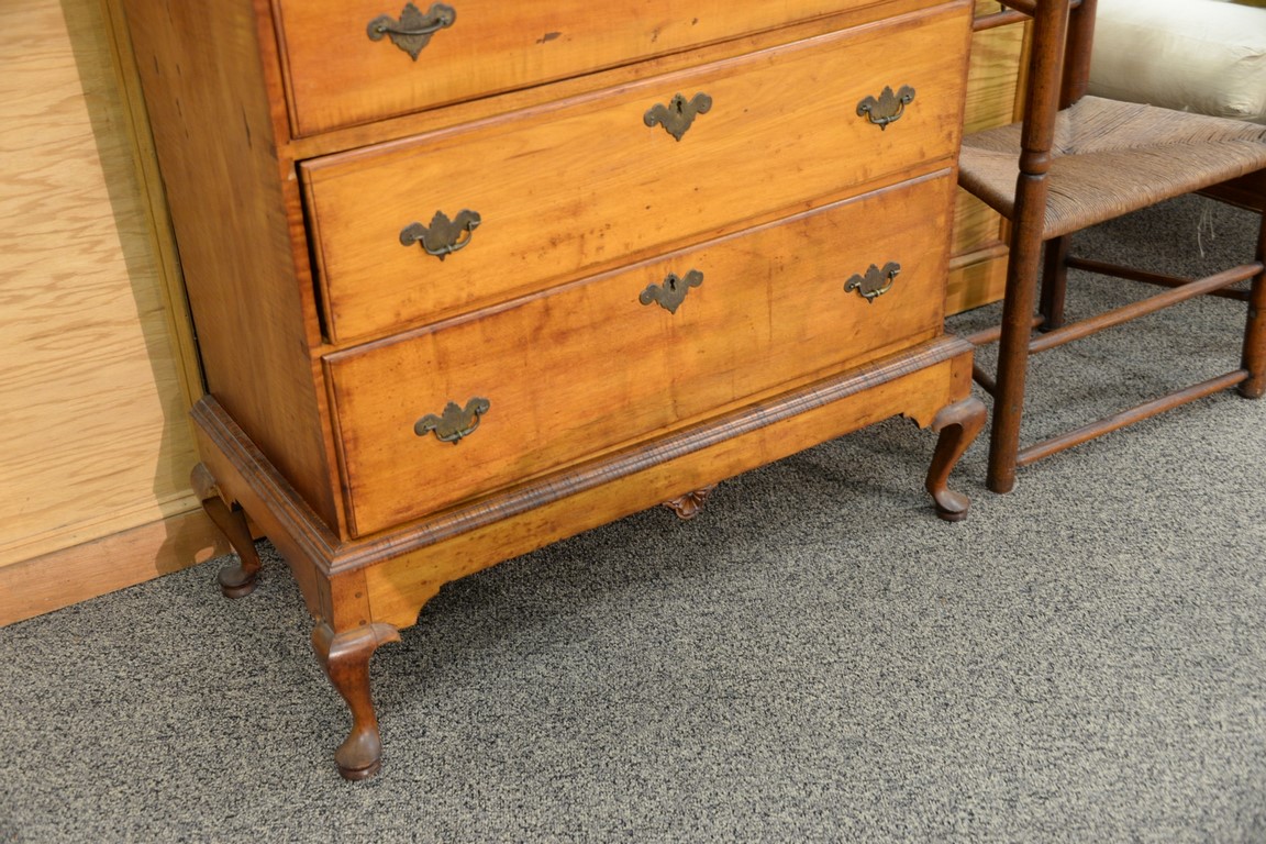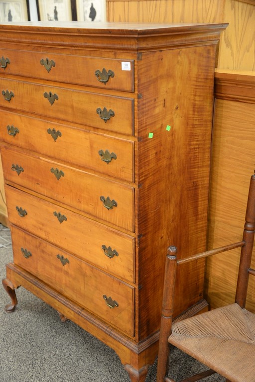 Lot 359: Queen Anne maple and tiger maple chest on frame having large cornice molding over six graduated drawers all set on base with center …