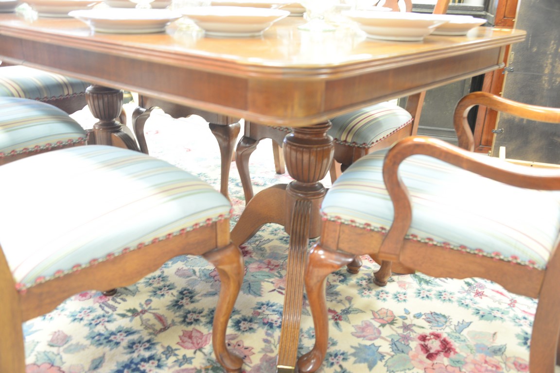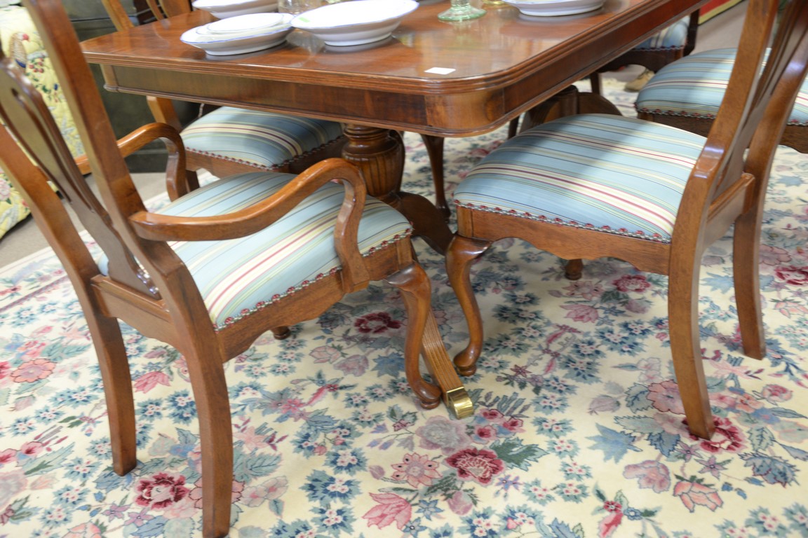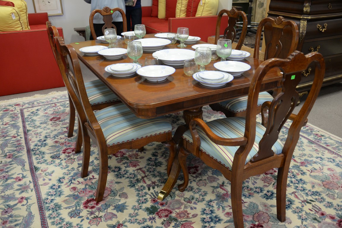 Lot 359: Seven piece lot Lexington mahogany double pedestal dining table with banded inlaid top and two 15inch leaves and six Queen Anne styl…