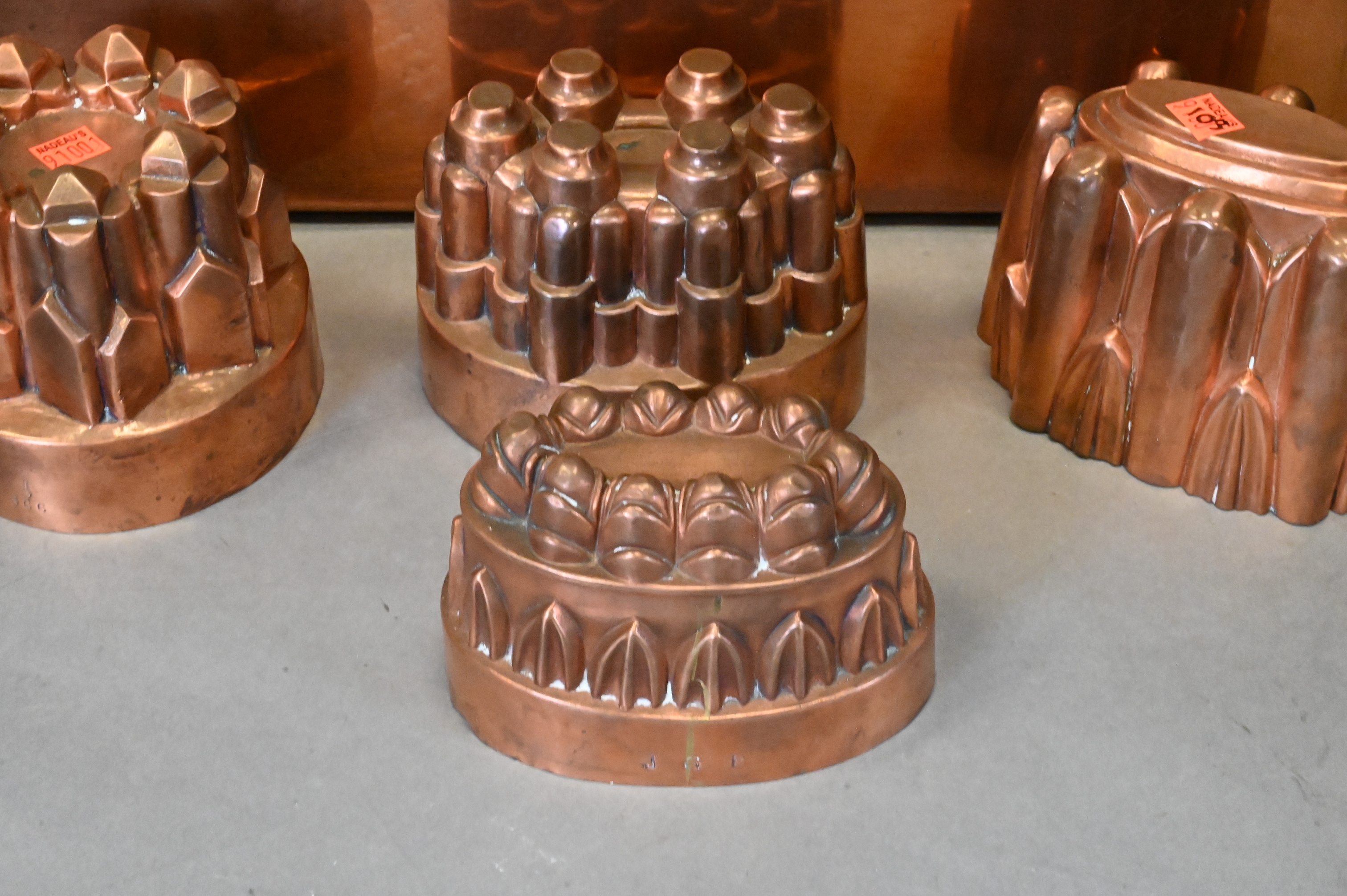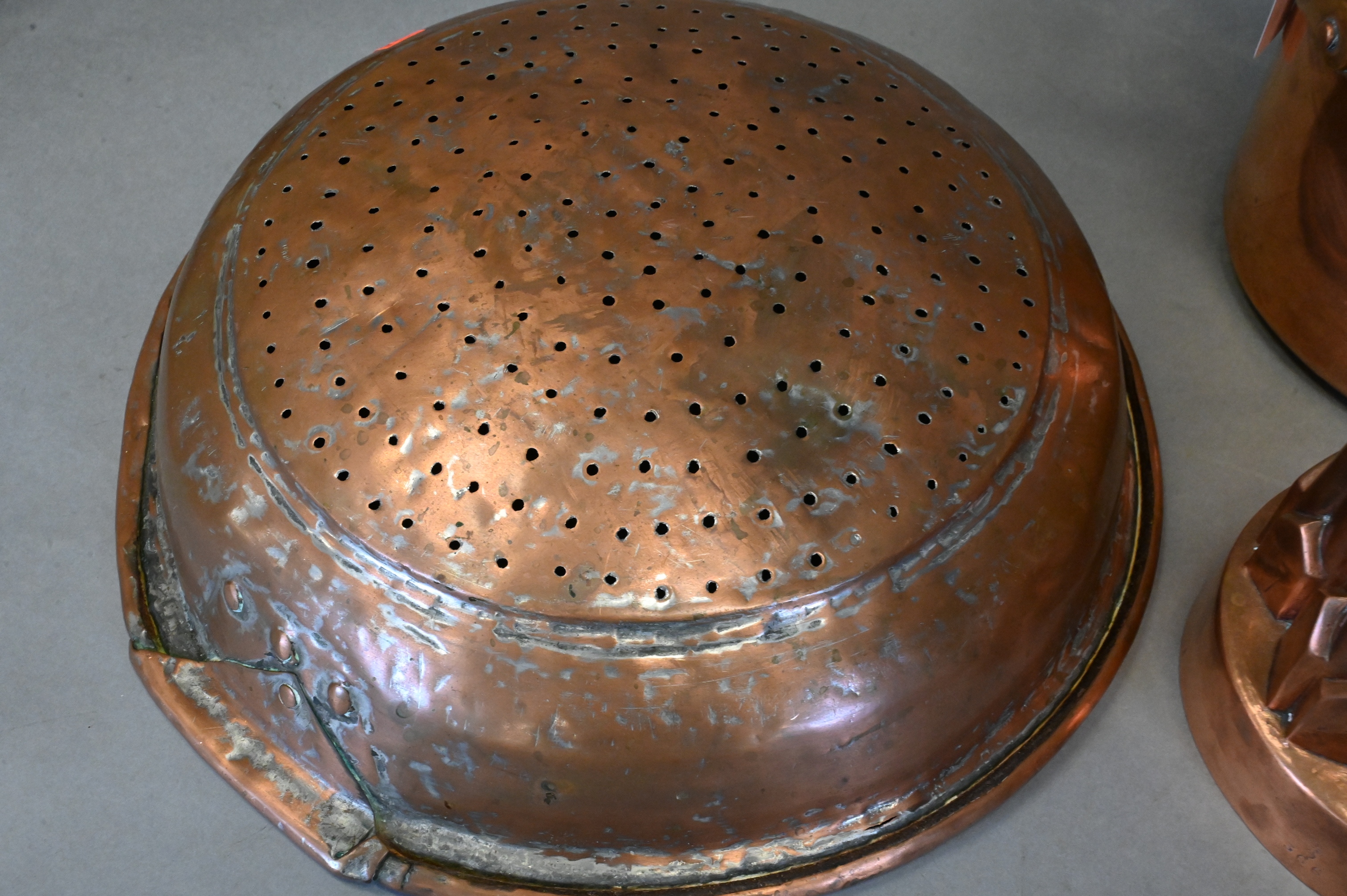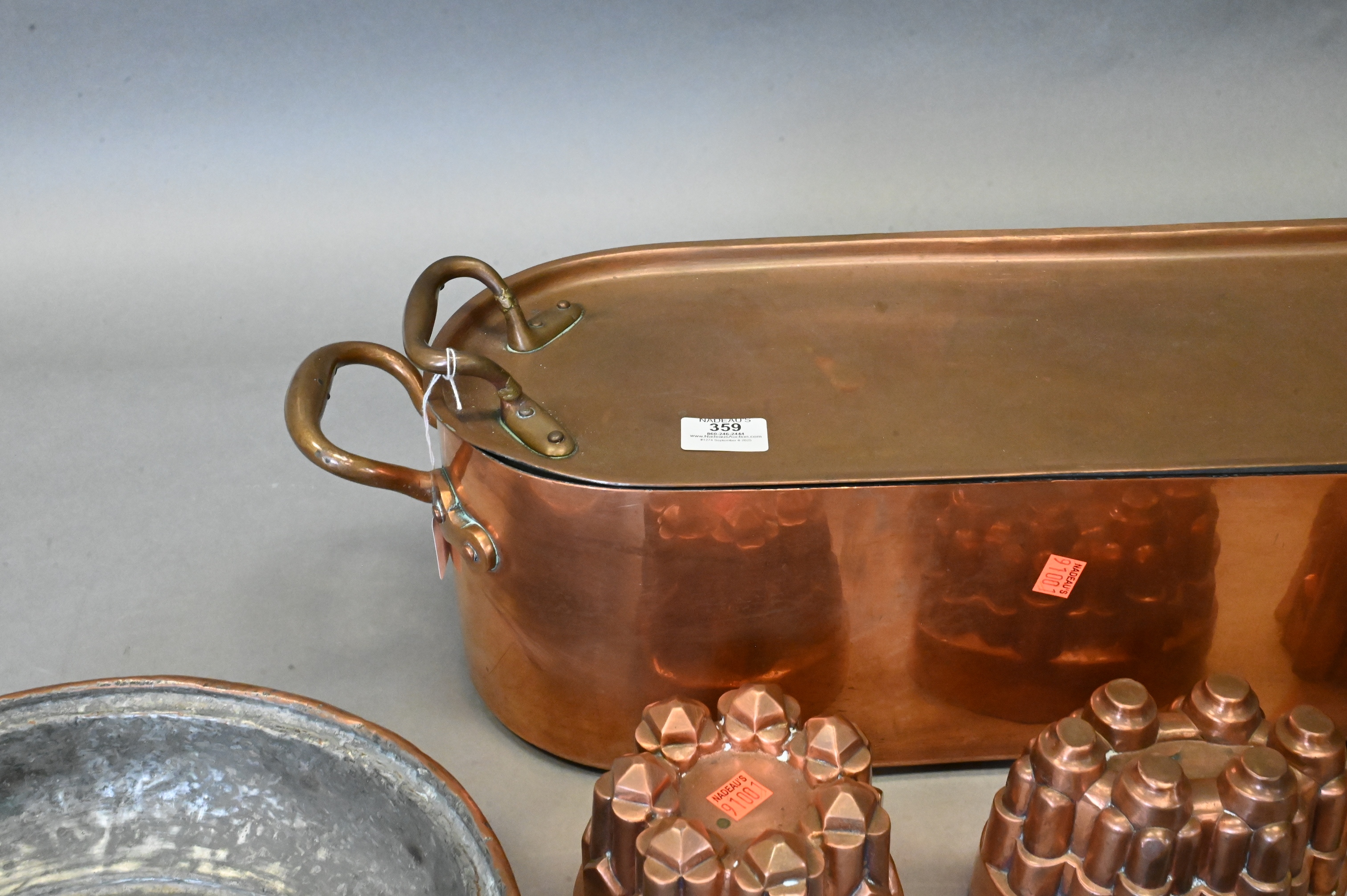elongated oval fish poacher with steamer insert, four jelly molds, model numbers, 366, 617, 101 along with circular strainer, marked with orb and cross makers mark,English 19th century