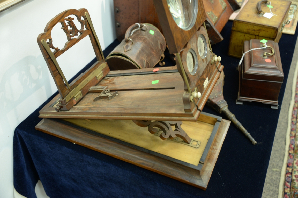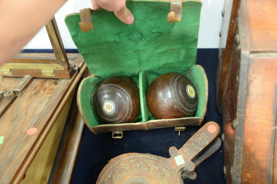 Lot 359: Six piece lot with Victorian graphoscope stereoscope viewer ht. 25 1/2in., picnic set in leather case, pair of 1952 Bocci Balls in…