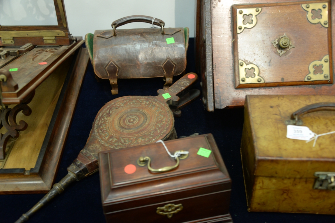 Six piece lot with Victorian graphoscope stereoscope viewer ht. 25 1/2in., picnic set in leather case, pair of 1952 Bocci Balls in leather case, carved bellows, tea caddy, and a coal hod. Provenance: Collection of Anne Jones Willis and the late John Ralph Willis, New Jersey