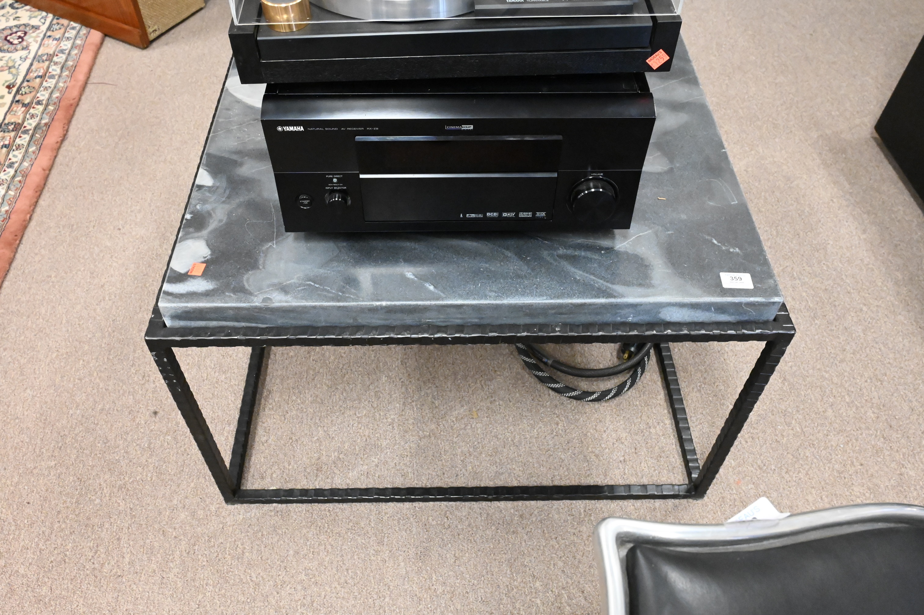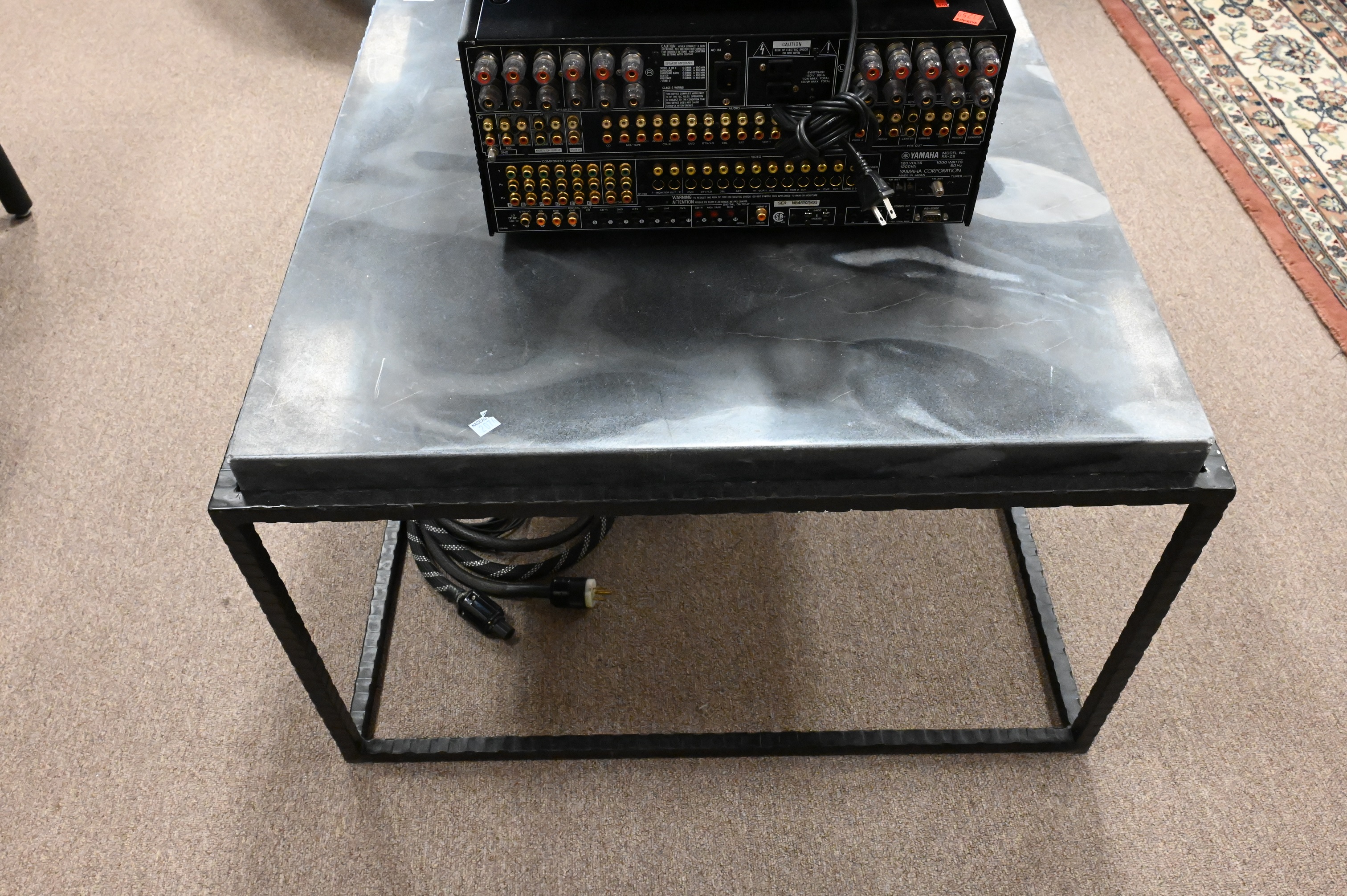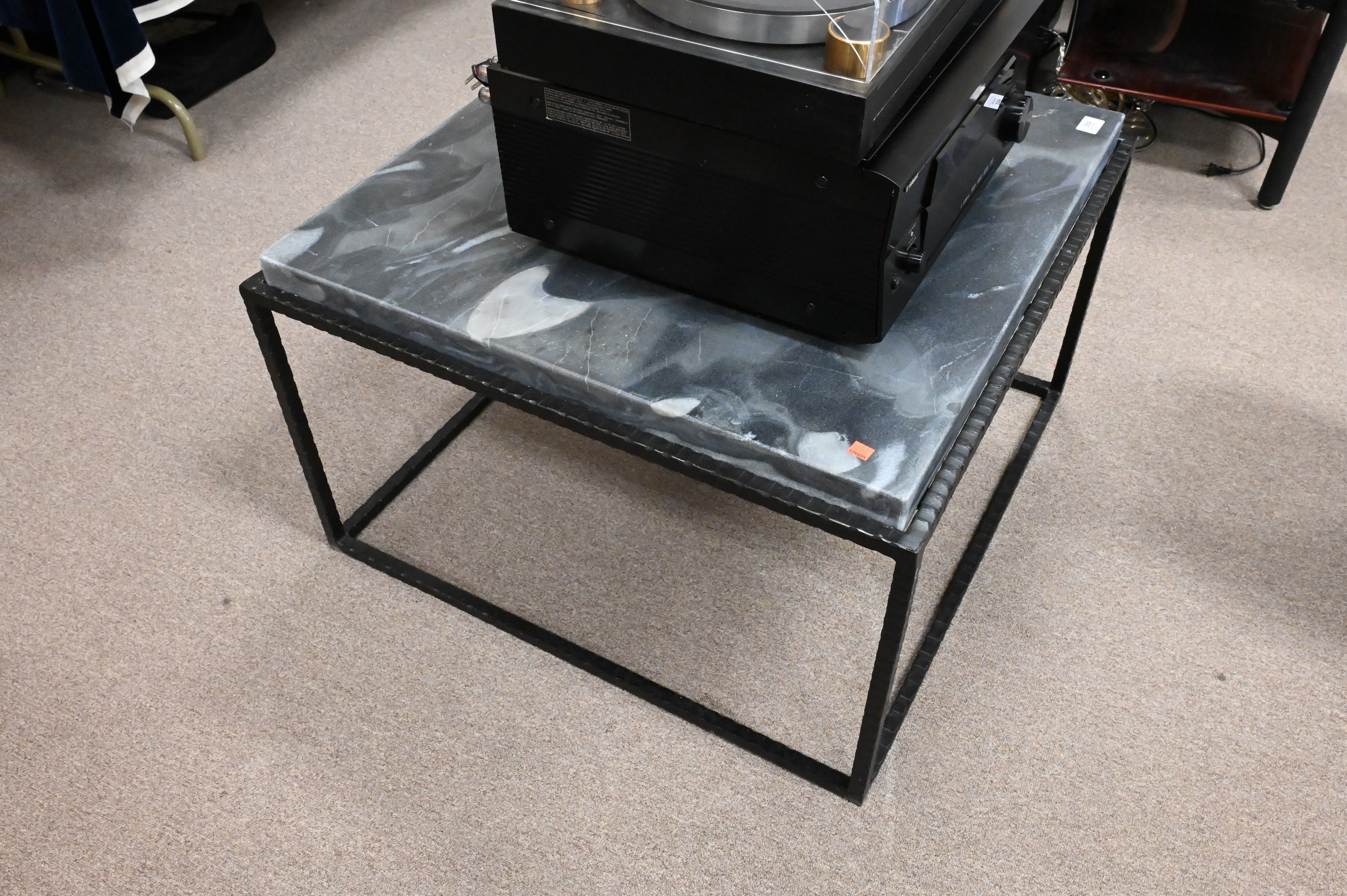 Square Coffee/Cocktail Table, having grey marble top on hammered iron base, possibly Global Views or Arteriors, height 19 1/2 inches, top 30 1/4″ x 30 1/4″.