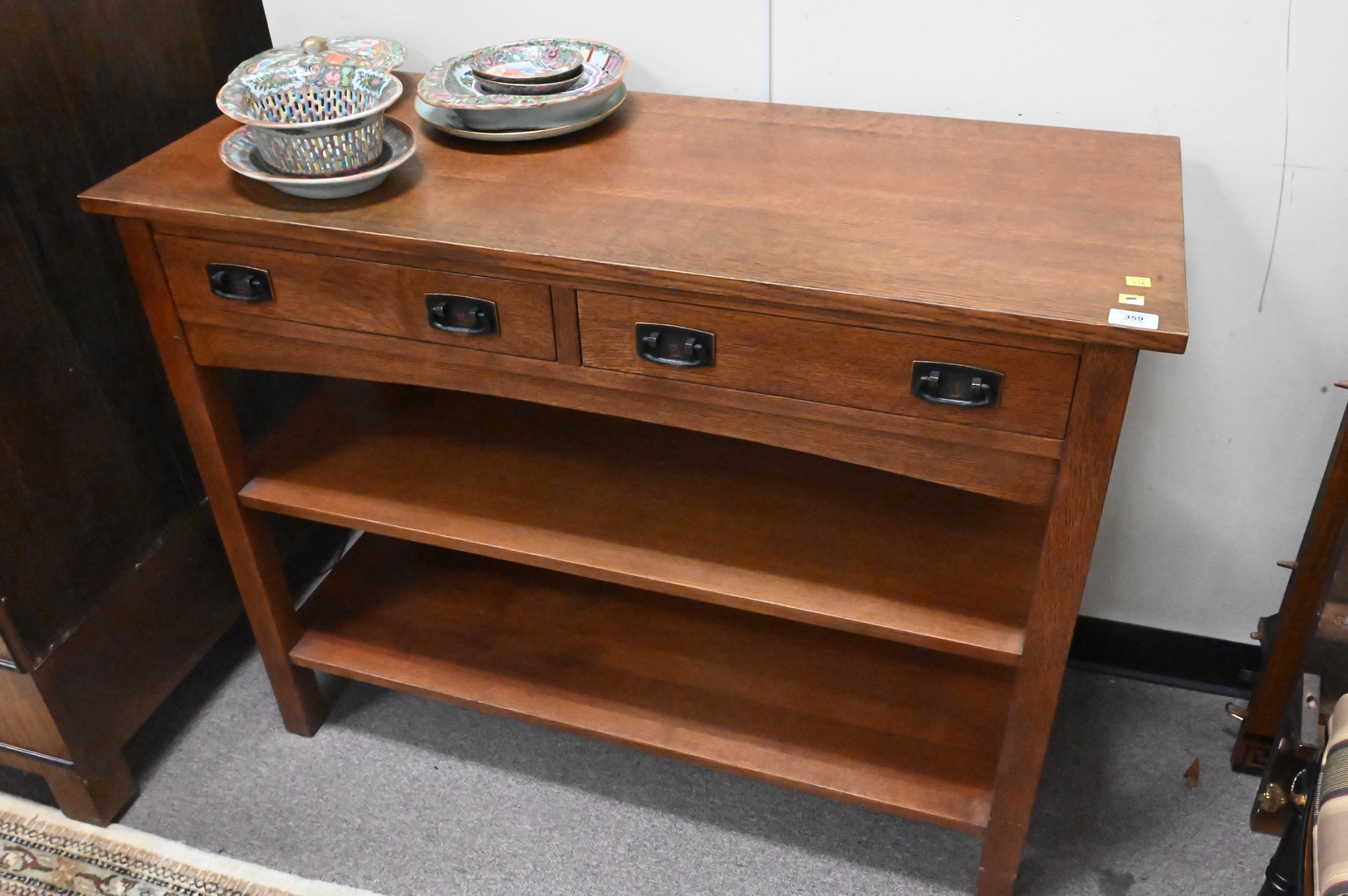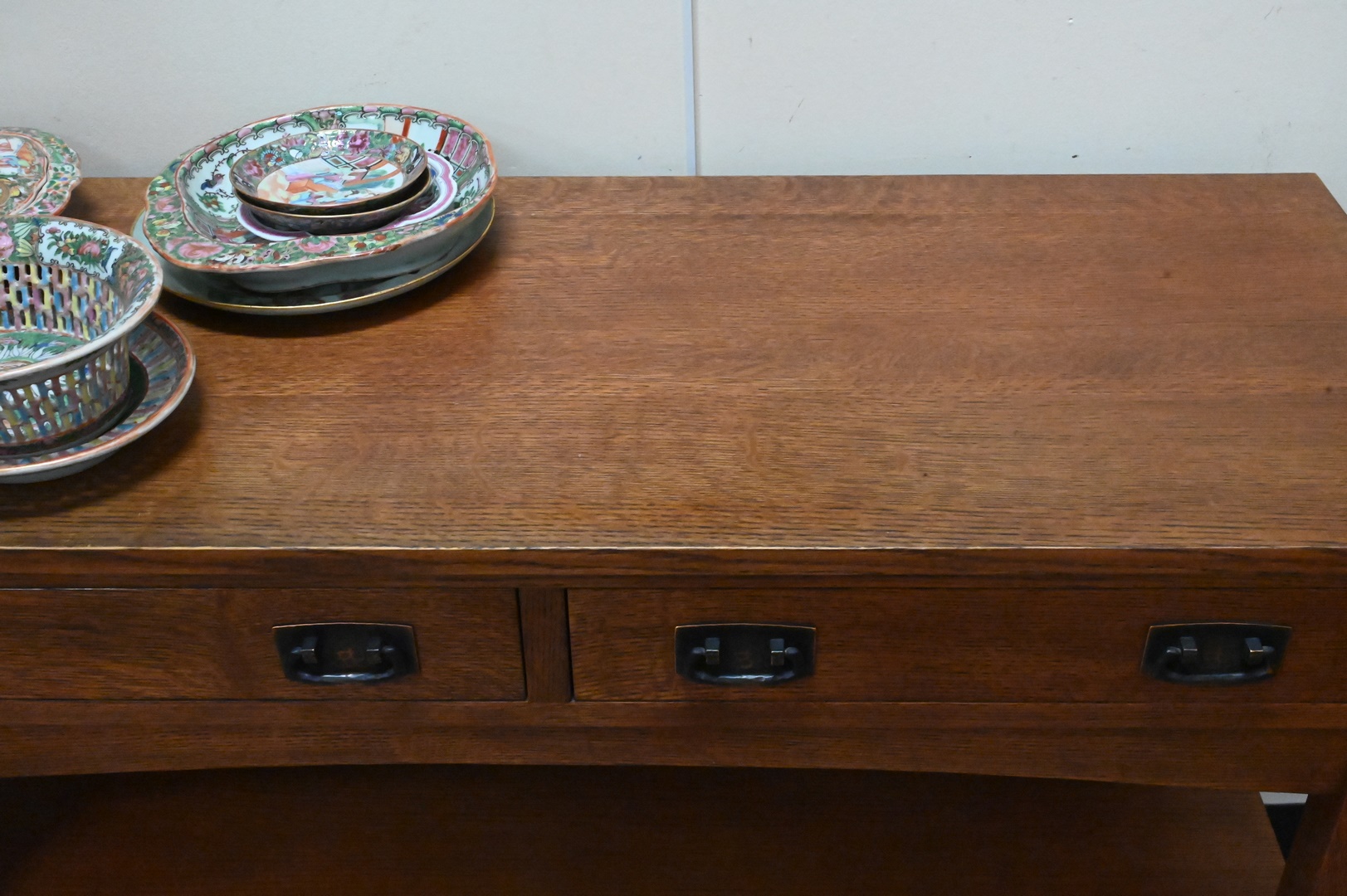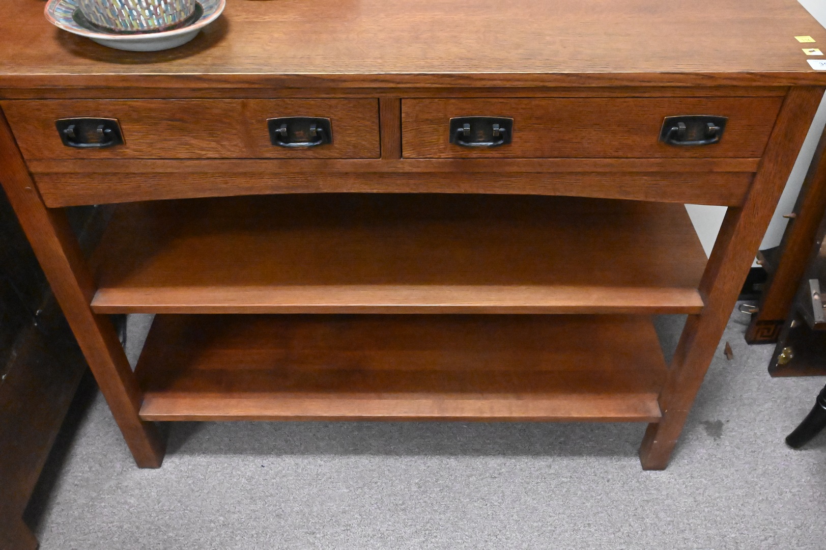 Stickley Mission Oak Server, having two drawers over two tiers of open shelving, height 3 inches, top 18″ x 44″.