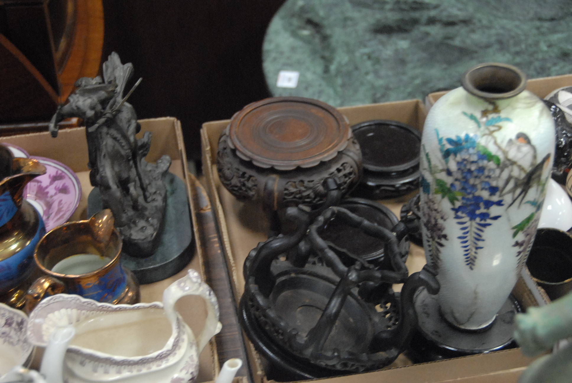 Three box lots to include Chinese vases and teapots, Oriental carved small stands, copper luster, and Frederic Remington bronze figure.