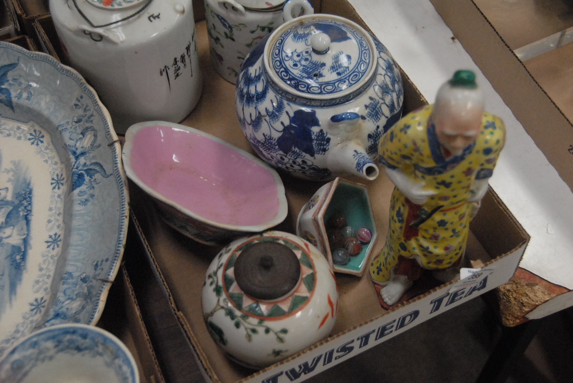 Lot 359: Three box lots to include Chinese vases and teapots, Oriental carved small stands, copper luster, and Frederic Remington bronze figure.