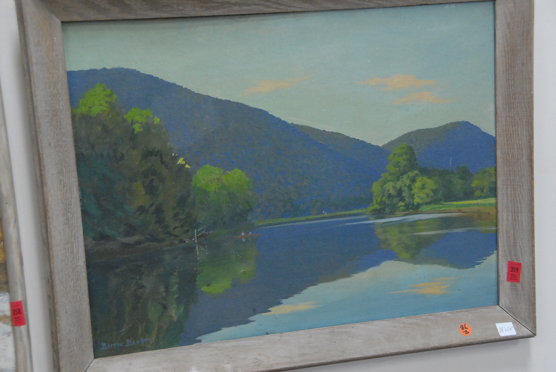 Three paintings, two oil on canvas, one oil on board, a winter scene, oxen on a beach, and two men in a boat