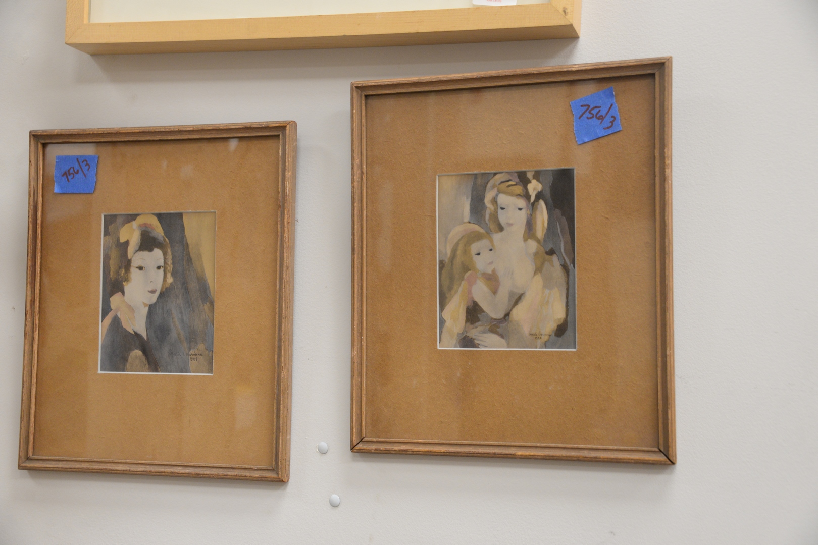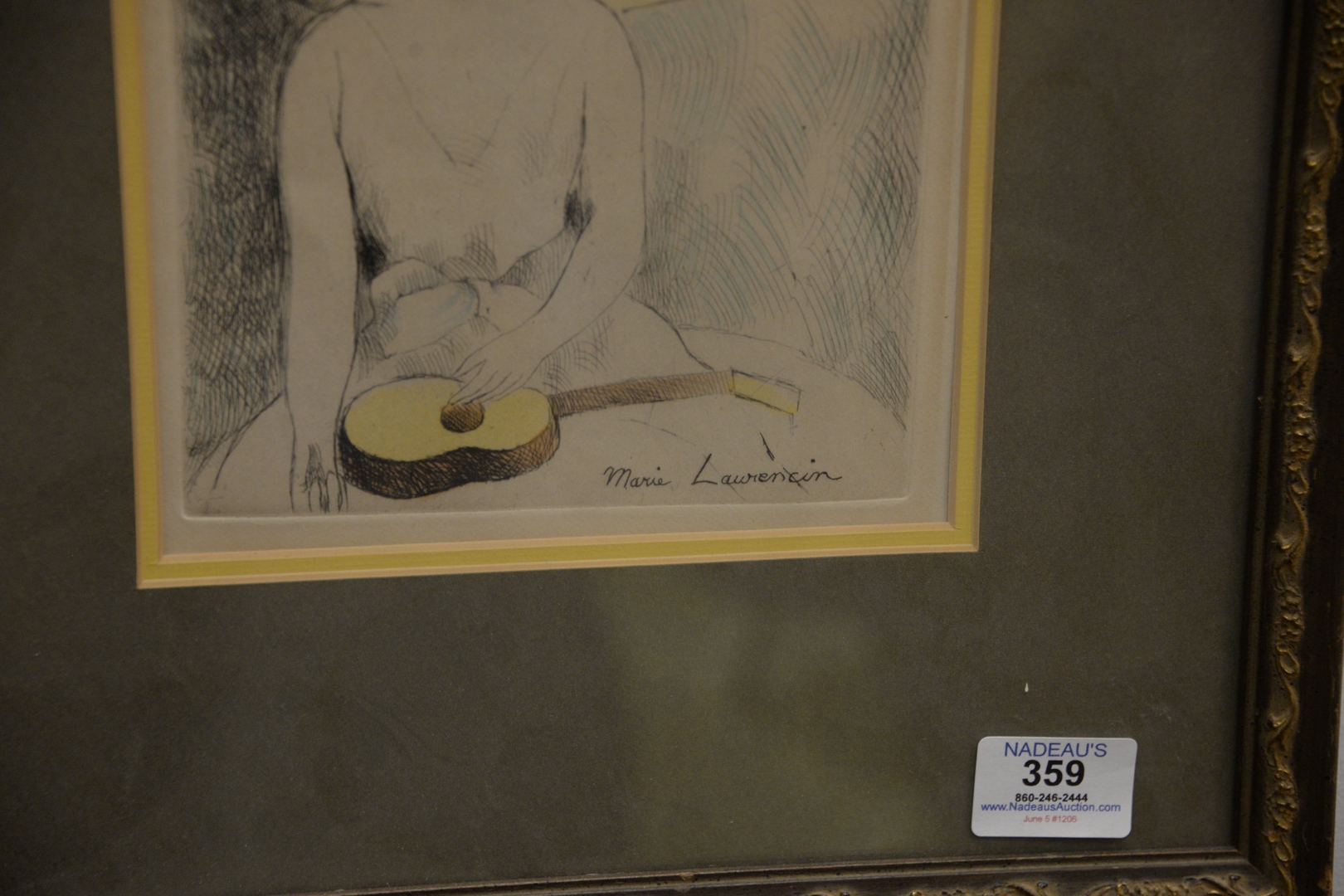 Lot 359: Three piece group of Marie Laurencin French, 1883 – 1956, Girl and Guitar, engraving on paper with hand coloring, along with two framed reproductions, 7 3/4 x 6 1/2.