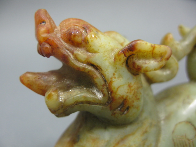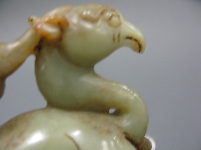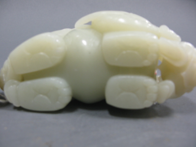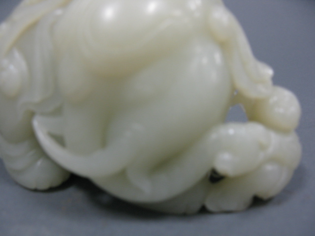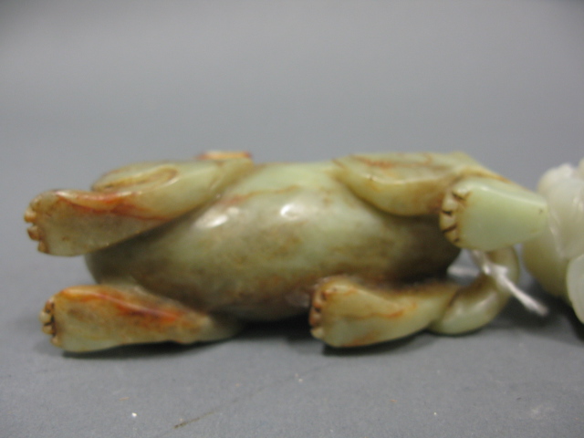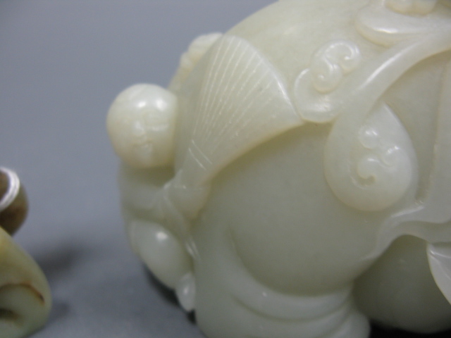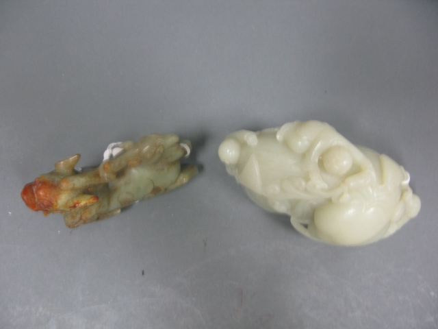 Two items celadon green jade elephant with three boys playing and carved jade recumbent lion having celadon color with russet area.