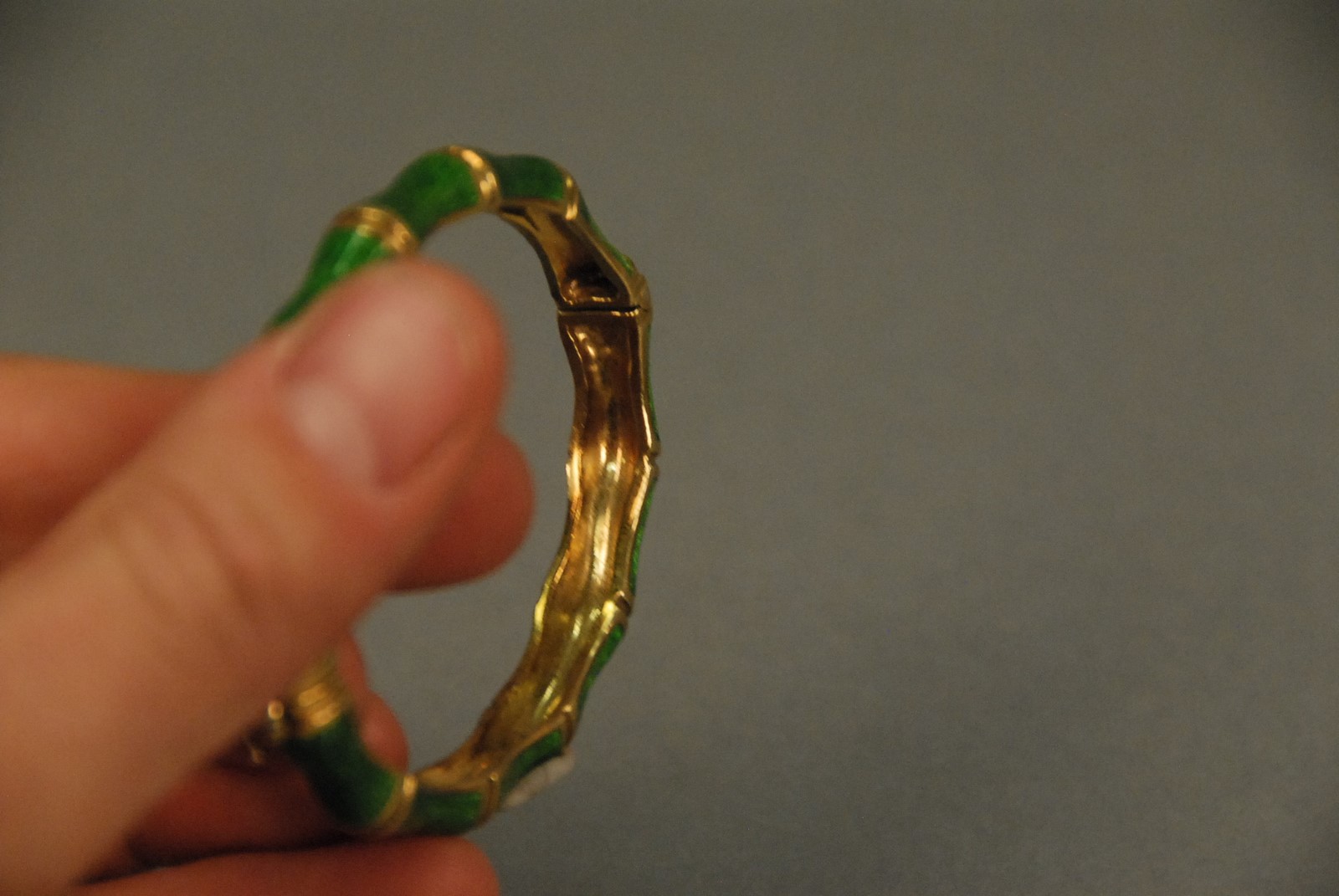 Lot 36: 18K yellow gold and green enameled bamboo bangle bracelet, makers mark illegible, 50.2 grams. Provenance: Property from The Estate of Margaret Reventlow of Litchfield, CT