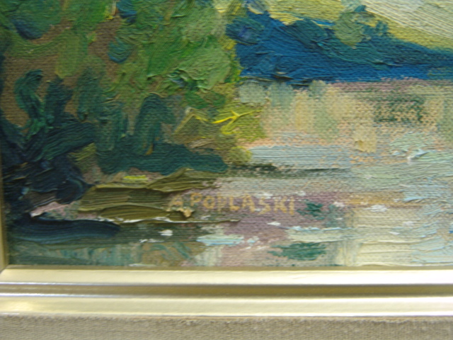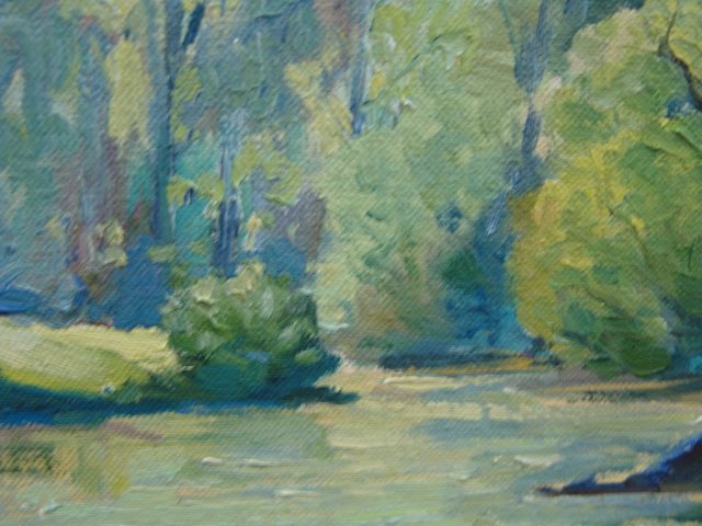 Alex Poplaski oil on board painting of a morning landscape with a river