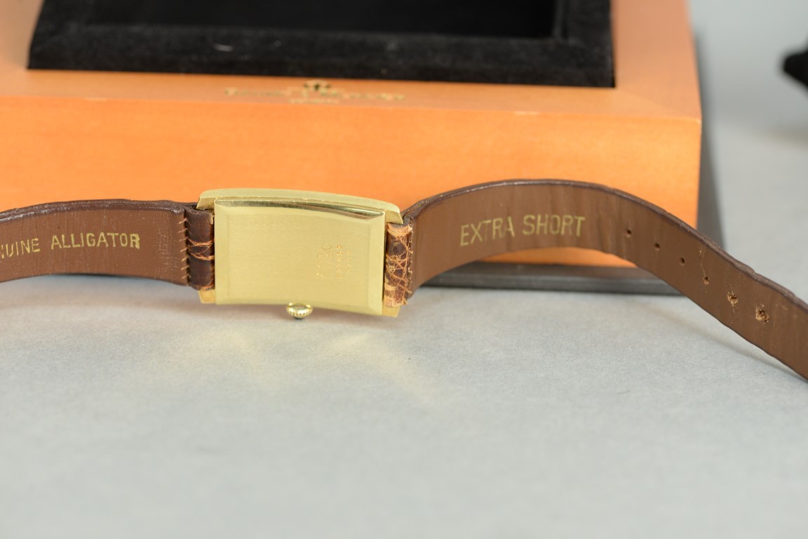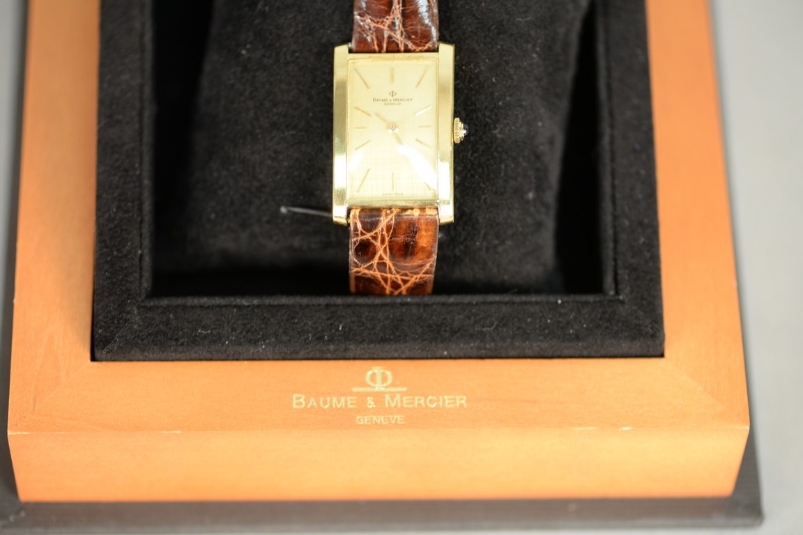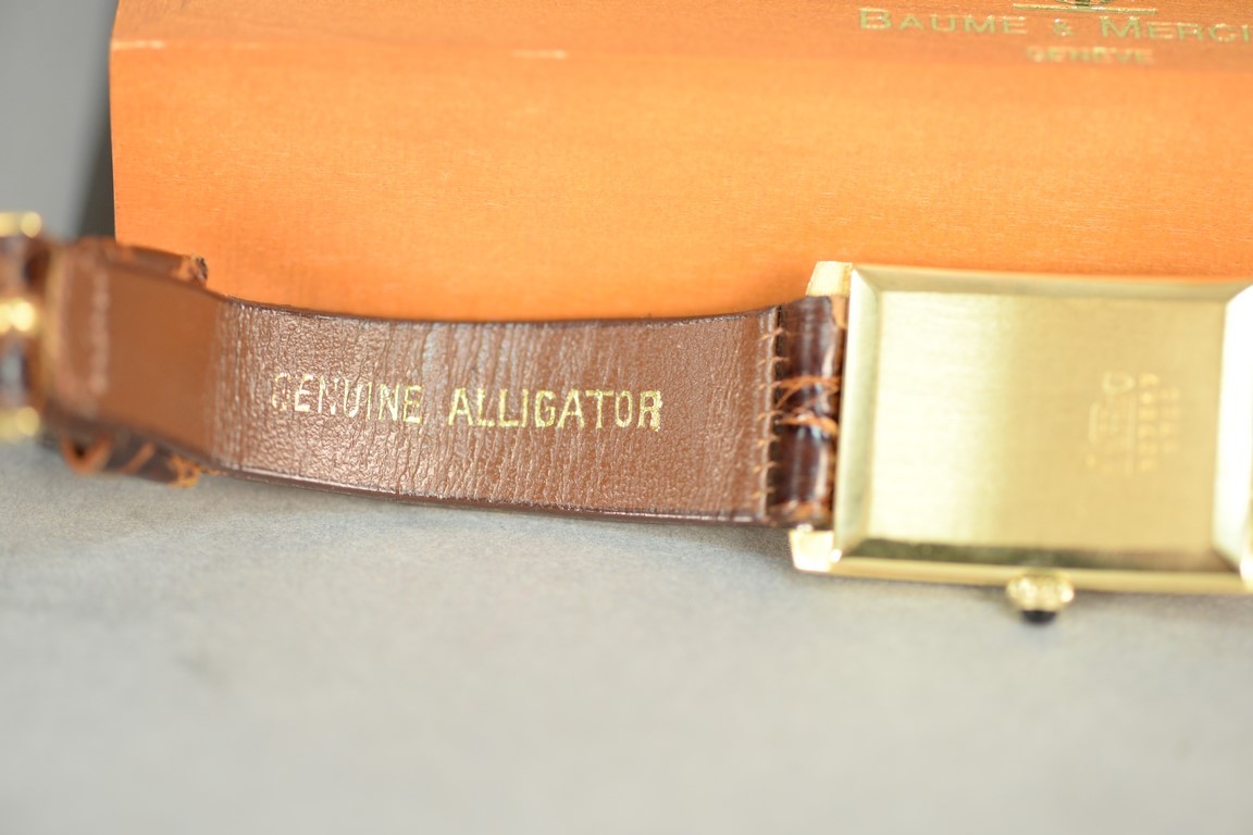 Baume & Mercier 18K rectangular wristwatch with brown alligator strap with box.