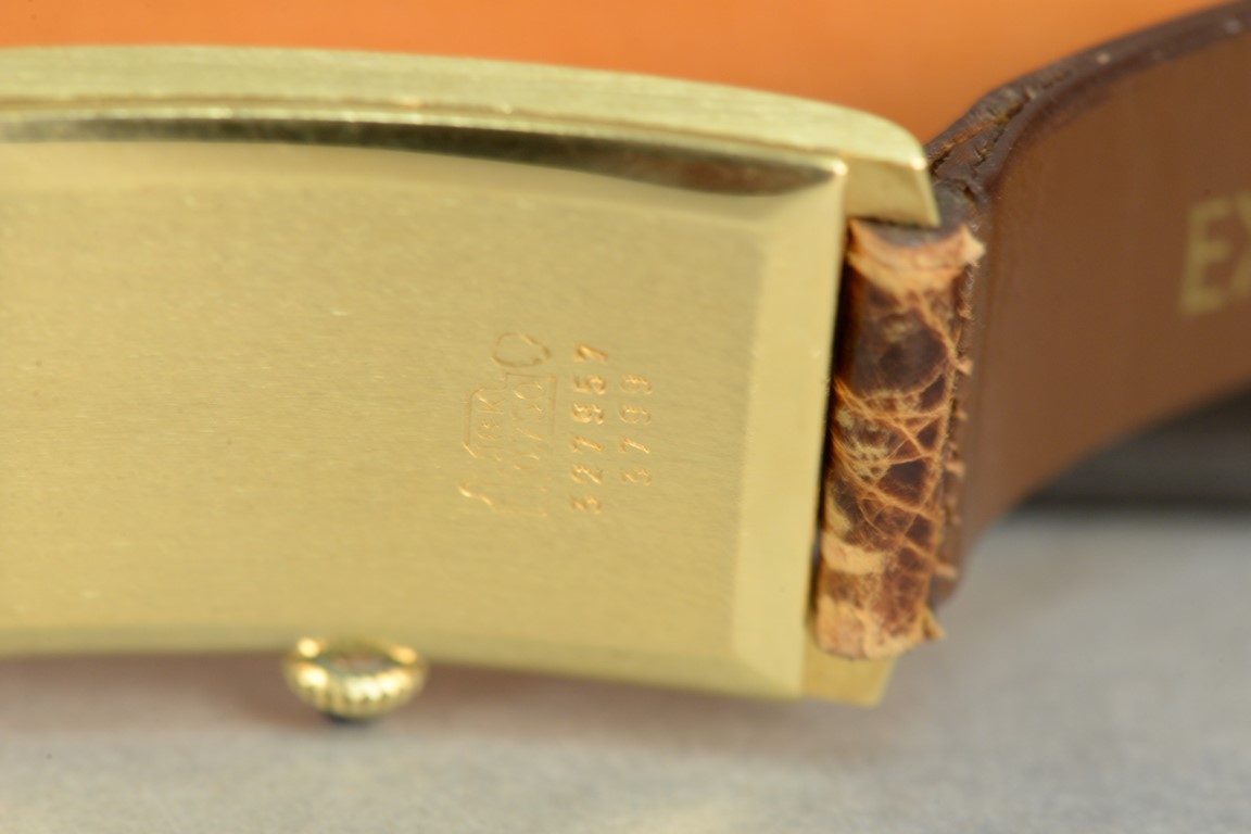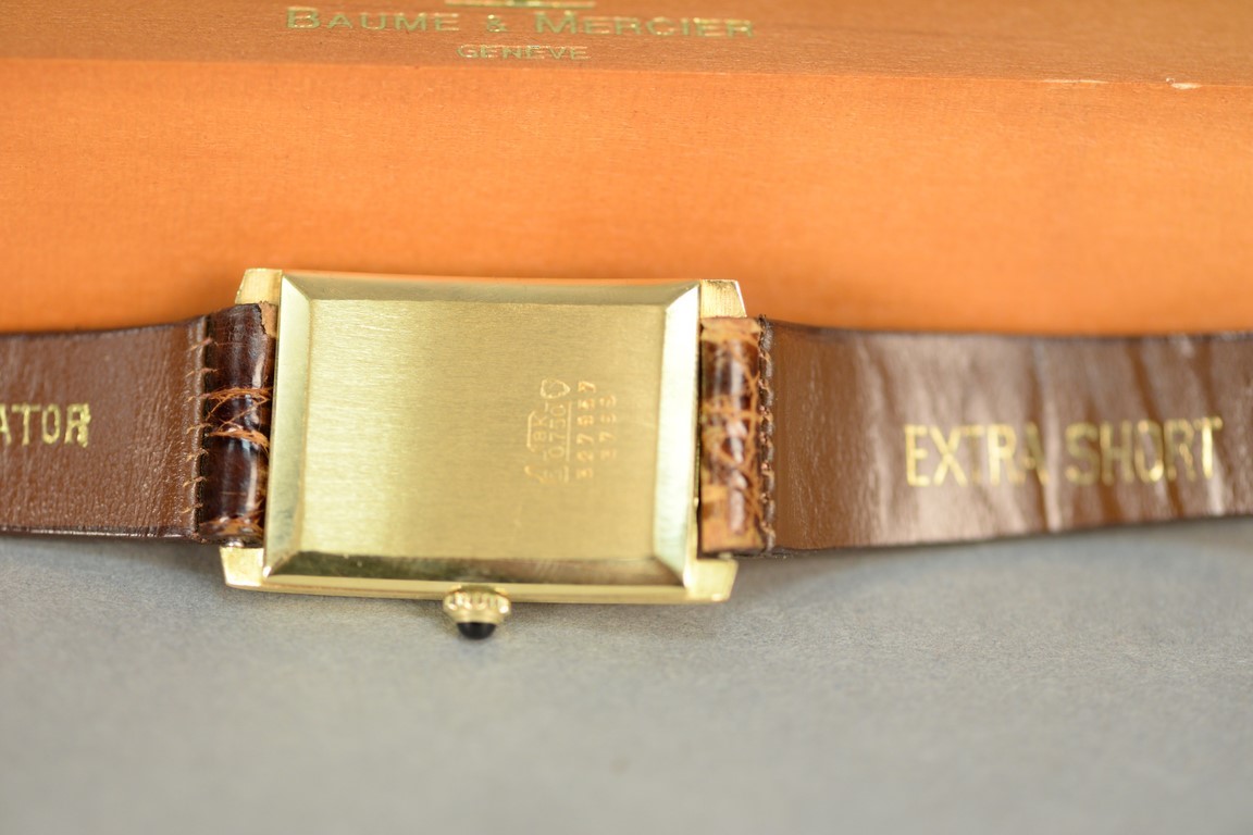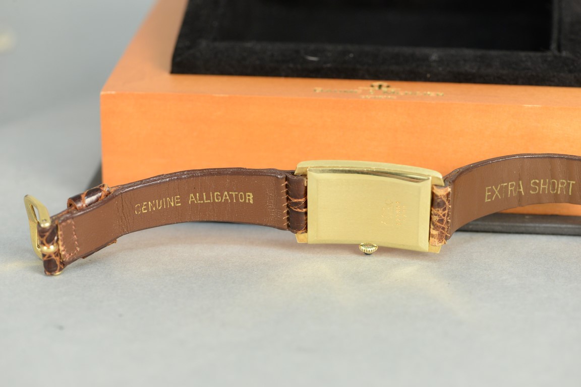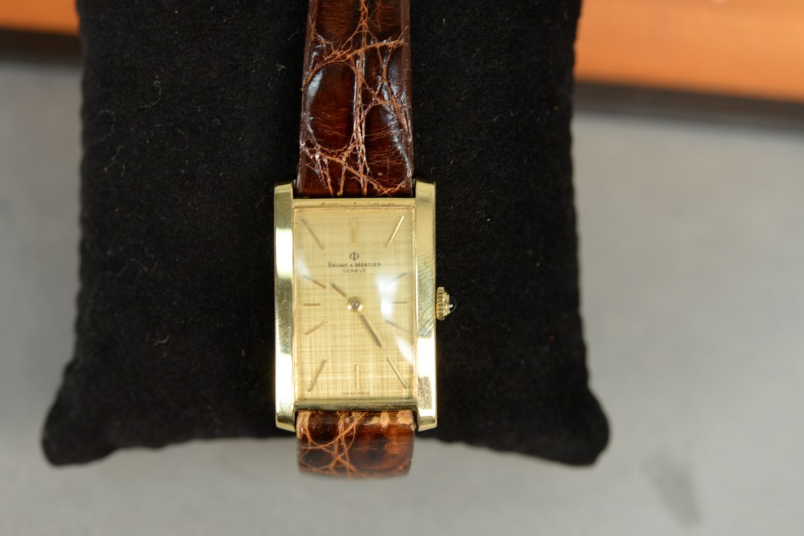 Baume & Mercier 18K rectangular wristwatch with brown alligator strap with box.