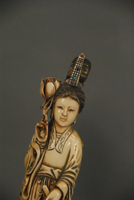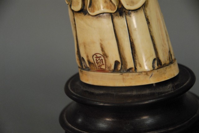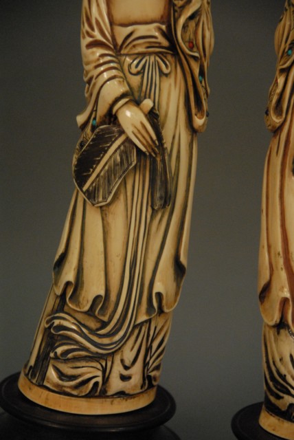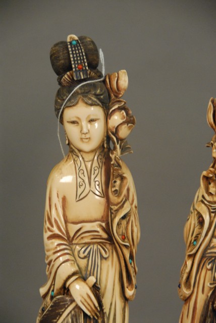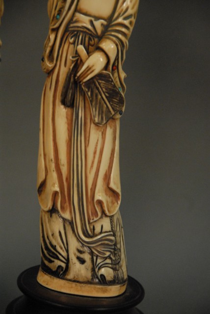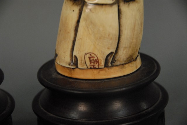 Chinese early 19th century pair of ivory figures, standing ladies holding lotus flowers on original stands with Yong Zheng mark in the back.