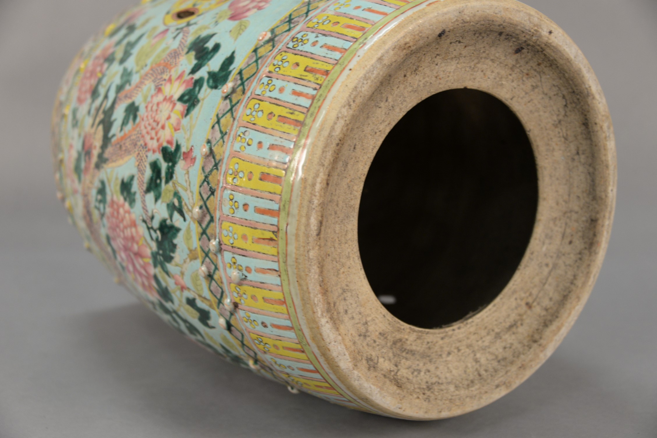 Lot 36: Famille Rose garden seat with four claw dragons and blossoming lotus. ht. 19 in. dia. 12 1/2 in.
