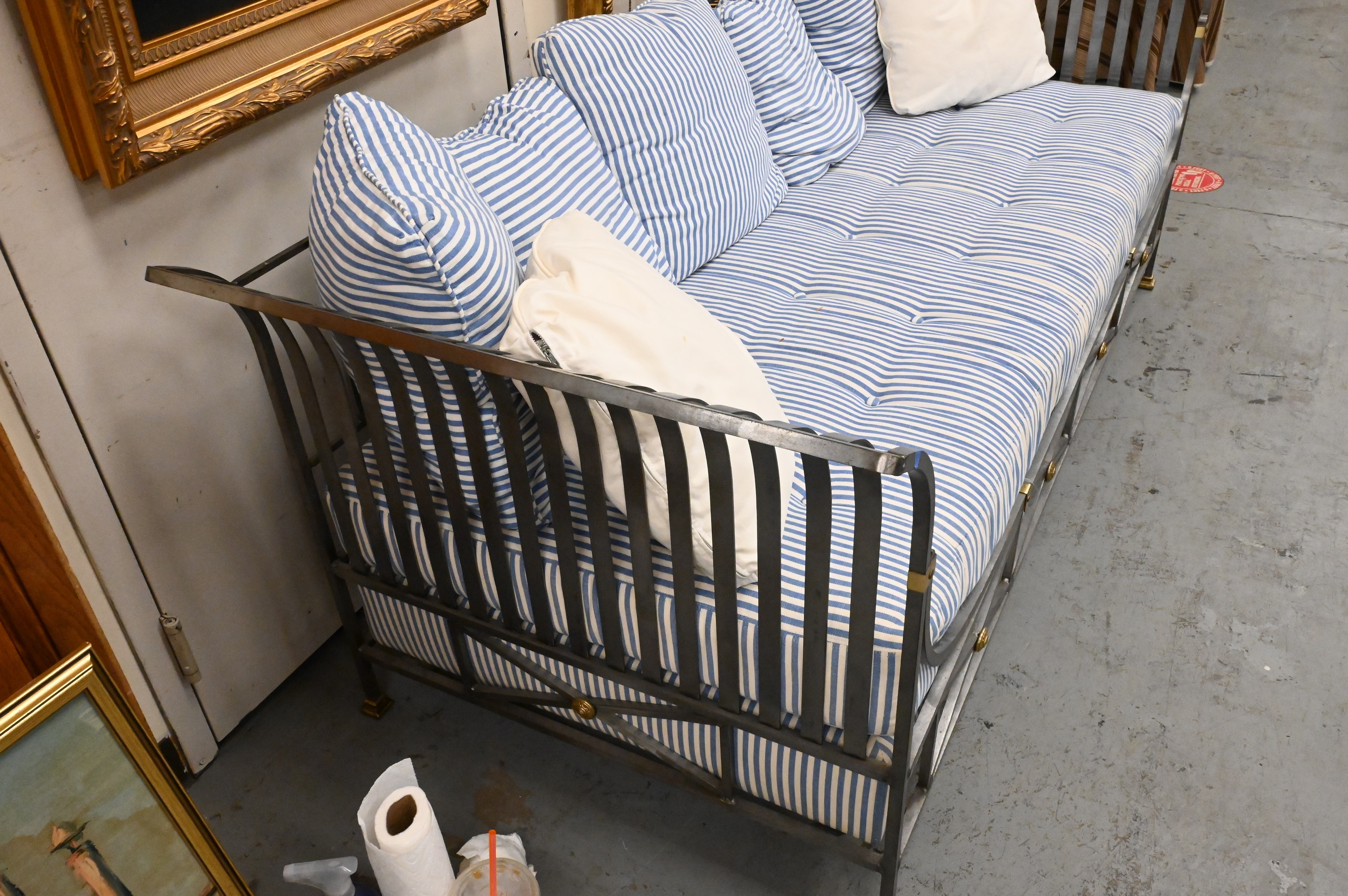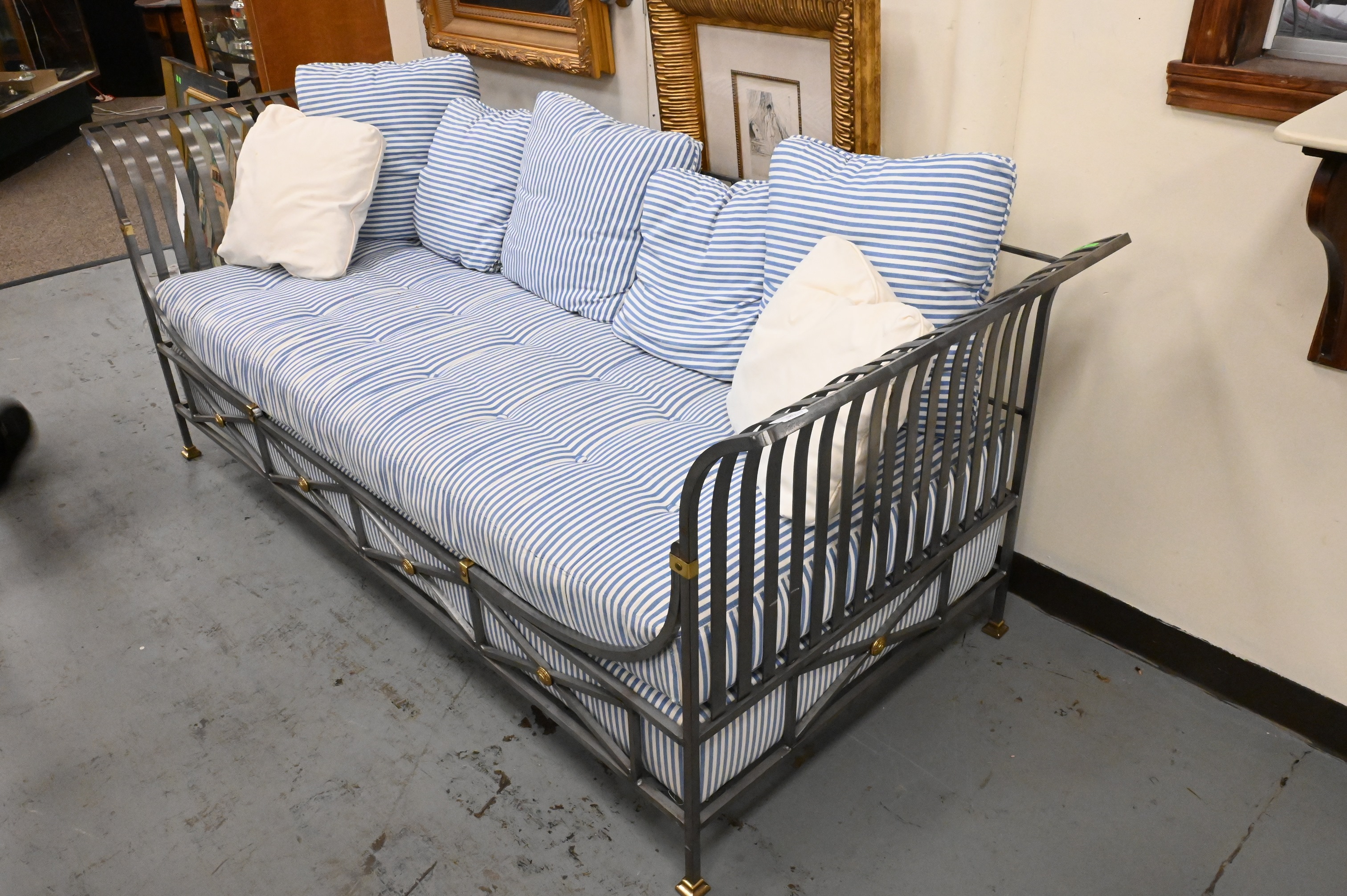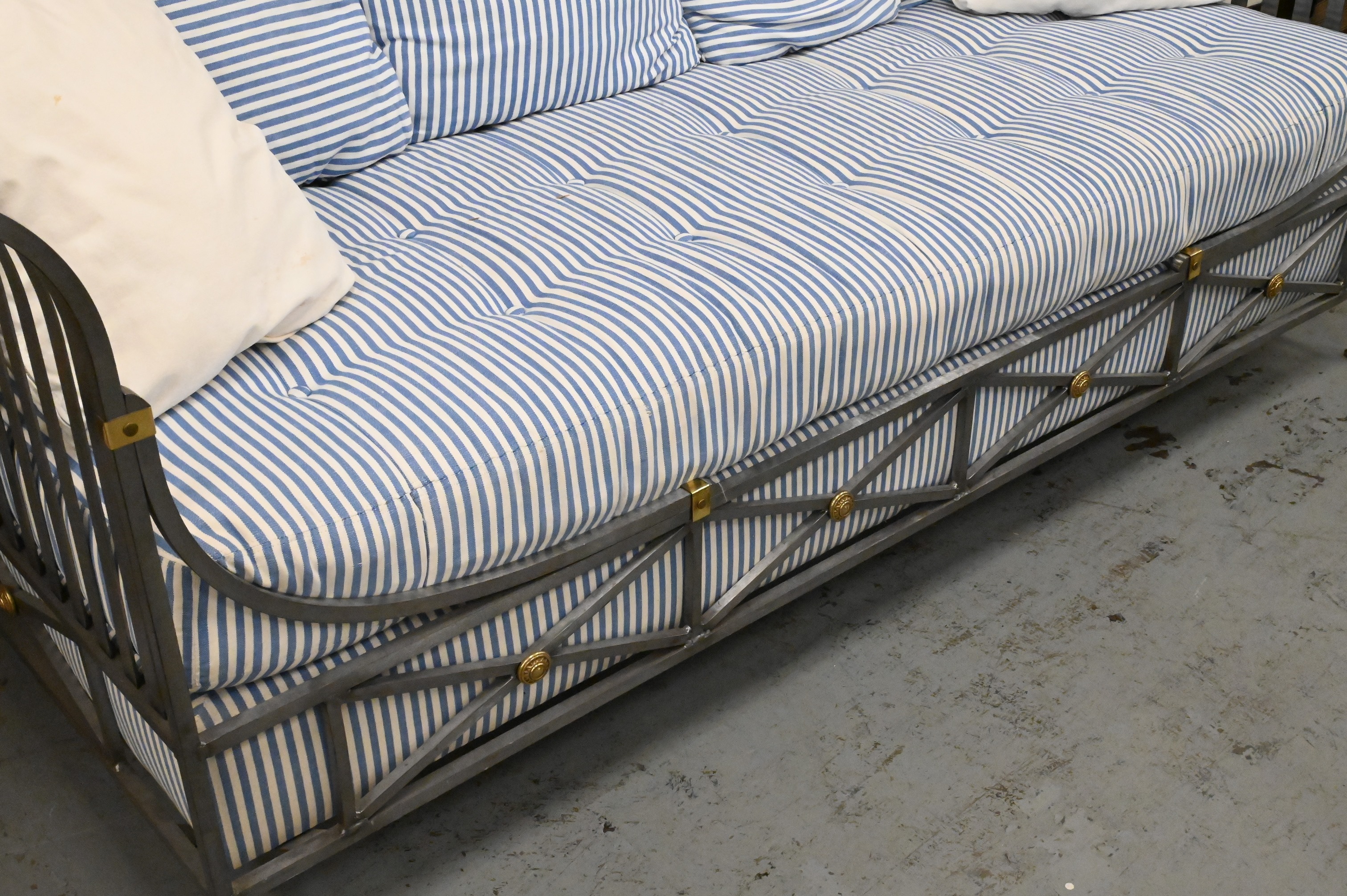 Henredon Neoclassical Style Daybed, having sturdy steel frame with brass accents and fully upholstered cushion with matching pillows, height 33 inches, length 83 inches, depth 33 inches.