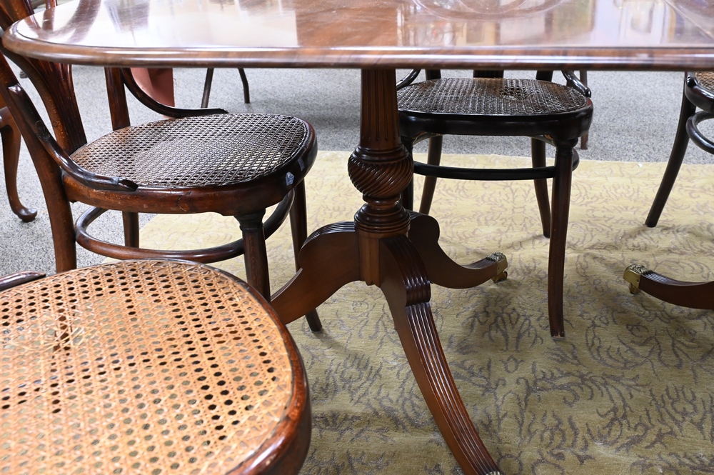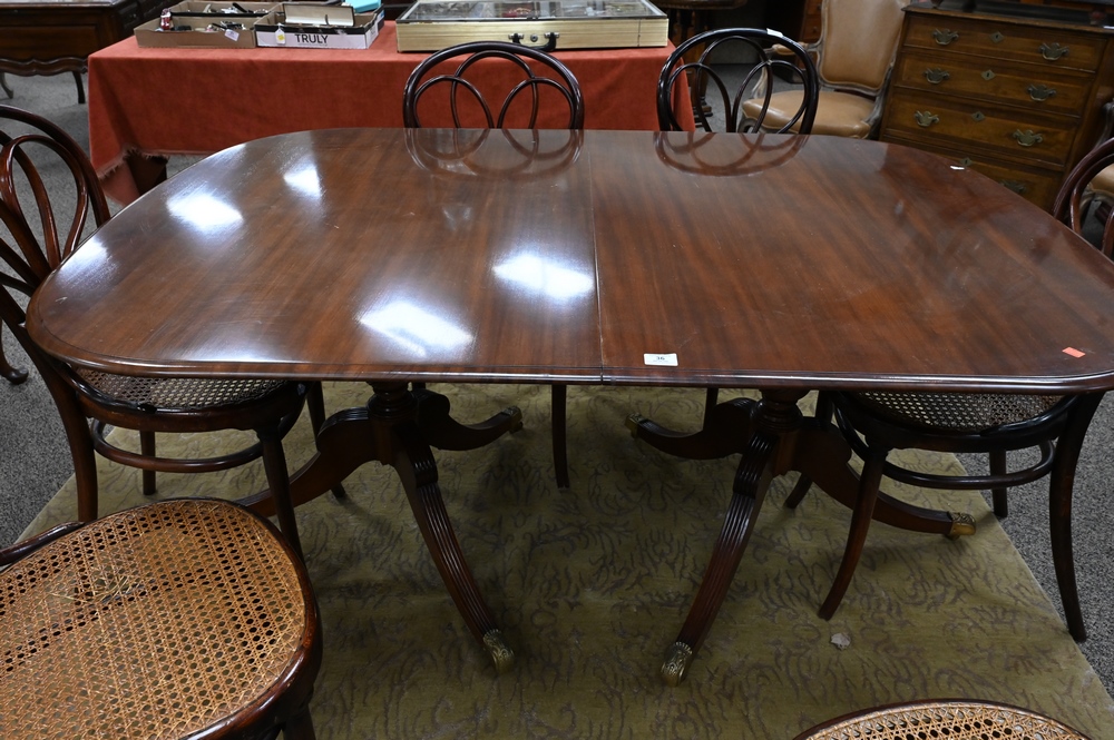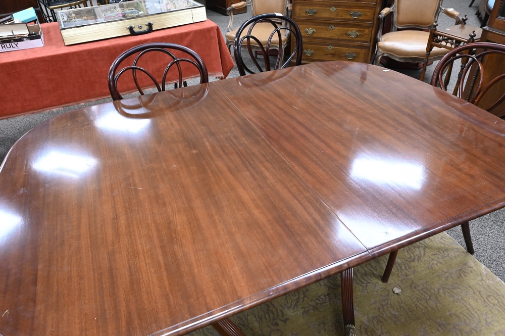 Lot 36: Margolis Custom Mahogany Double Pedestal Dining Table, height 29 inches, top 43 1/2 x 64 inches, along with three 14 inch leaves, top open 43 1/2″ x 106″.