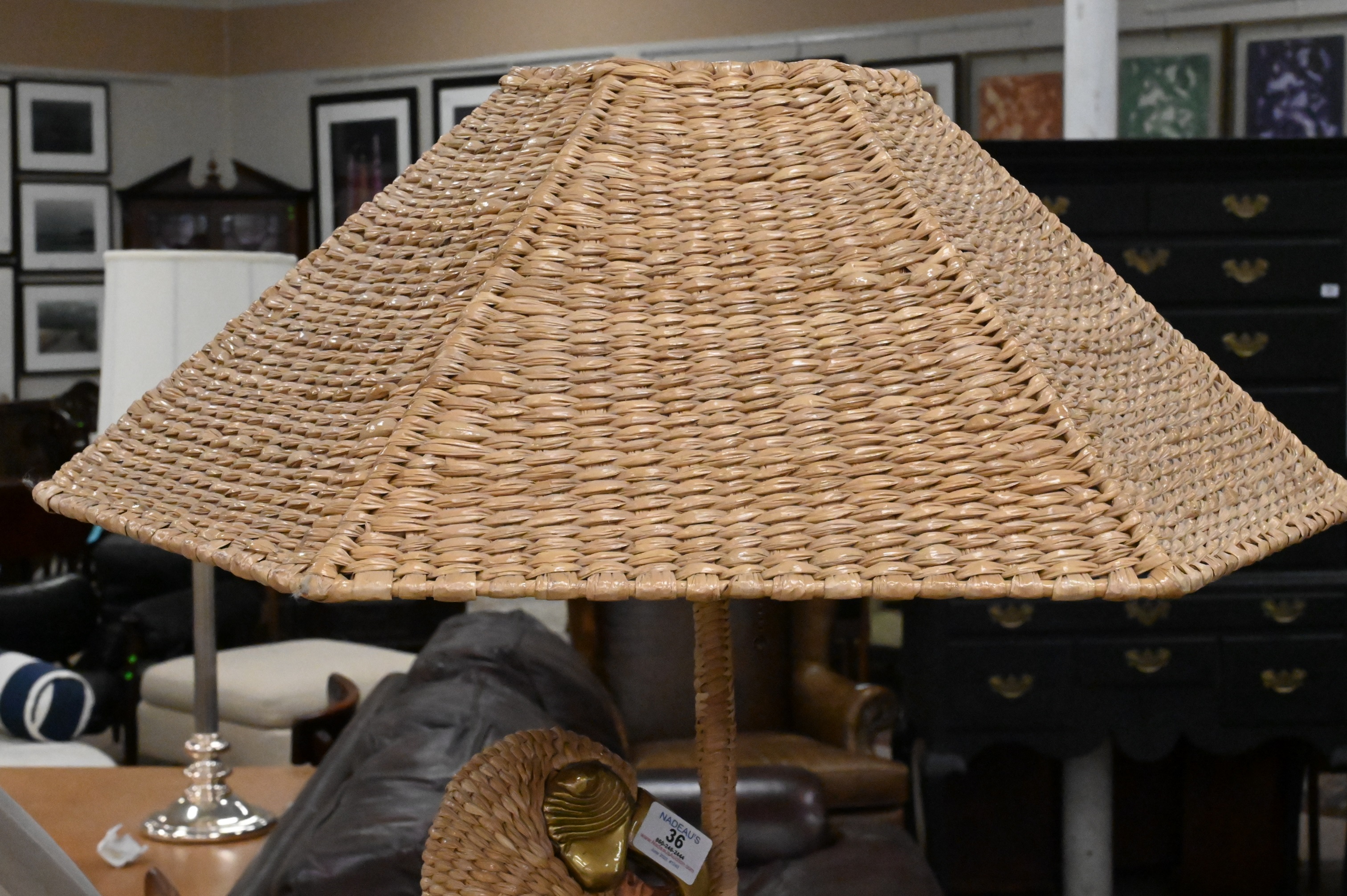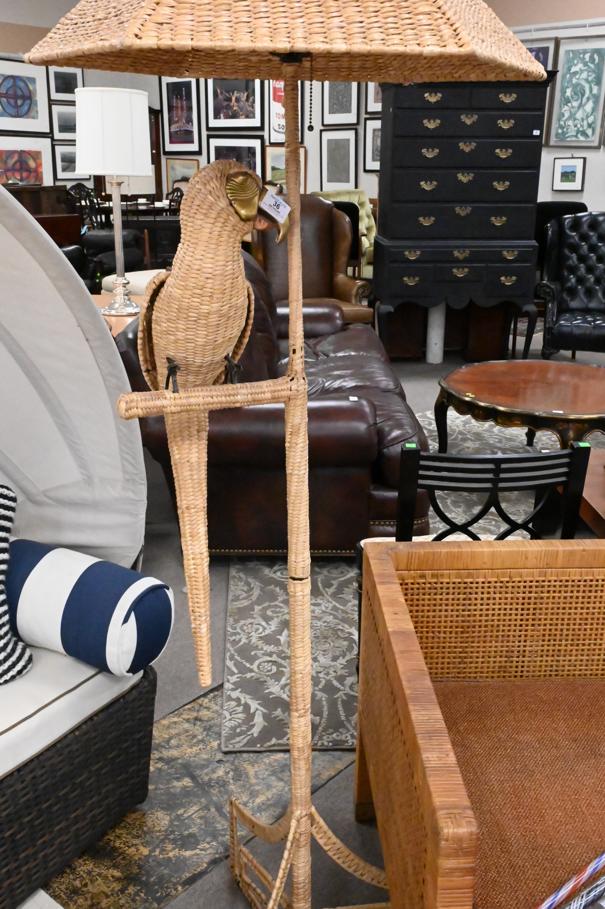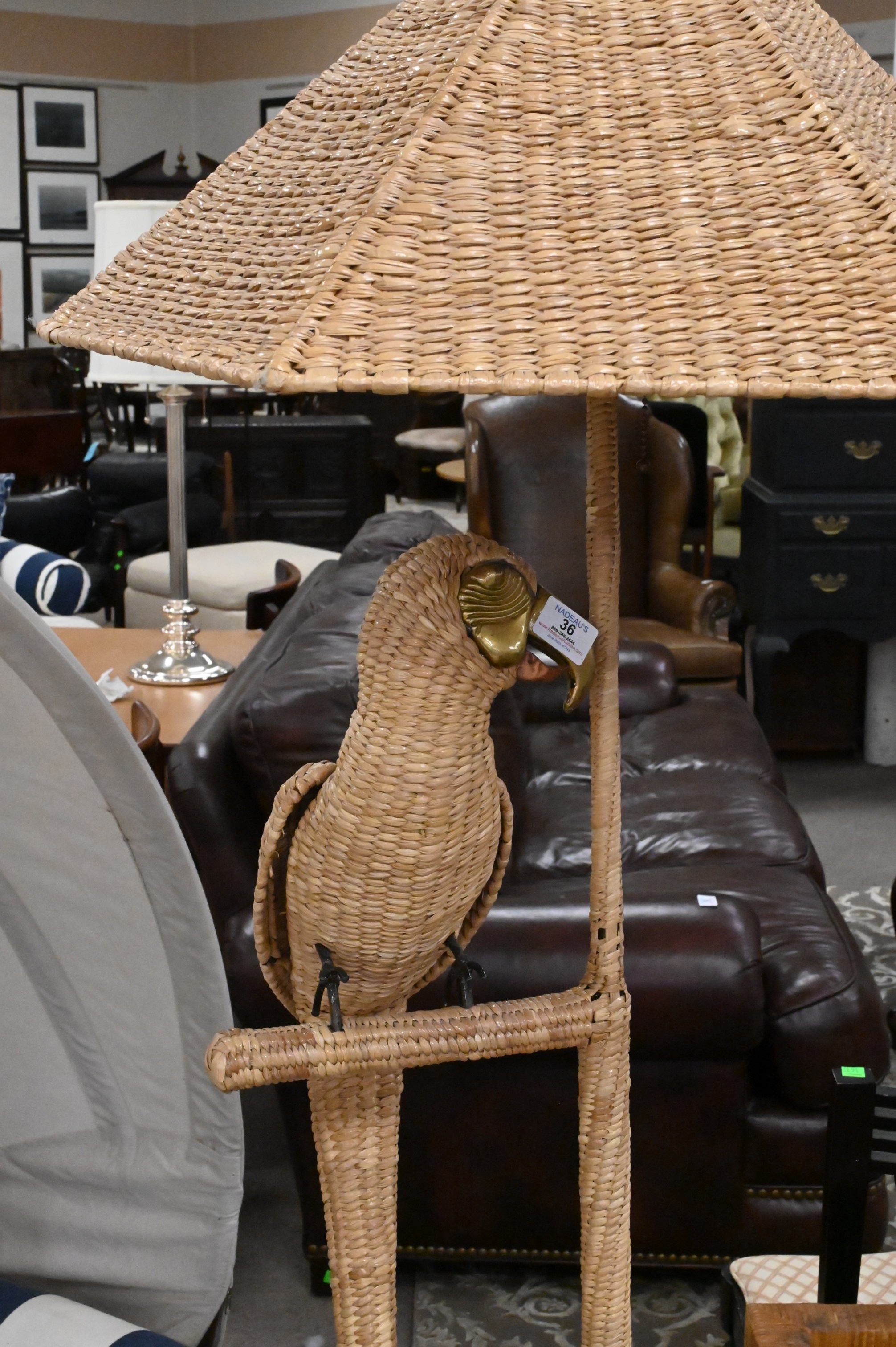 Mario Lopez Torres Parrot Floor Lamp, made from hand woven seagrass and metal accents, signature mark on base with date 1974, Mexico, height 67 1/2 inches, base 21 inches