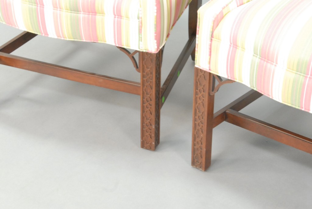Pair of custom mahogany Chippendale style upholstered armchairs.