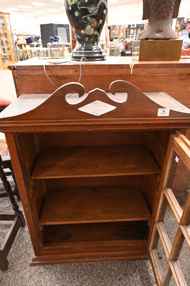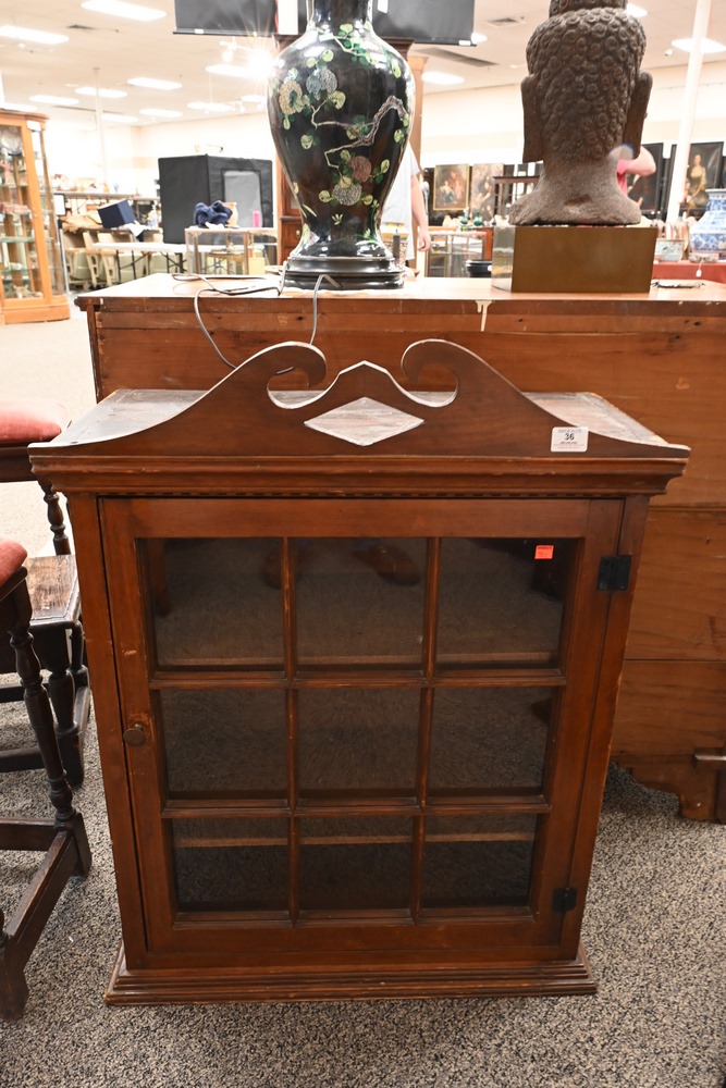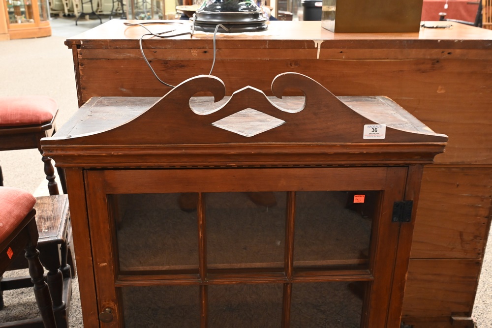 Lot 36: Primitive Cabinet having broken arch top over one door with recessed panel side height 36 1/2 inches, top 27 3/4 inches