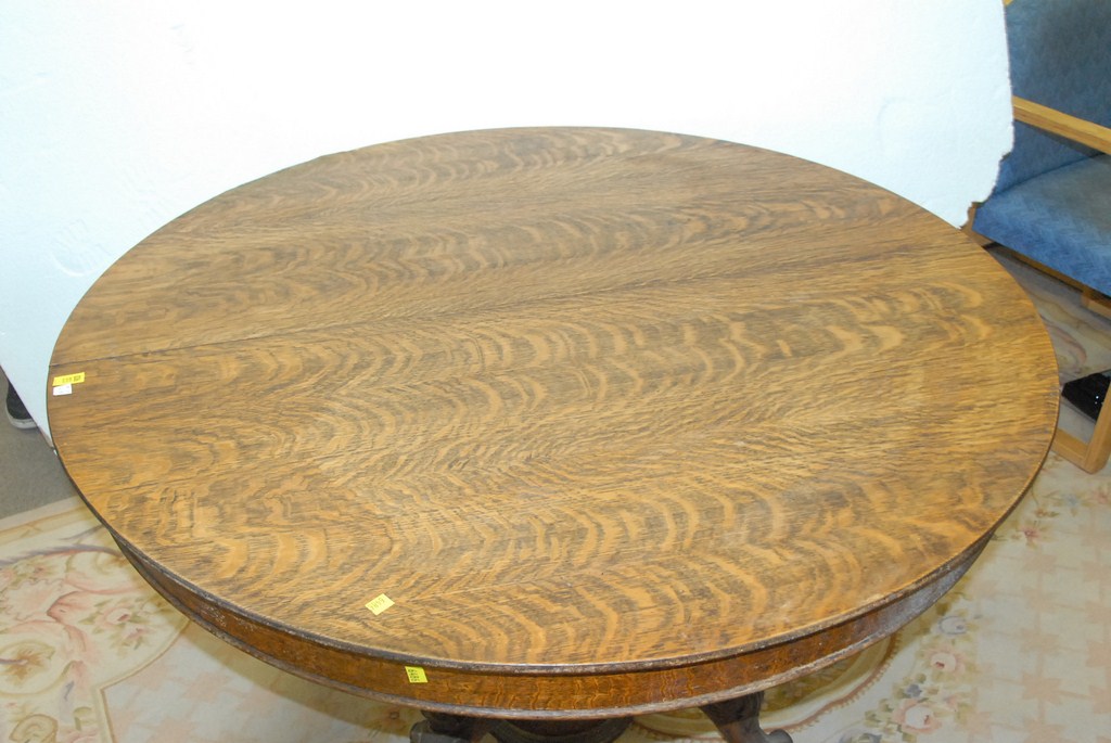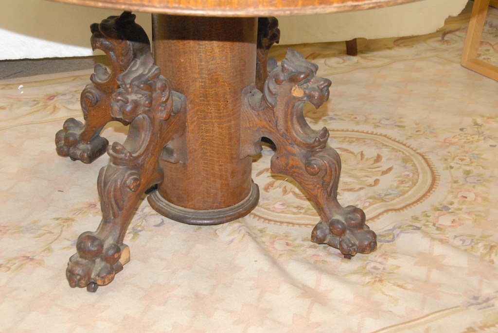 Round oak table with screaming lions and carved paw feet chip to one foot with two leaves.