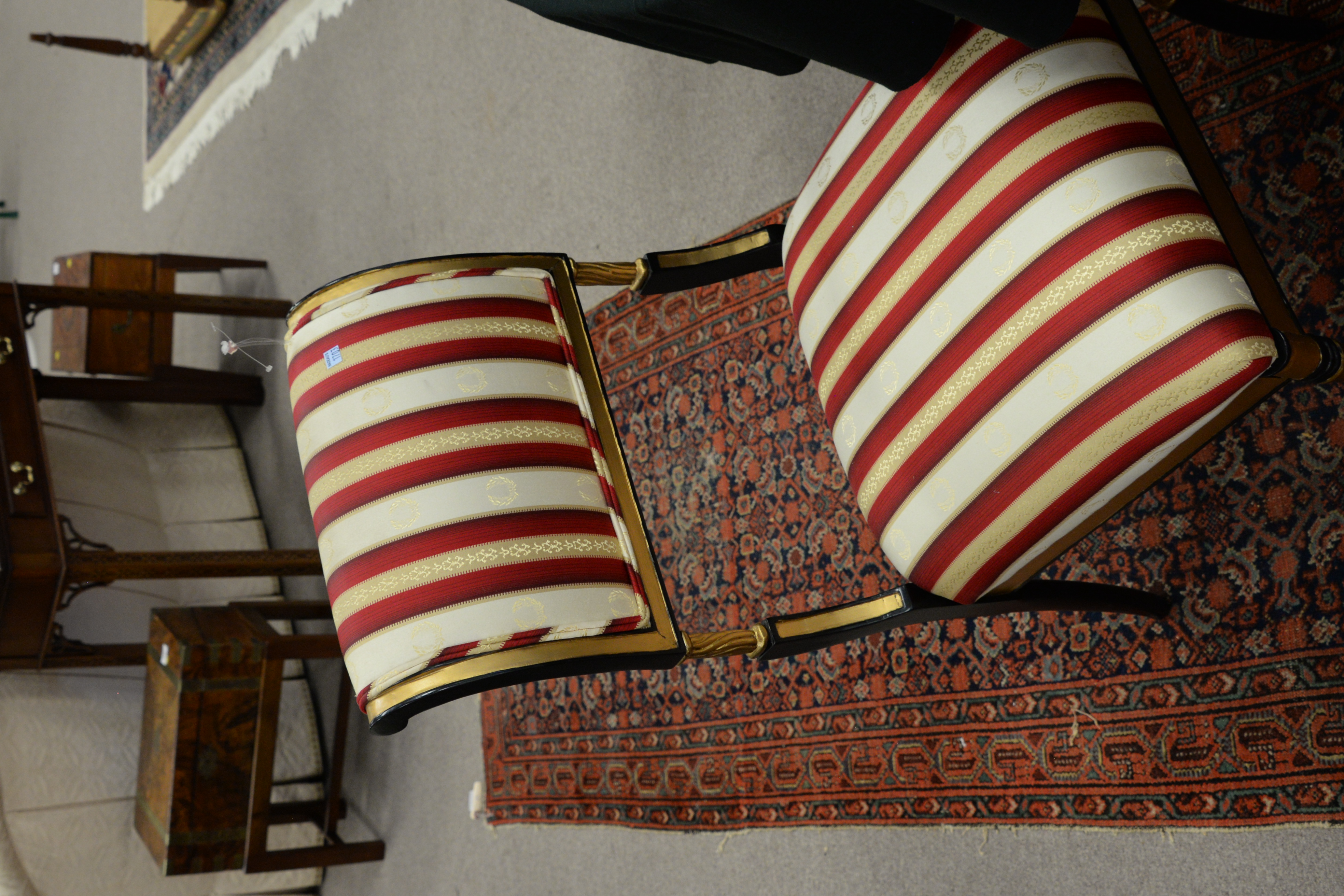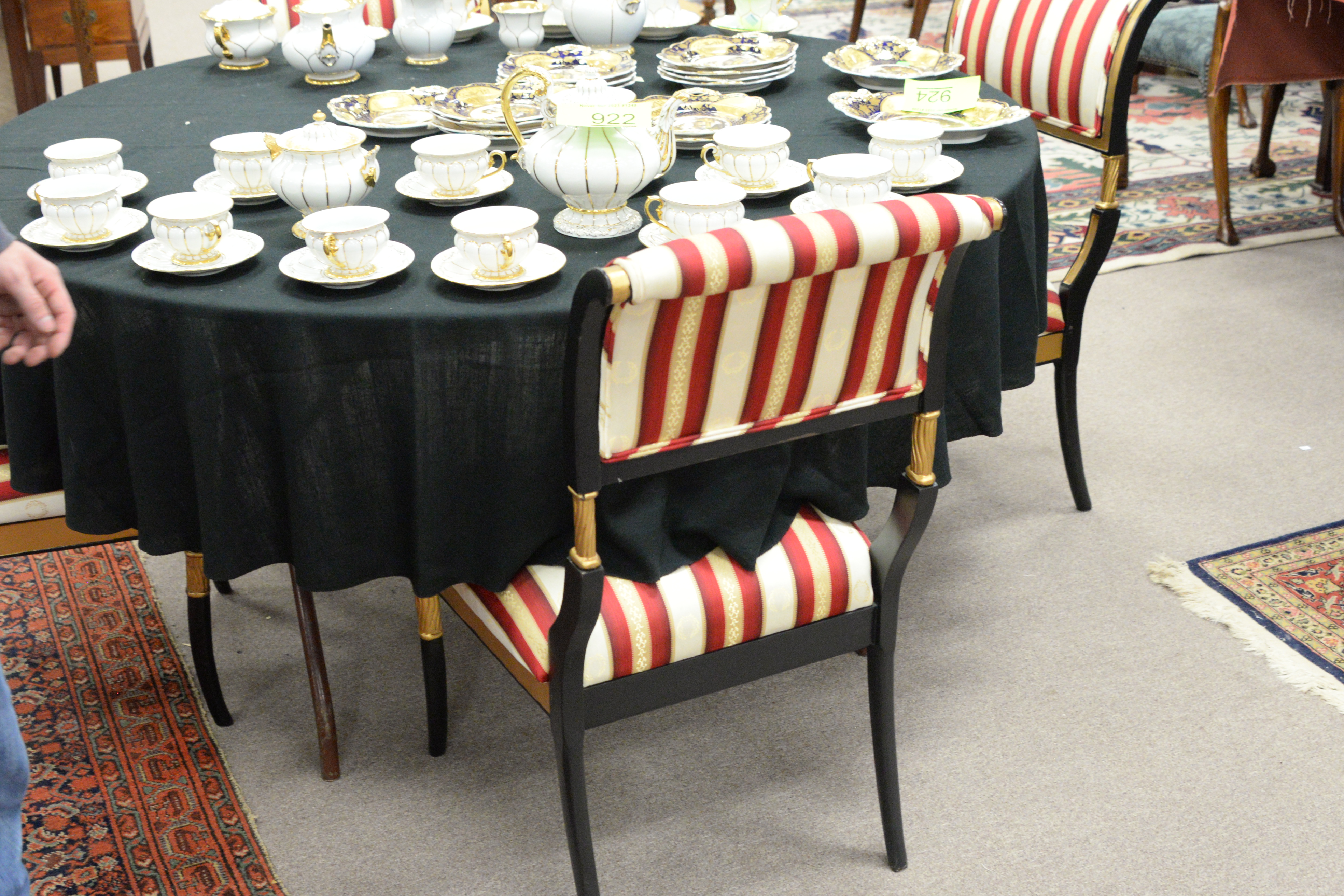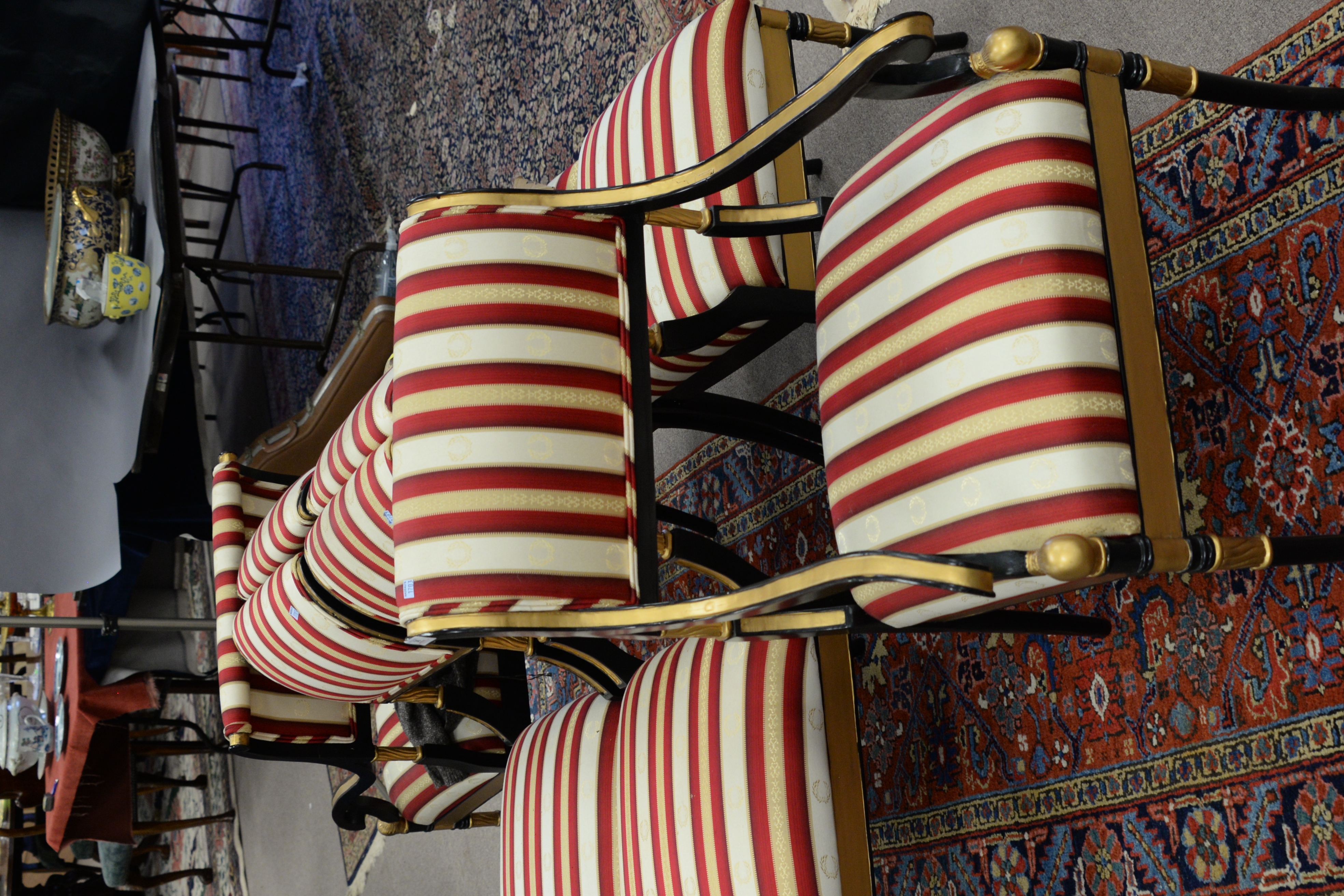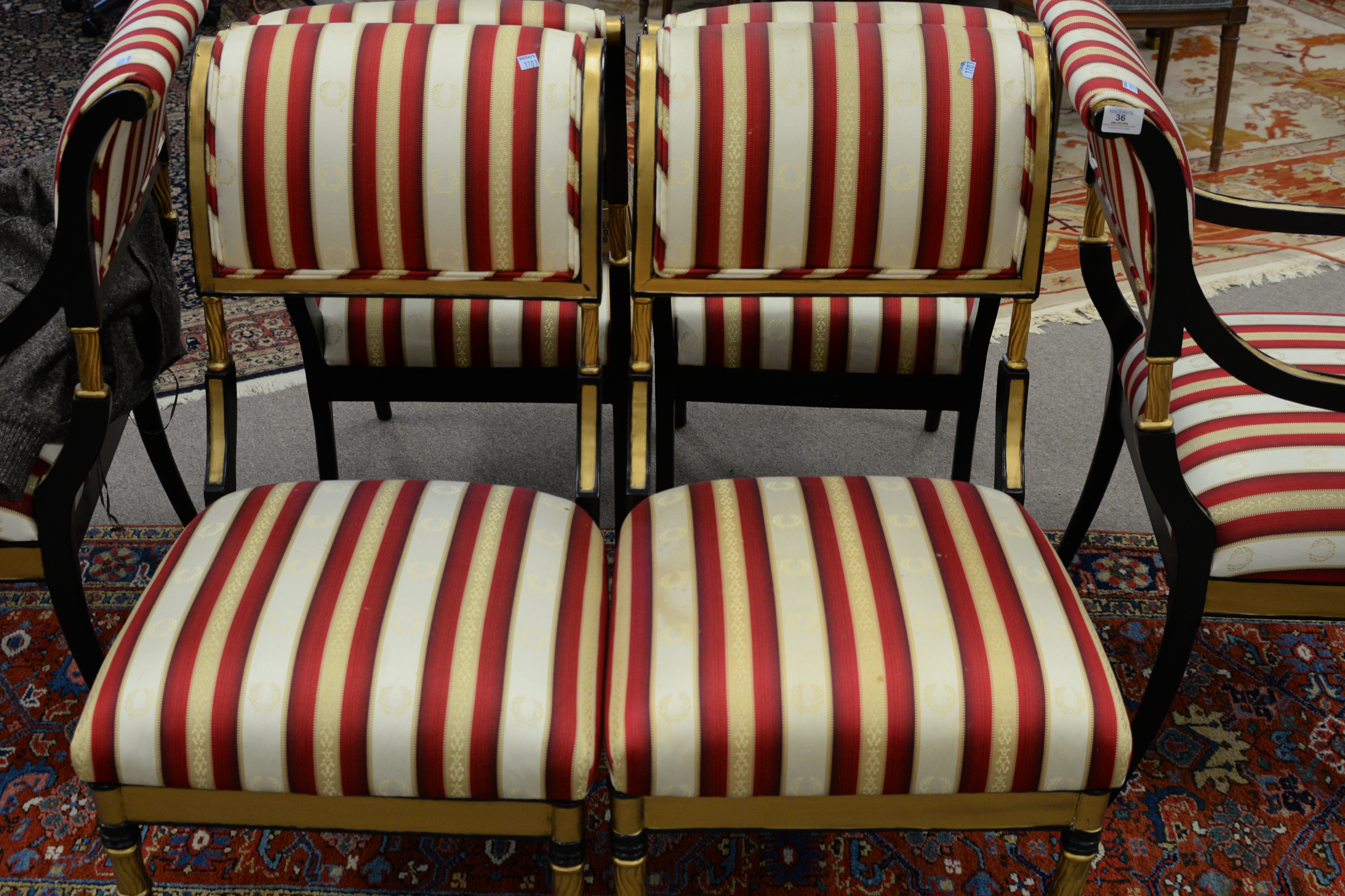 Set of 10 Custom Upholstered Dining Chairs, to include 2 arm and 8 side chairs all having gilt decorated frame, height 35 inches, width 22 inches