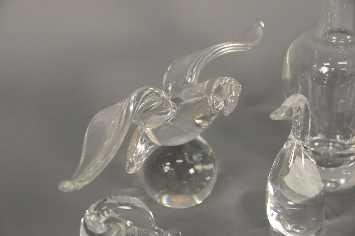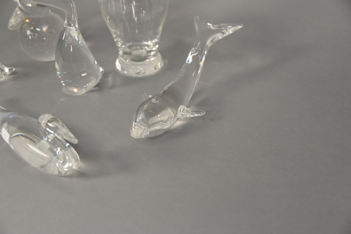 Lot 36: Six piece Steuben lot including 4 birds, dolphin, and vase. largest bird: wd. 13 in.