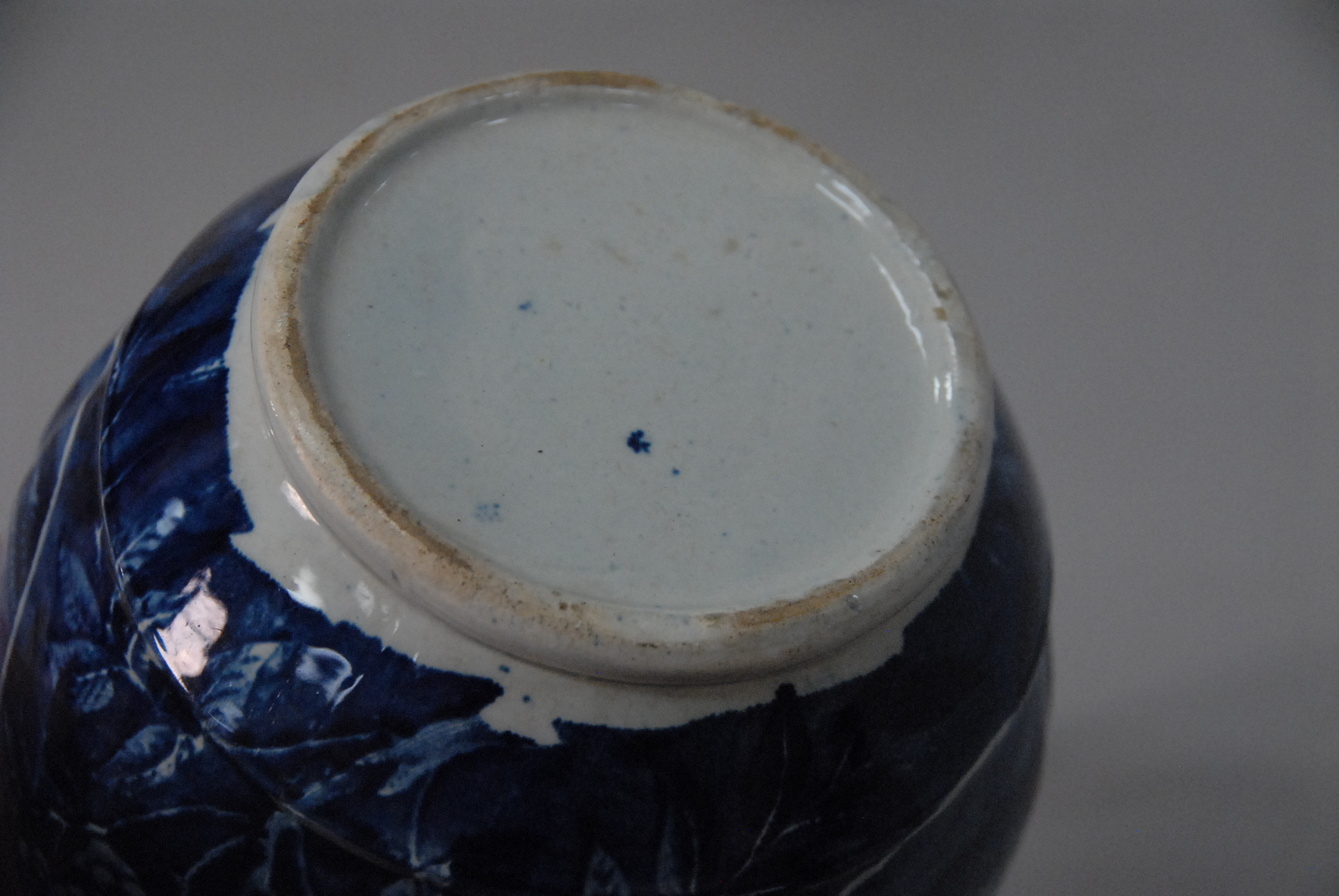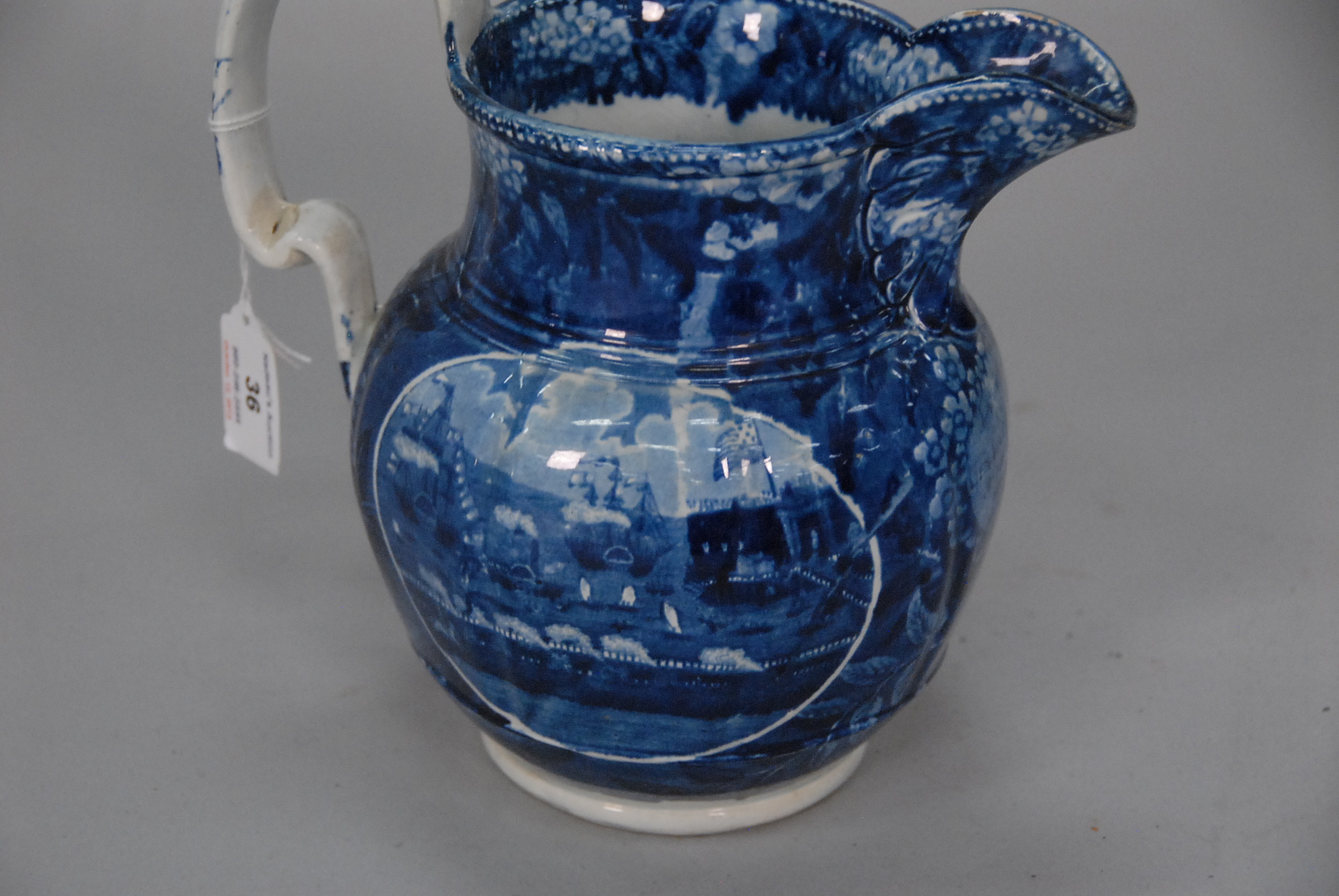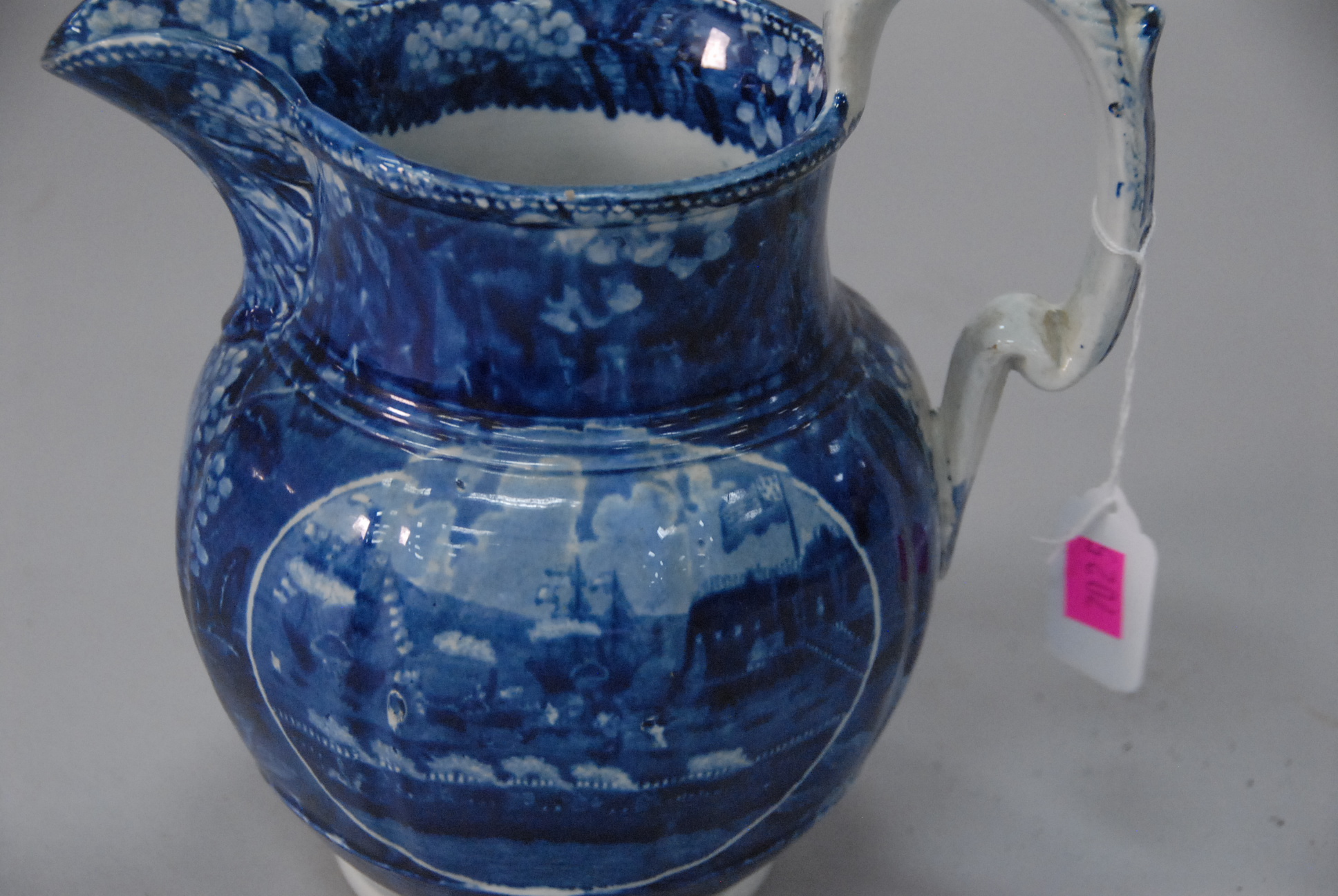 Lot 36: Staffordshire pitcher, Historic Blue depicting landing of Lafayette, excellent condition. ht. 9in.