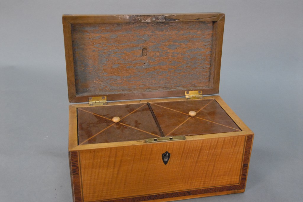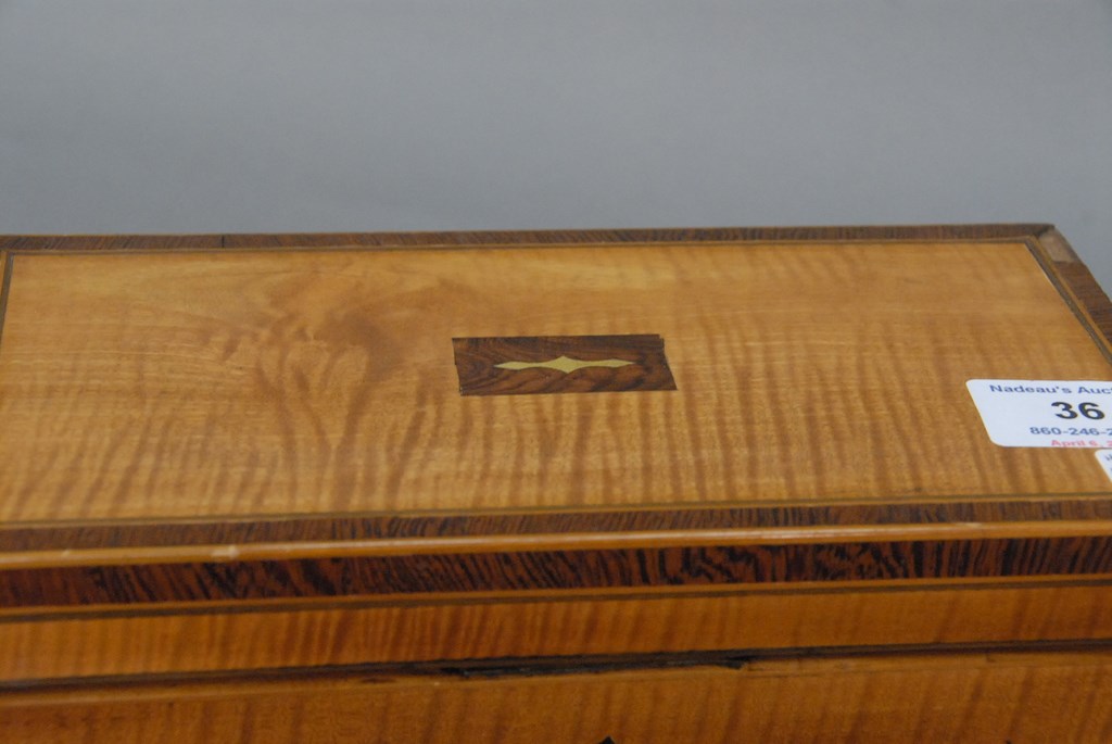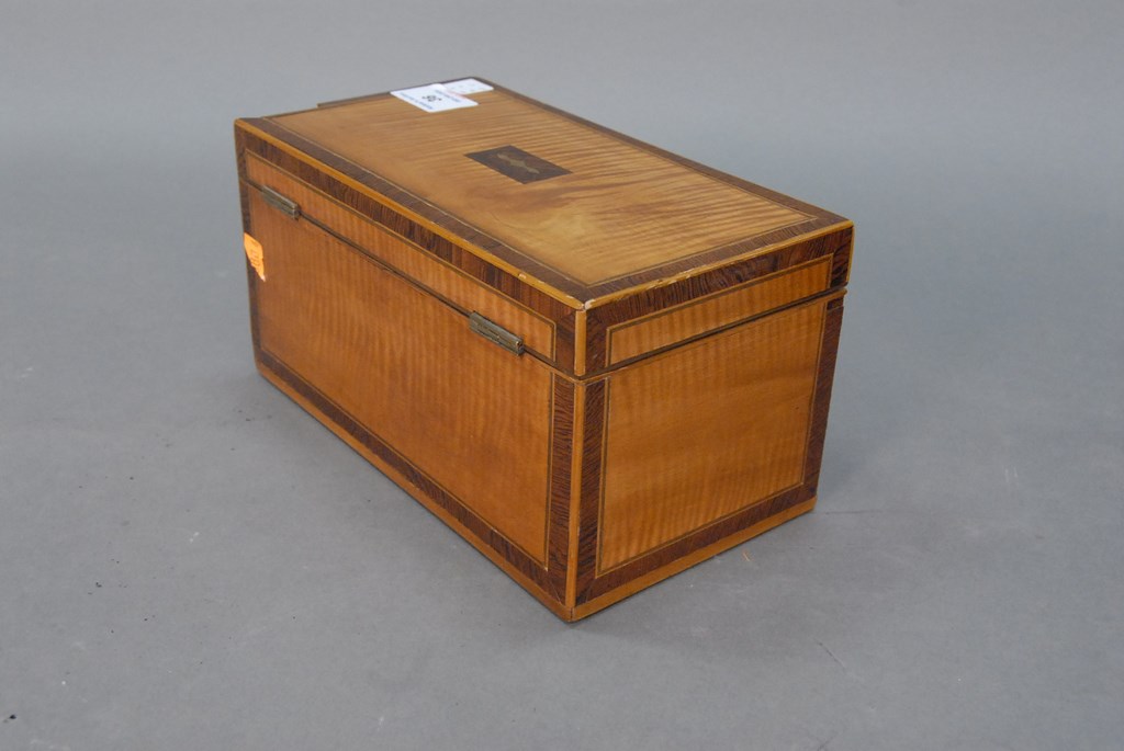Lot 36: Tea box with stripe figured wood panels surrounded by rosewood and line inlays, interior with two covered compartments. ht. 5in. wd…
