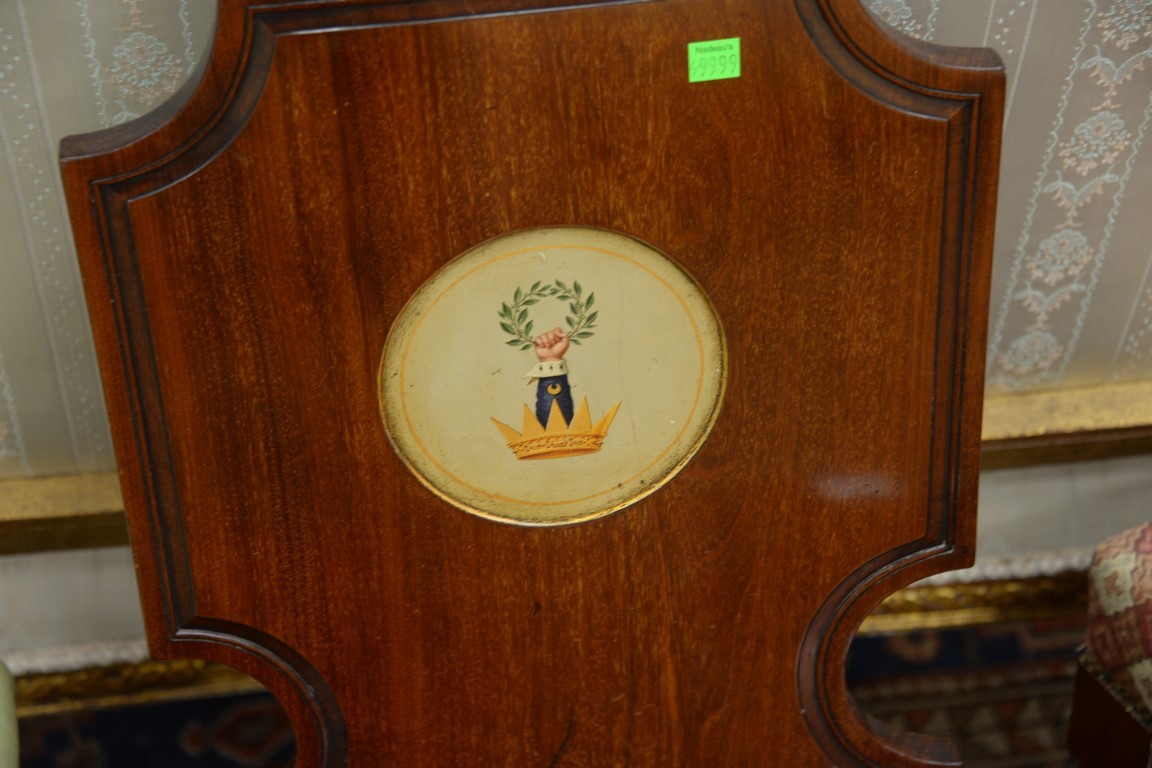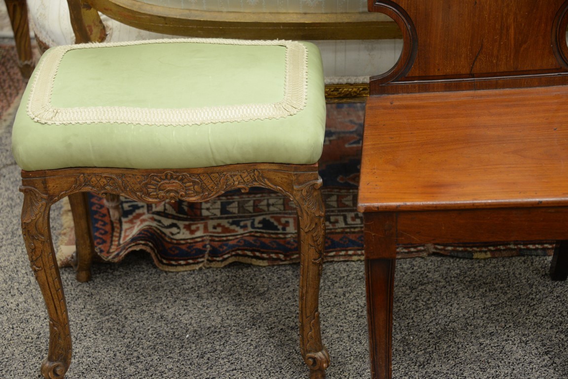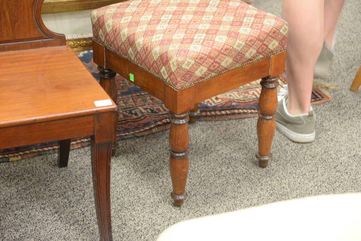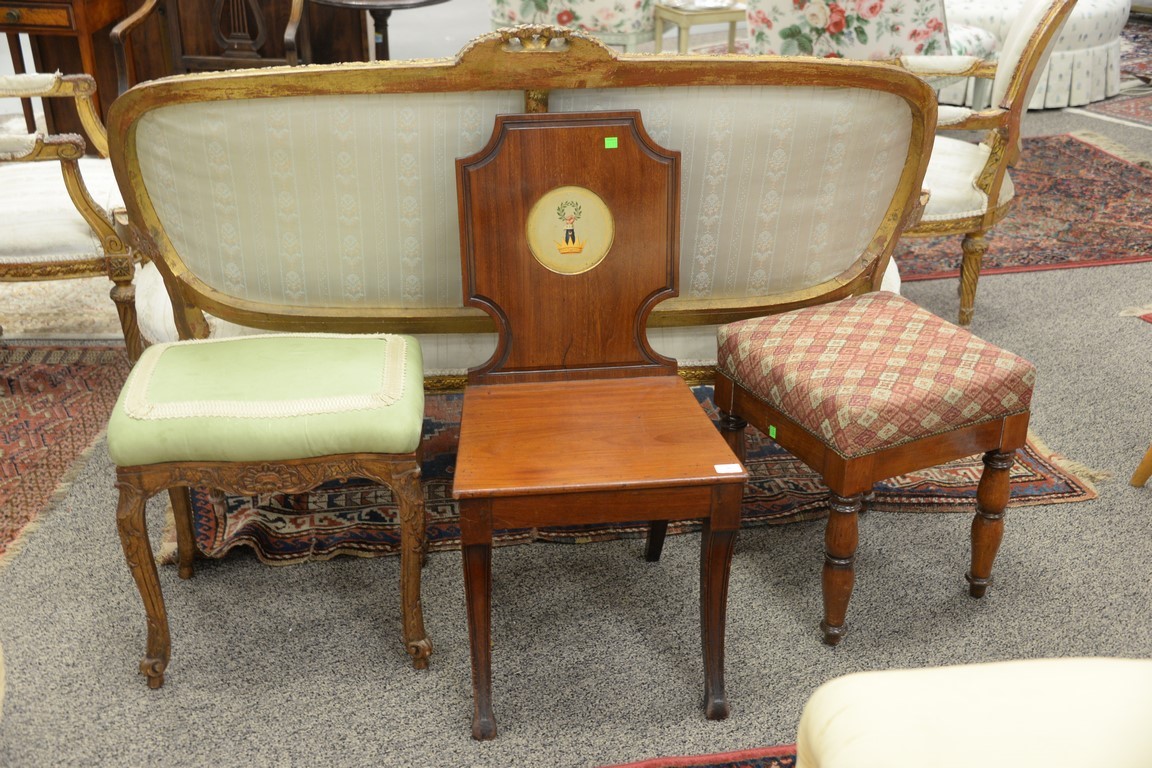 Lot 36: Three piece lot including mahogany chair with hand painted panel and two foot stools. ht. 19in.