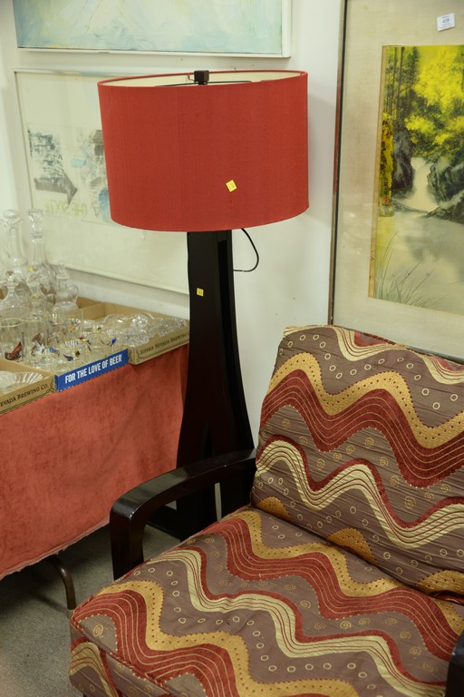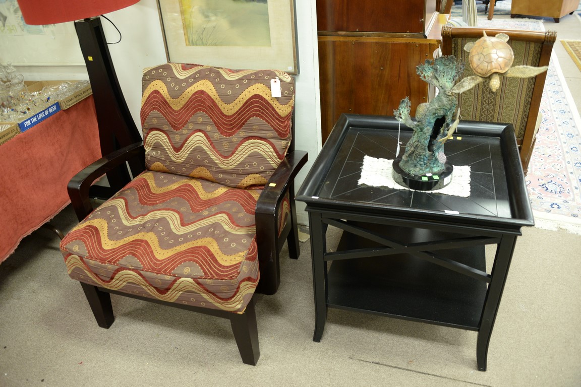 Lot 36: Three piece lot to include armchair, table, and floor lamp. table: ht. 27in., top: 28 x 28