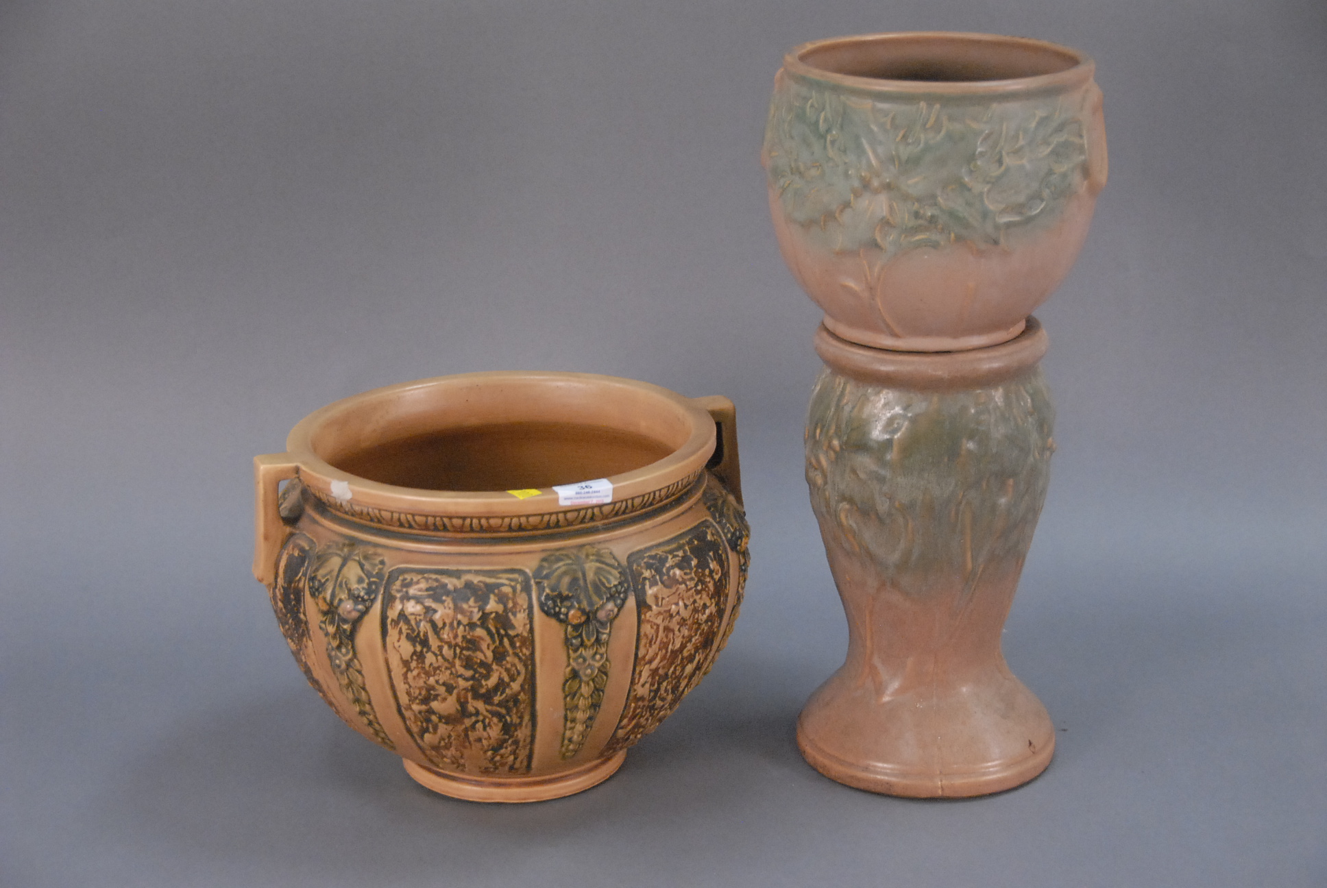 Lot 36: Two piece lot to include Roseville jardinire small flake ht. 10in. and pottery jardinire ht. 20in. with pedestal