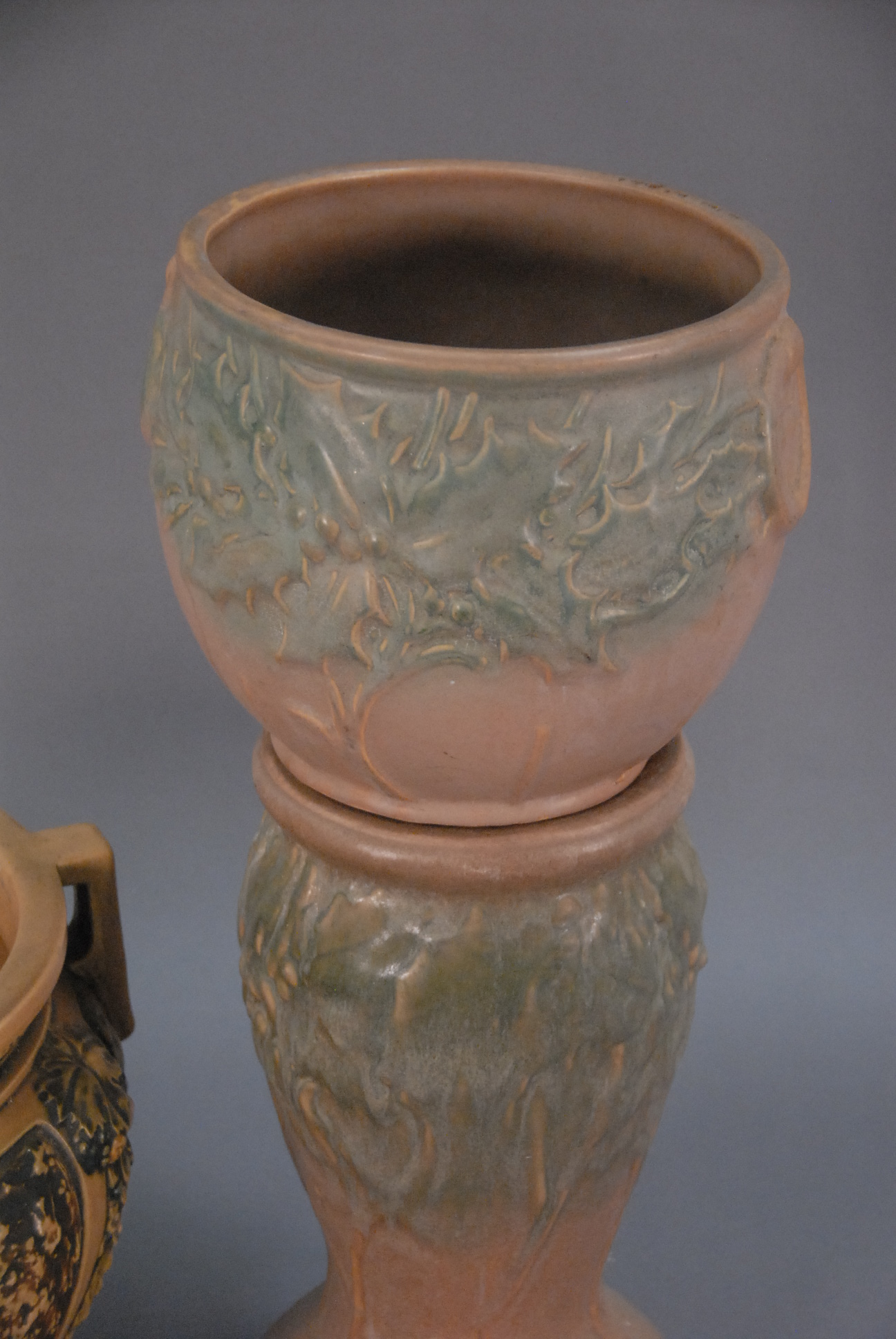 Two piece lot to include Roseville jardinire small flake ht. 10in. and pottery jardinire ht. 20in. with pedestal