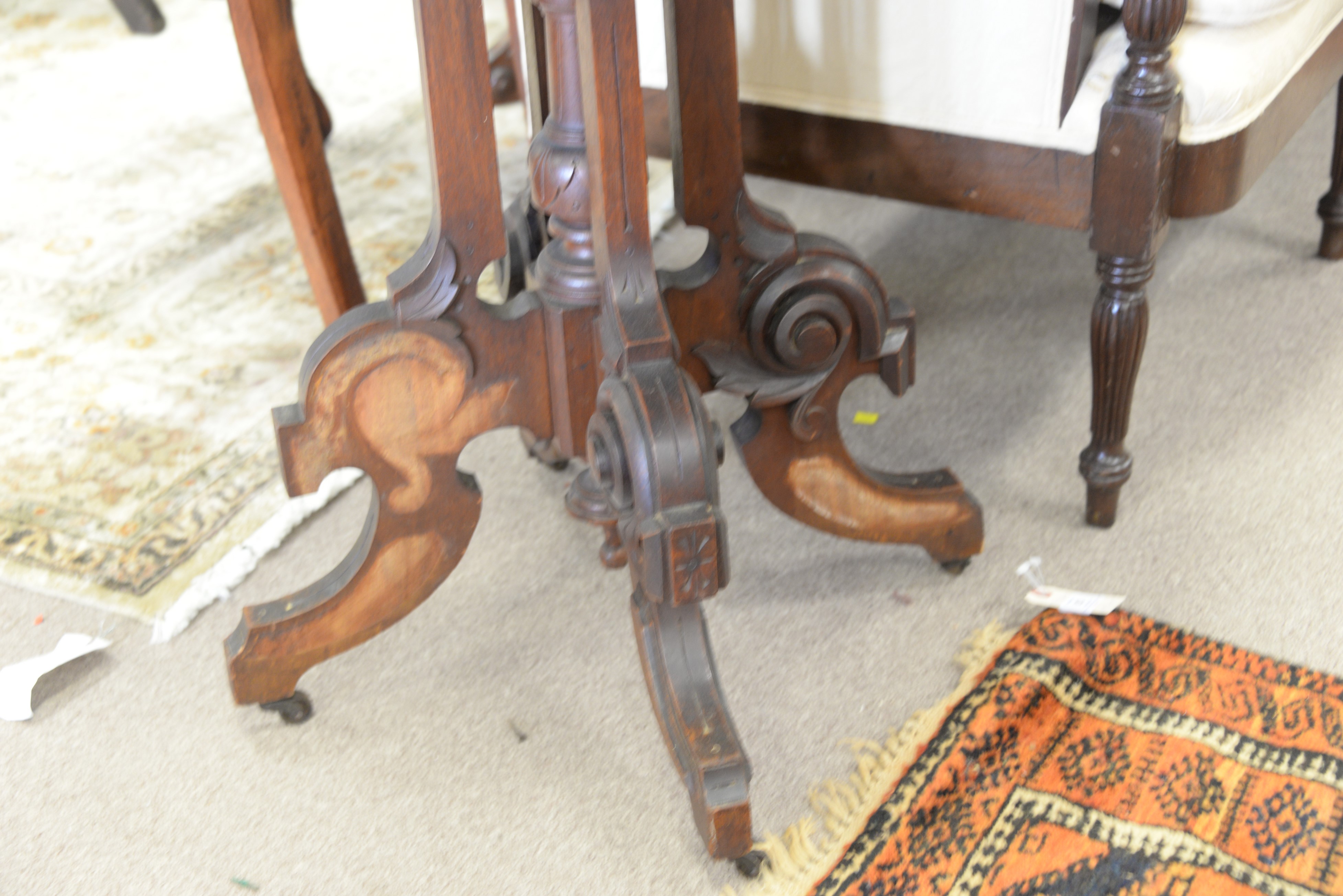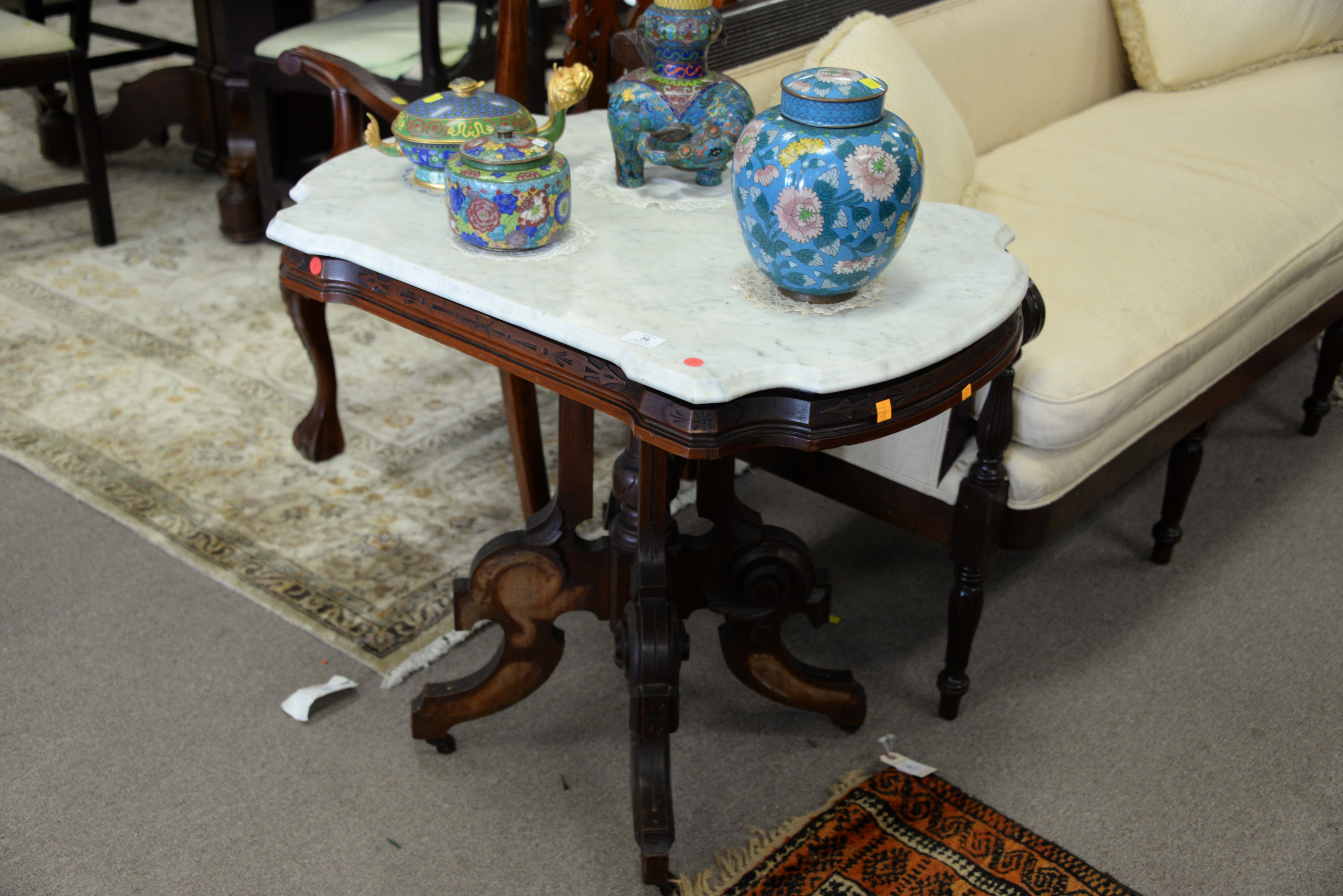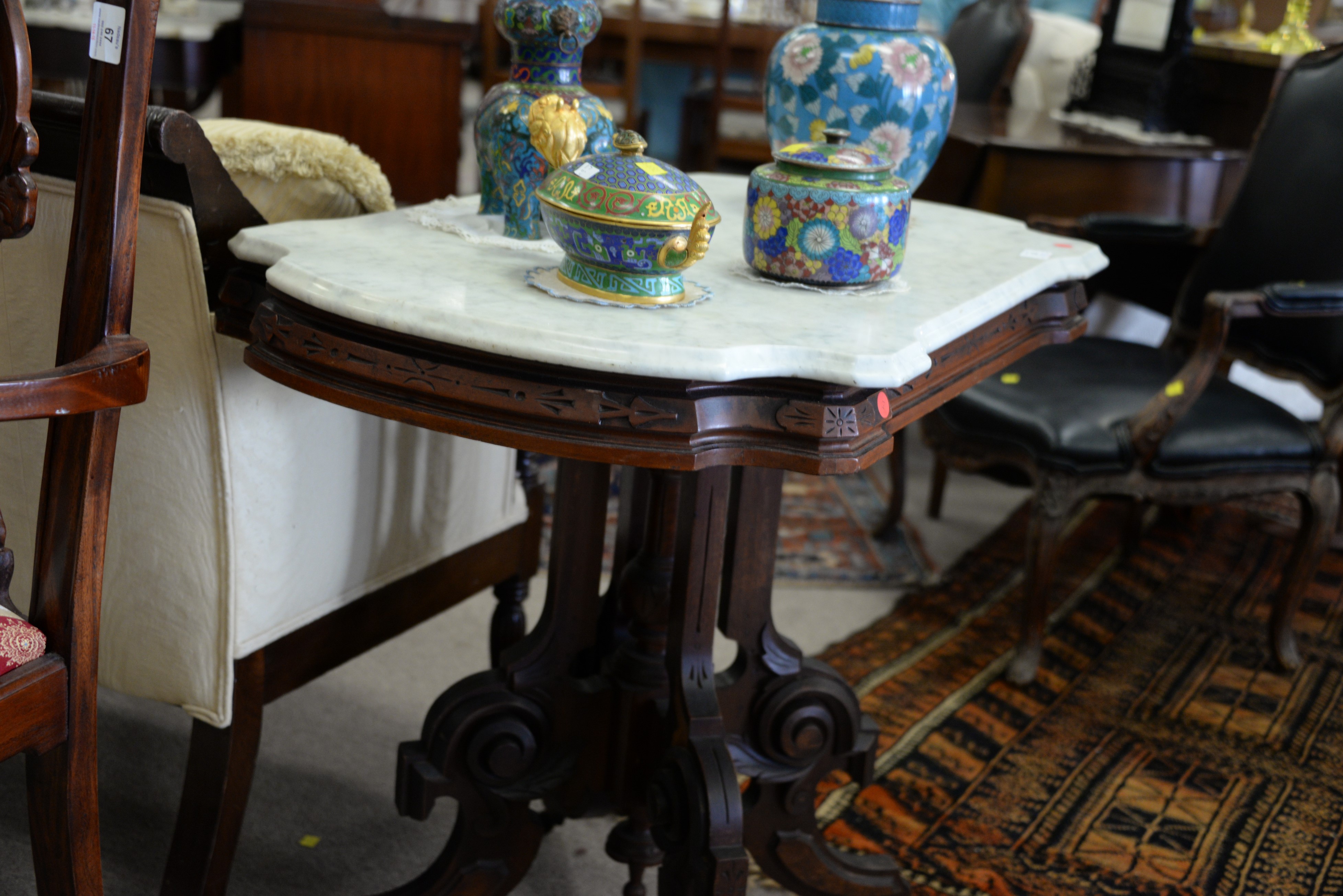 Victorian walnut marble top table with shaped top. ht. 30 in. wd. 34 in. dp. 21 1/2 in.