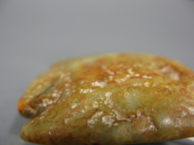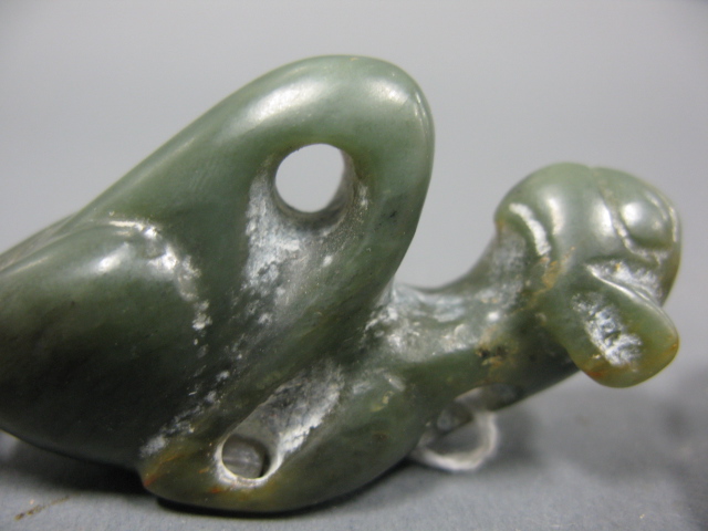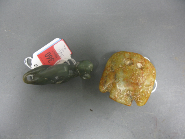 Carved green jade bat in hanging position along with a carved stone celadon with russet colored pendent.