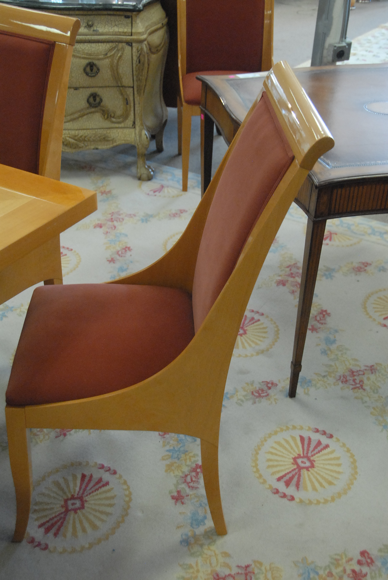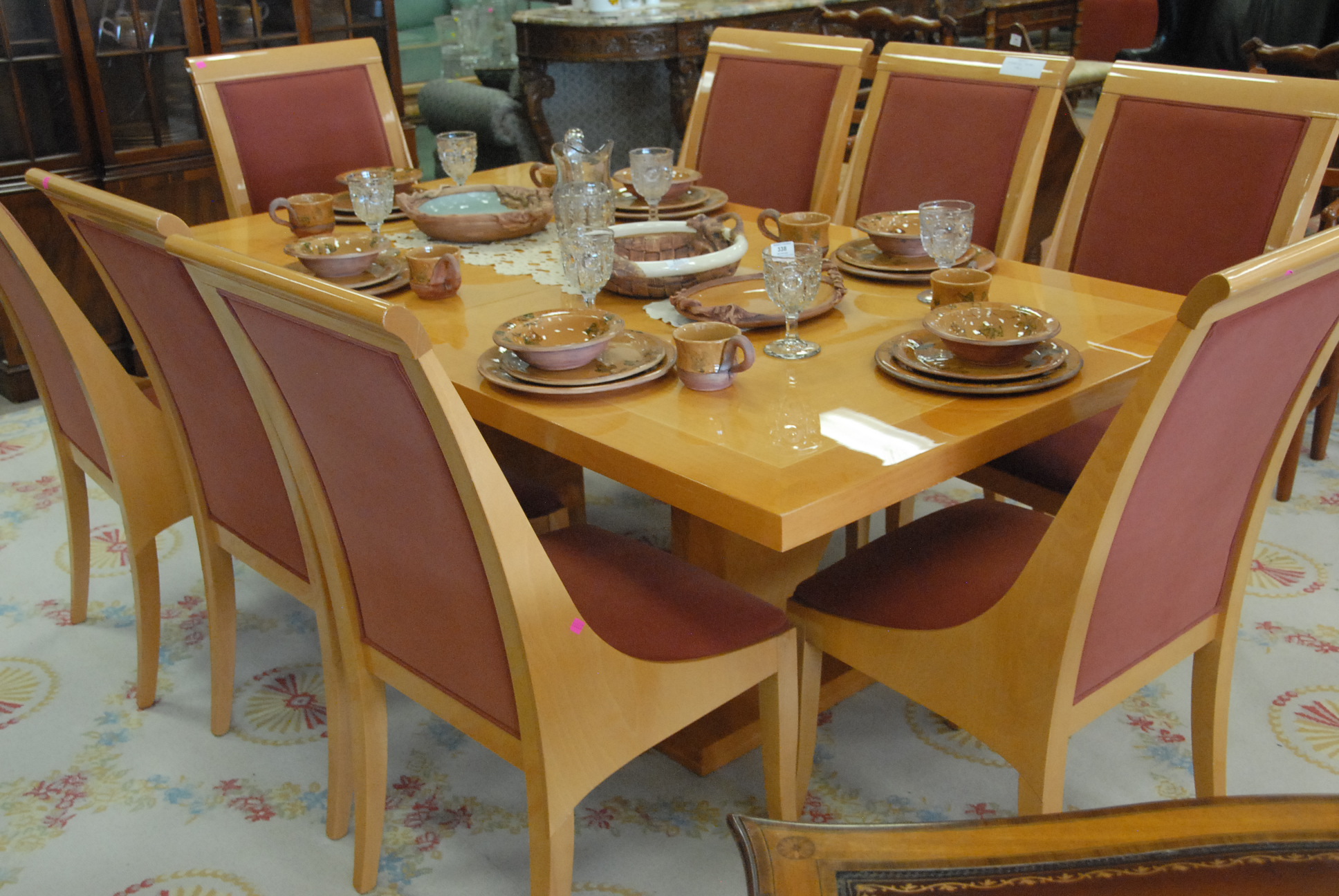 Costantini Pietro eleven piece dining set including ten chairs and a table with one 20 leave in like new condition, signed Costantini Pietro Italy new price over 30,000, ht. 30 in. top: 43 1/2 x 79 opens to 99 in.