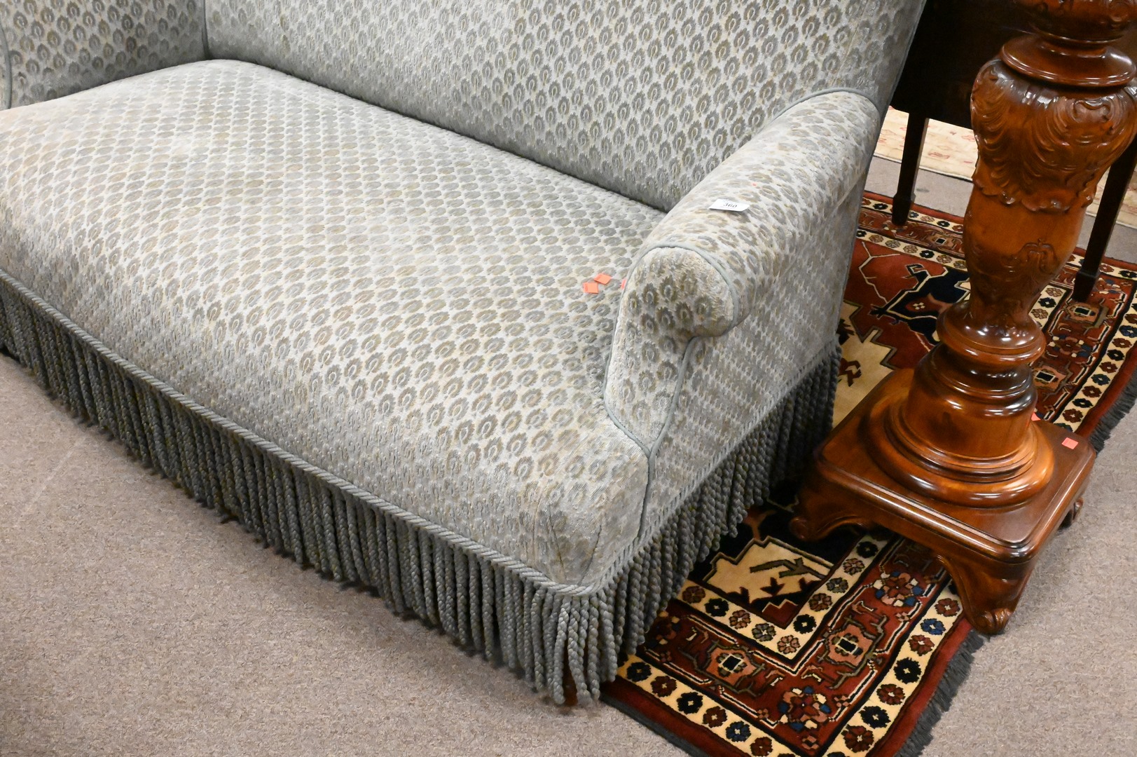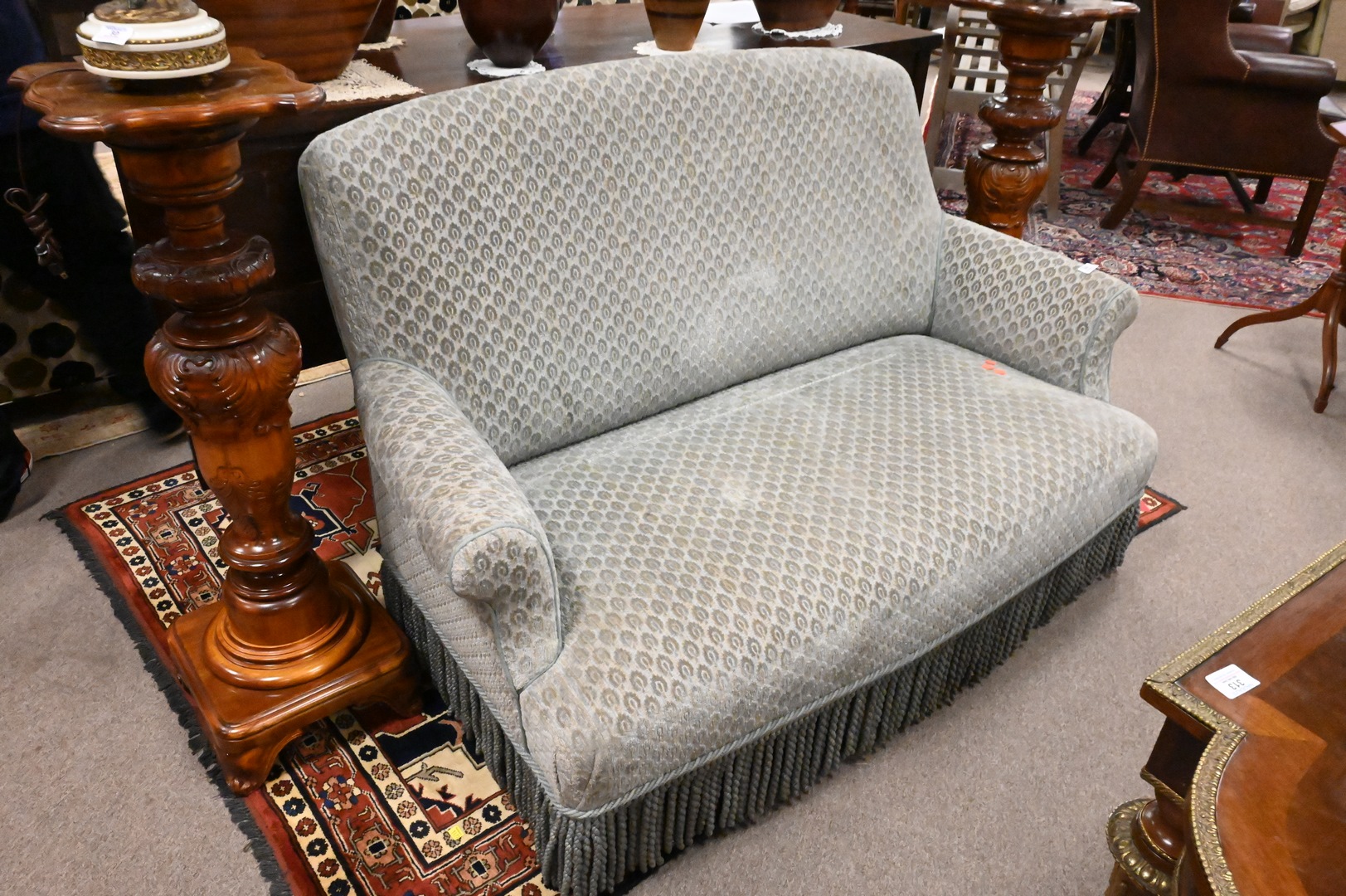Custom Upholstered Loveseat, having fringed skirt, height 36 inches, length 58 inches.