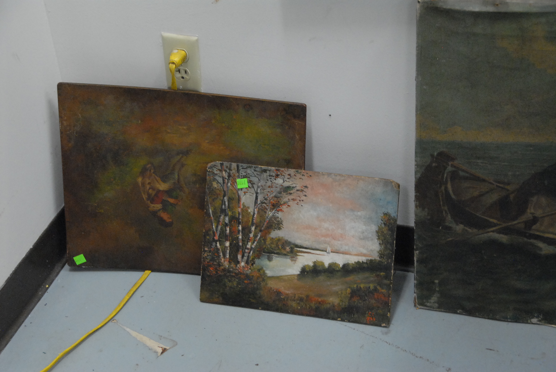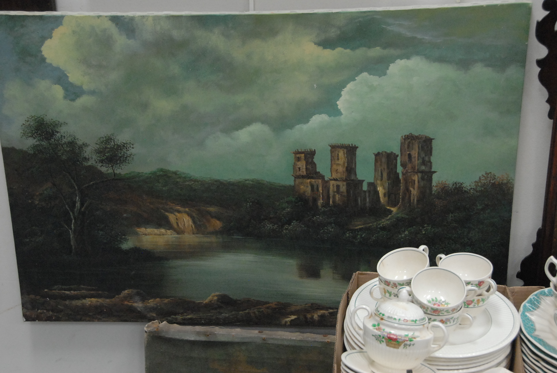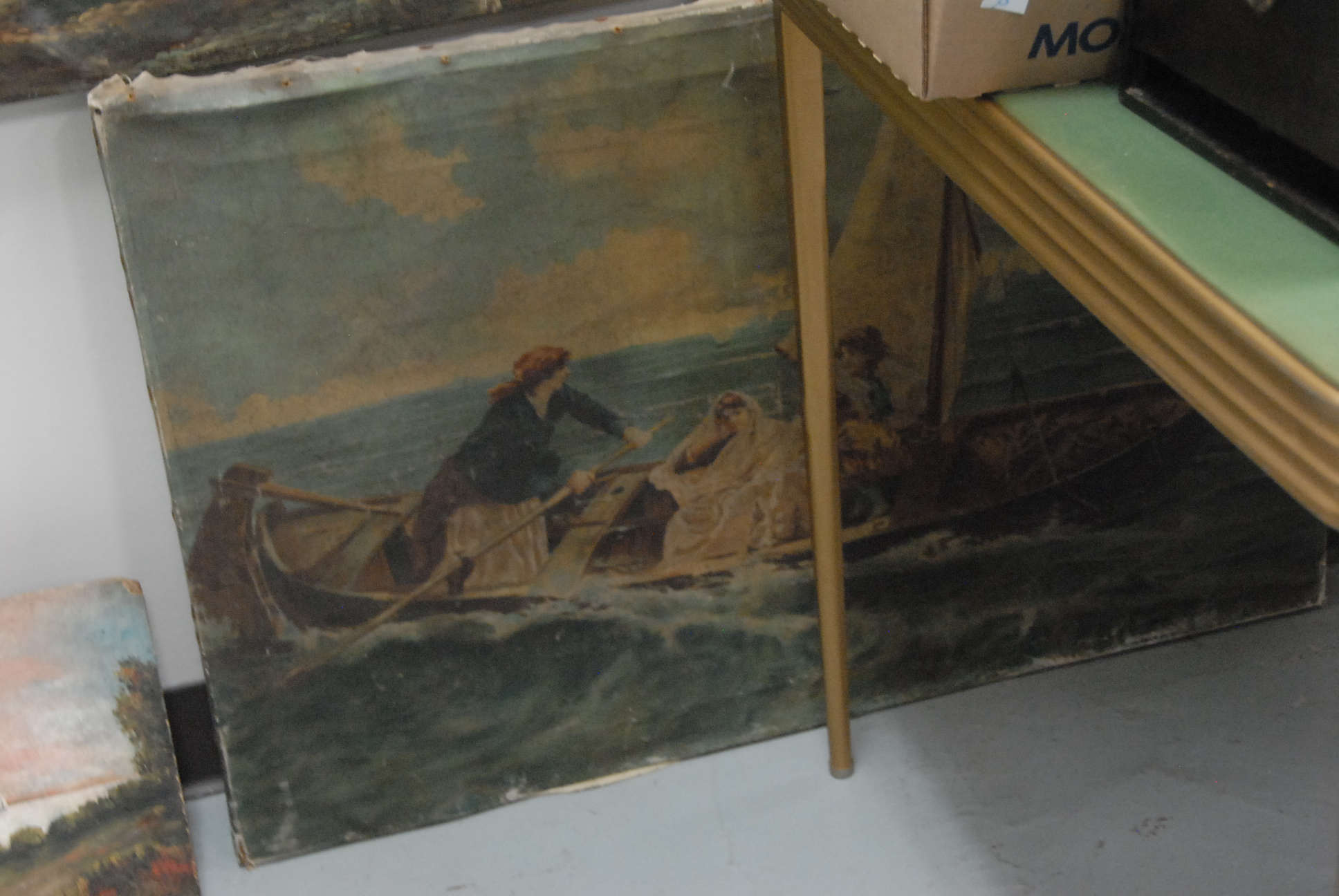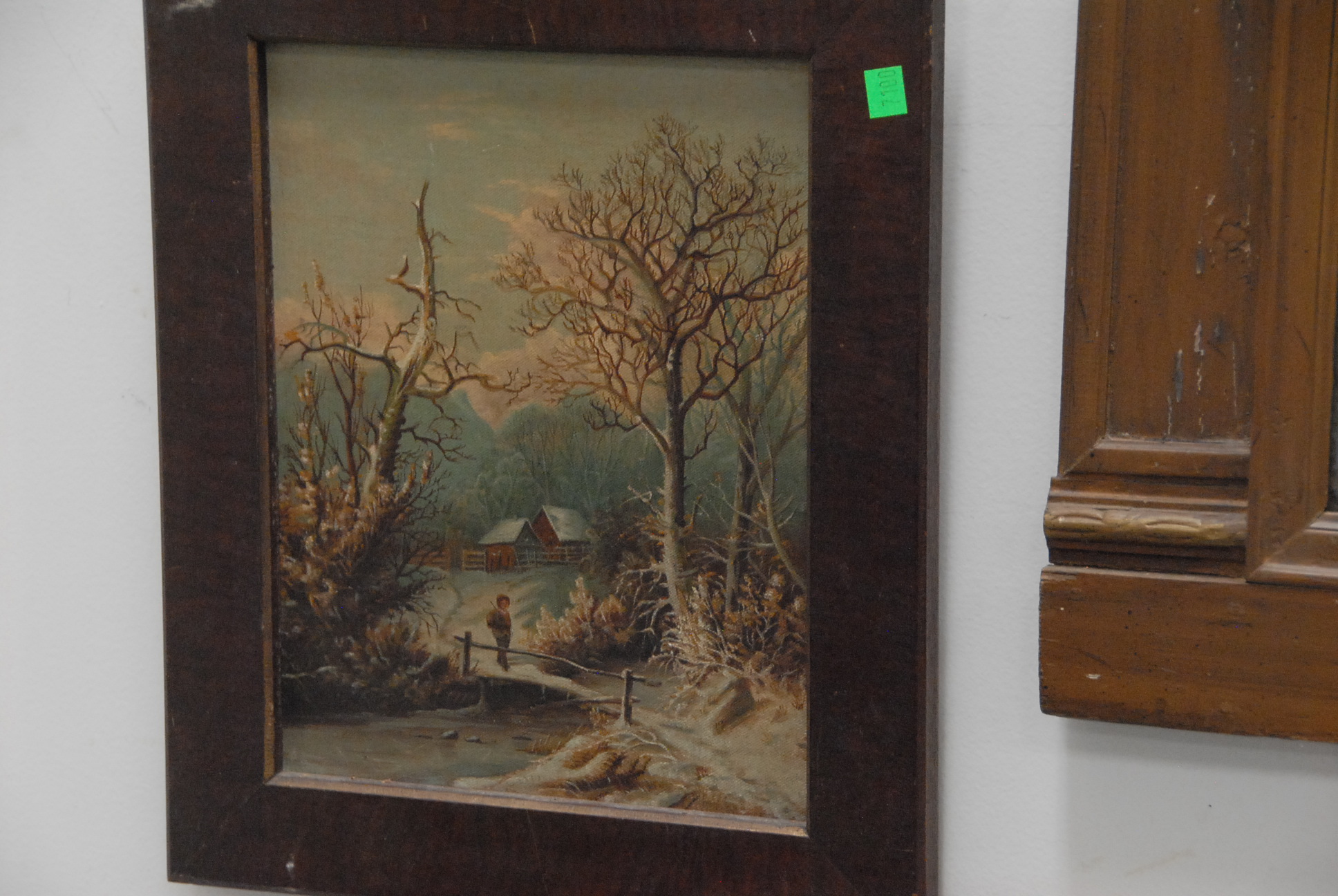 Lot 360: Group of eight paintings to include two large unframed, a framed winterscape, Roselyn vase, two landscapes, and a mirror with hunt p…