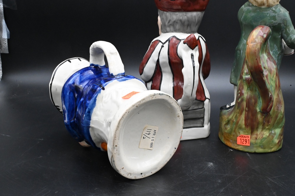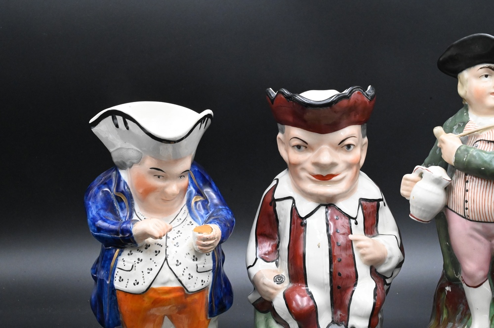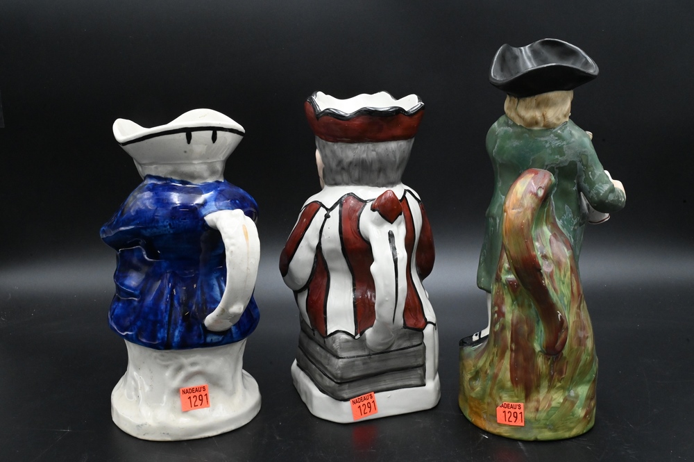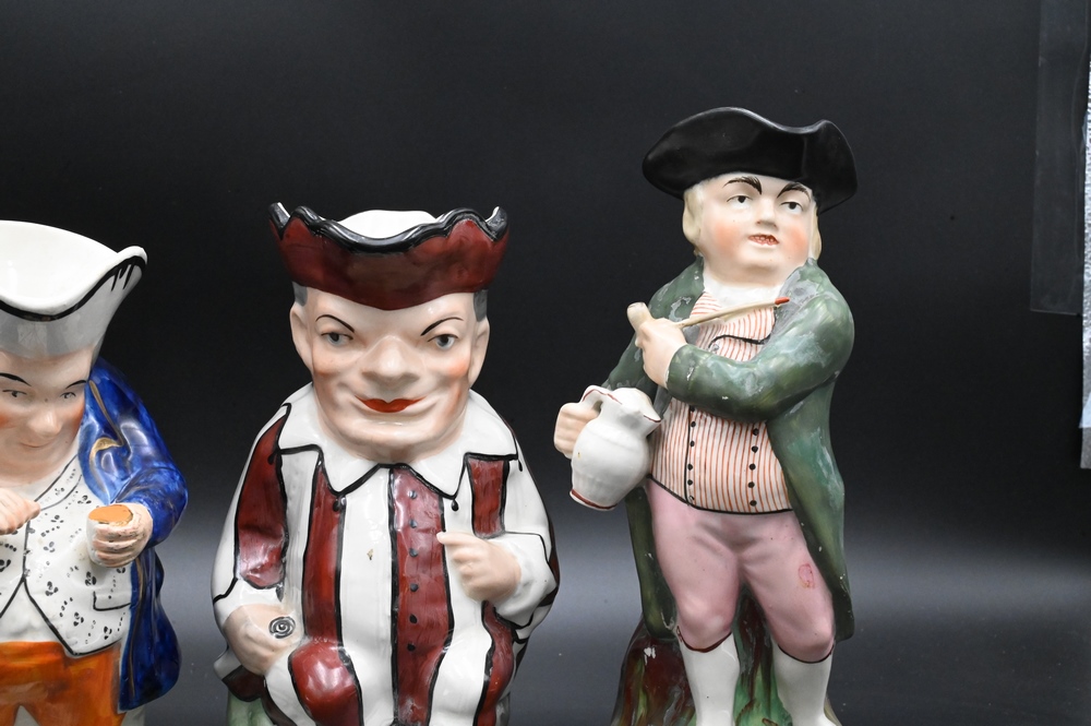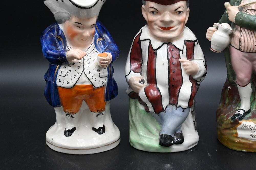 Group of Three Staffordshire Toby Jugs, jester, hearty good fellow, and snuff tanker, tallest 11 1/4 inches.