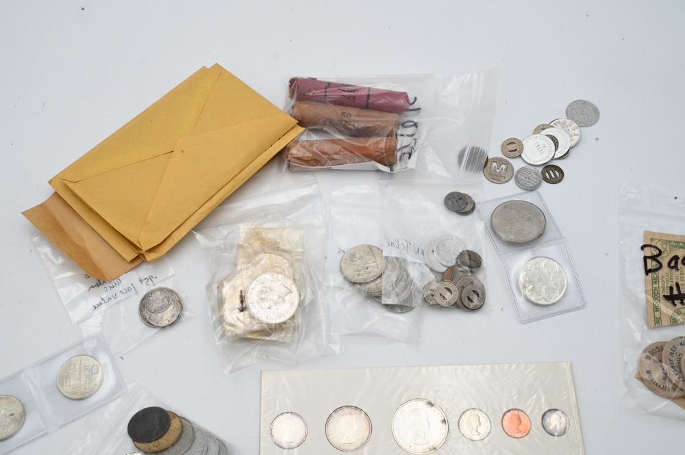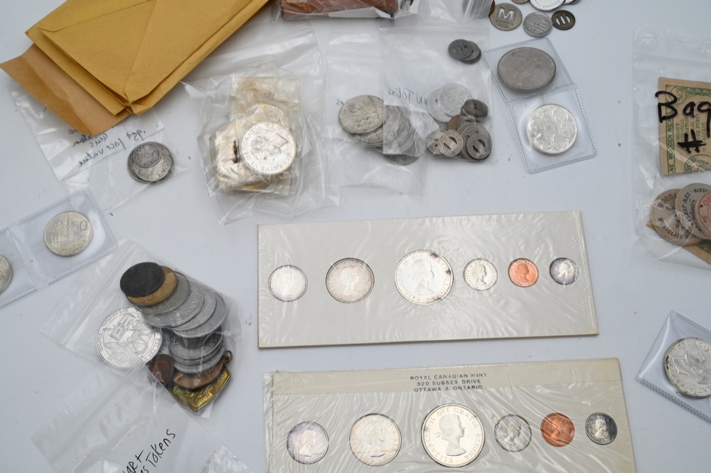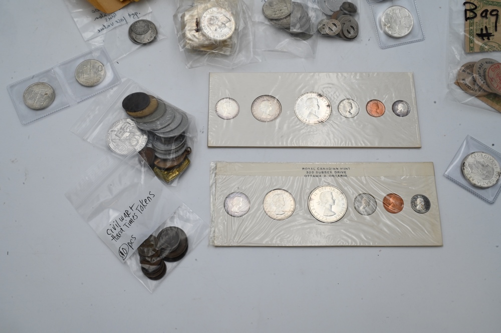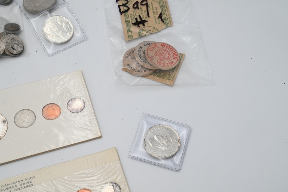 Lot of Coins, to include 1961, 1962, 1963, (2) 1965, (3) 1966, 1959, 1960, 1964, Canadian proof sets; along with foreign silver coins; wooden nickels; Civil War Hard Times tokens; along with three rolls of pennies.