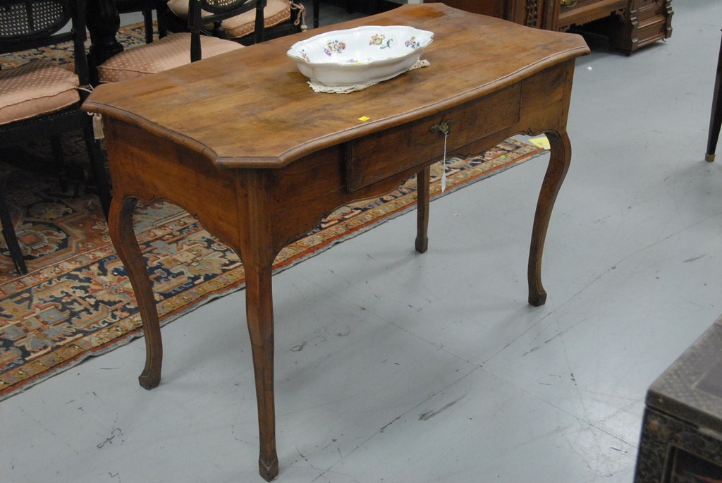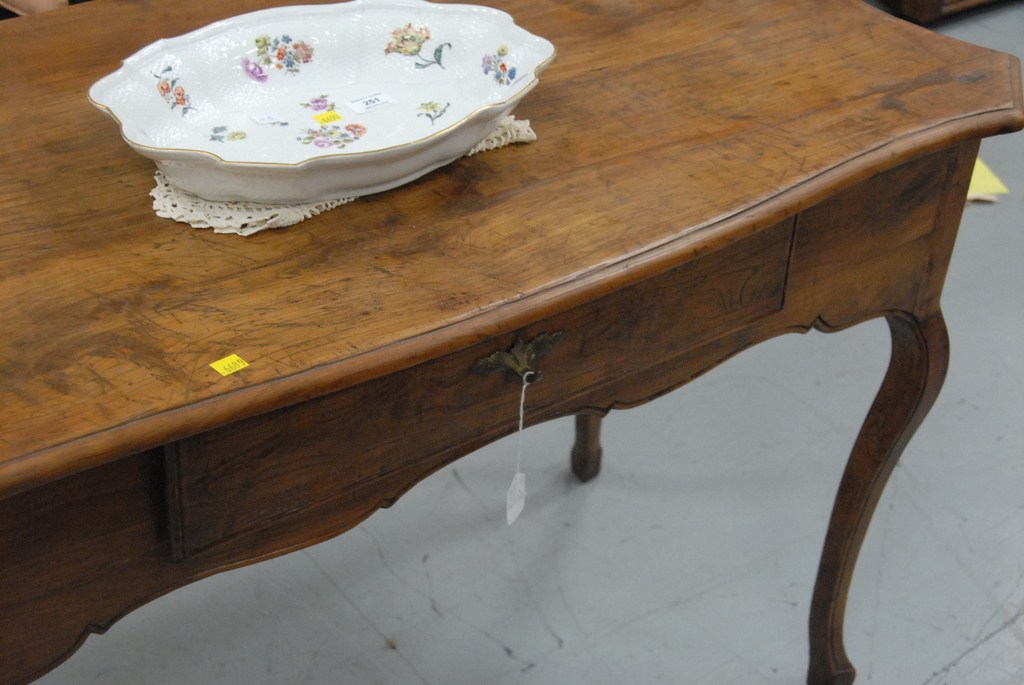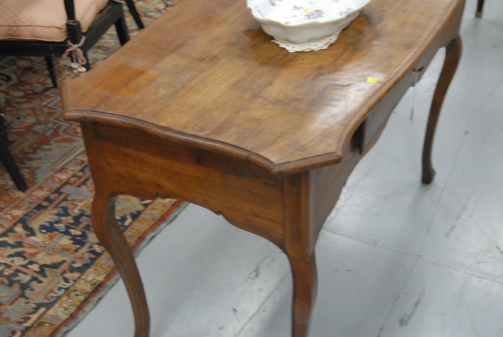 Lot 360: Louis XV walnut small table desk with molded rectangular wood top above a carved shaped frieze with one drawer raised on cabriole le…