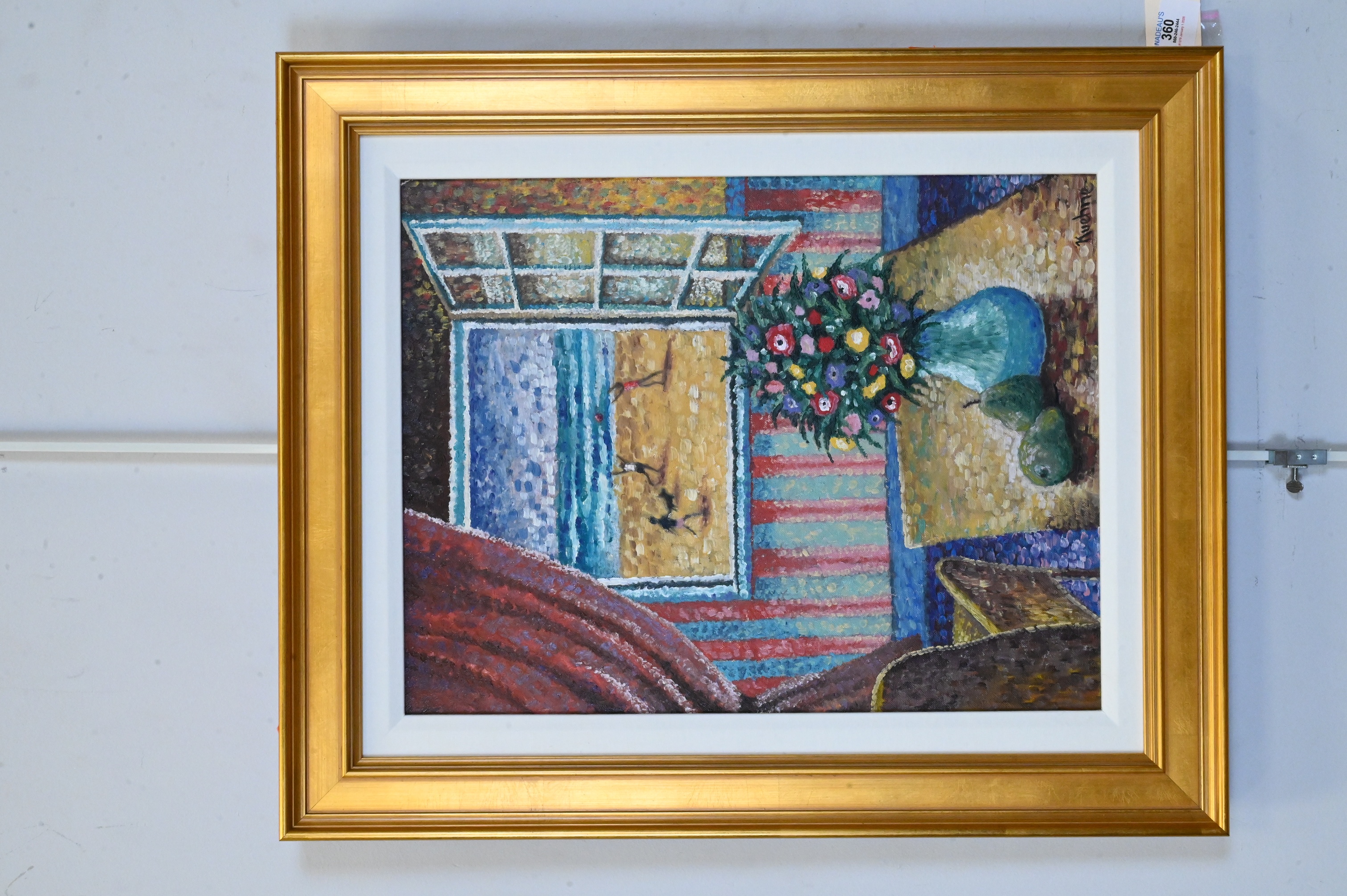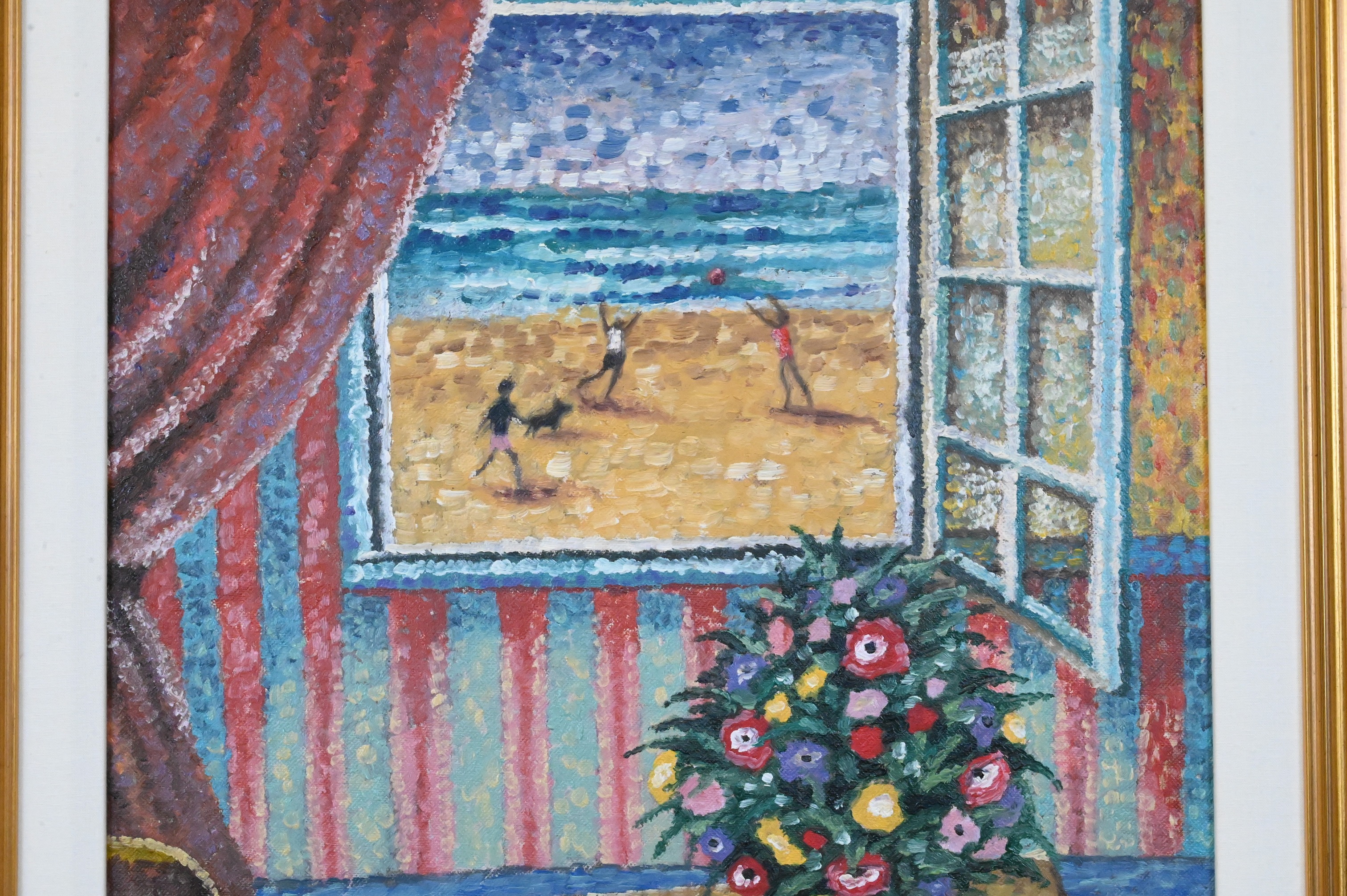 Depicting a vase of flowers and pears on a table before an open window overlooking figures playing on a sunlit beach, rendered in bold, pointillist brushwork with vivid complementary colors
