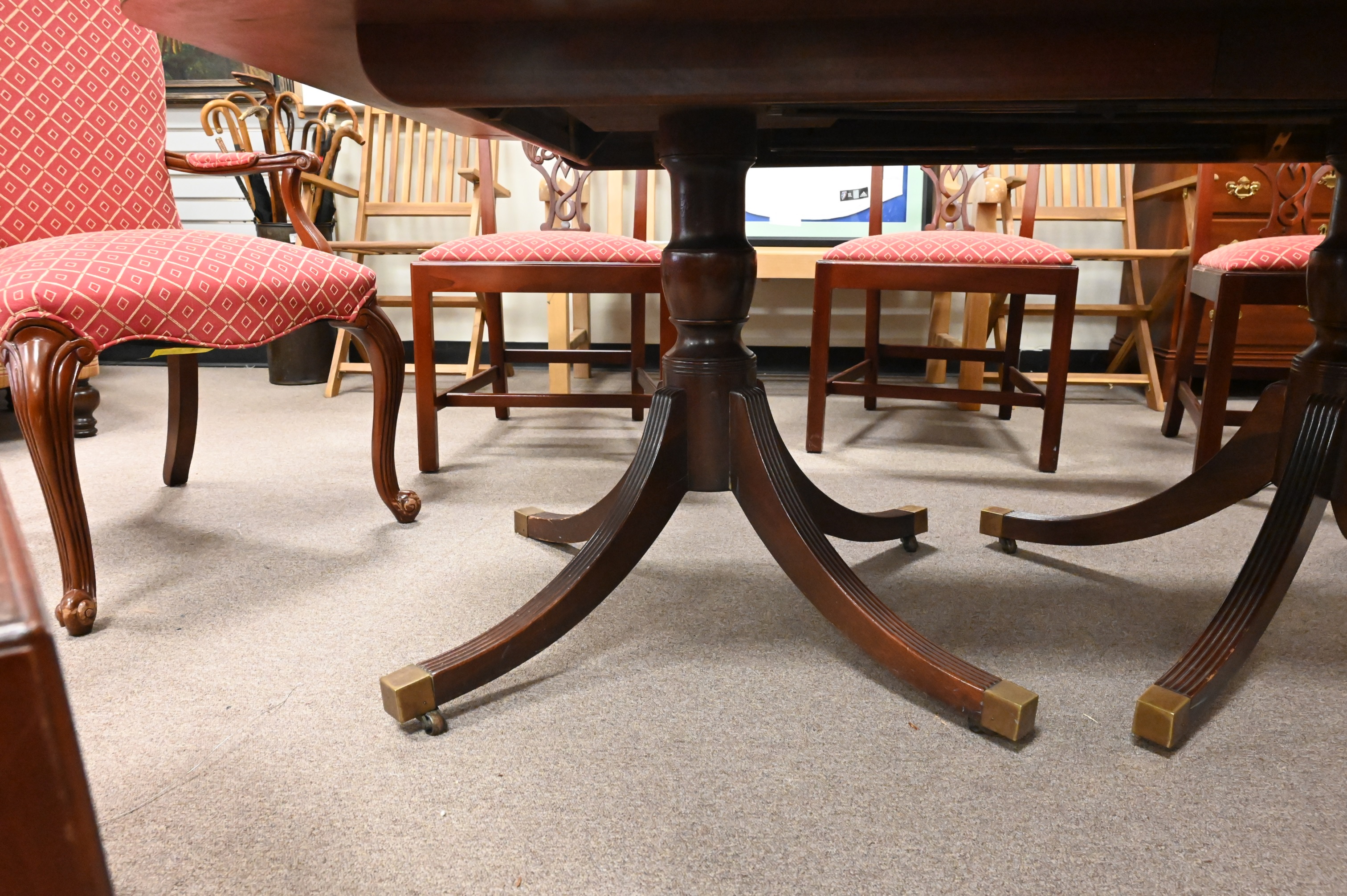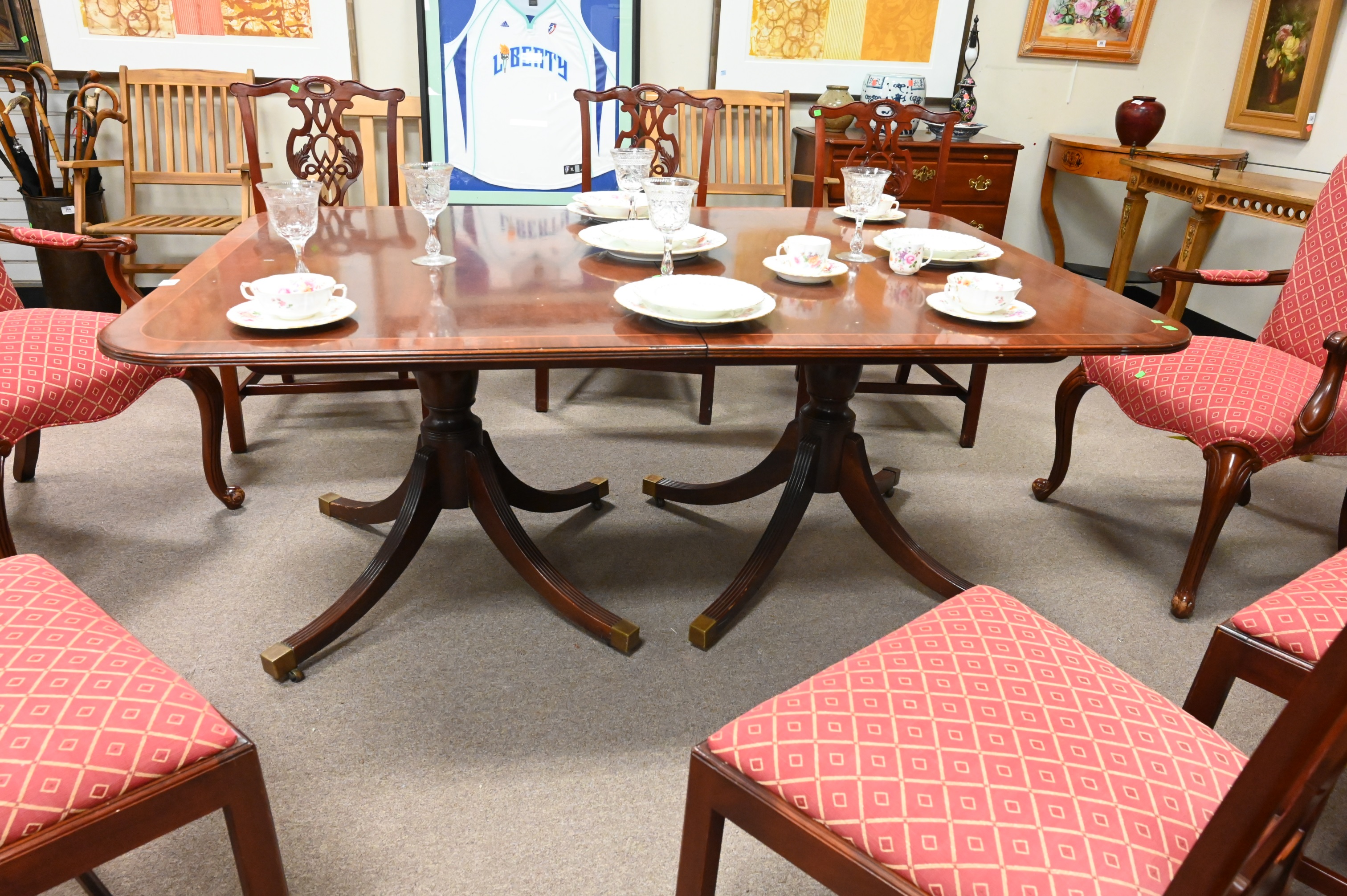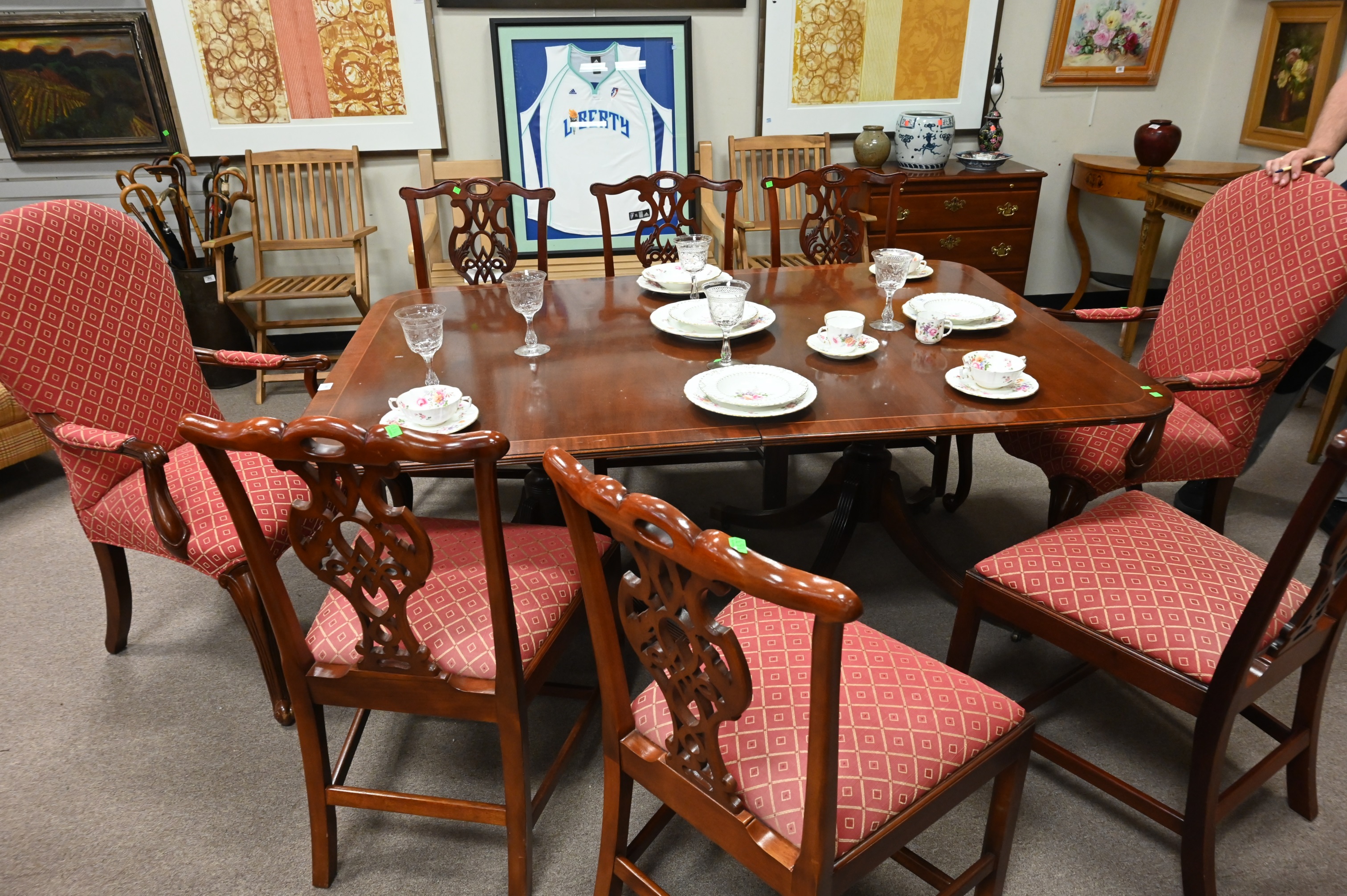 Nine Piece Baker Mahogany Dining Room Set, to include six chippendale style chairs, two Louis XV style arm chairs, along with a double pedestal table having banded inlaid top, two leaves, height 29 inches, top 46″ x 68″ (with leaves 46″ x 108″)