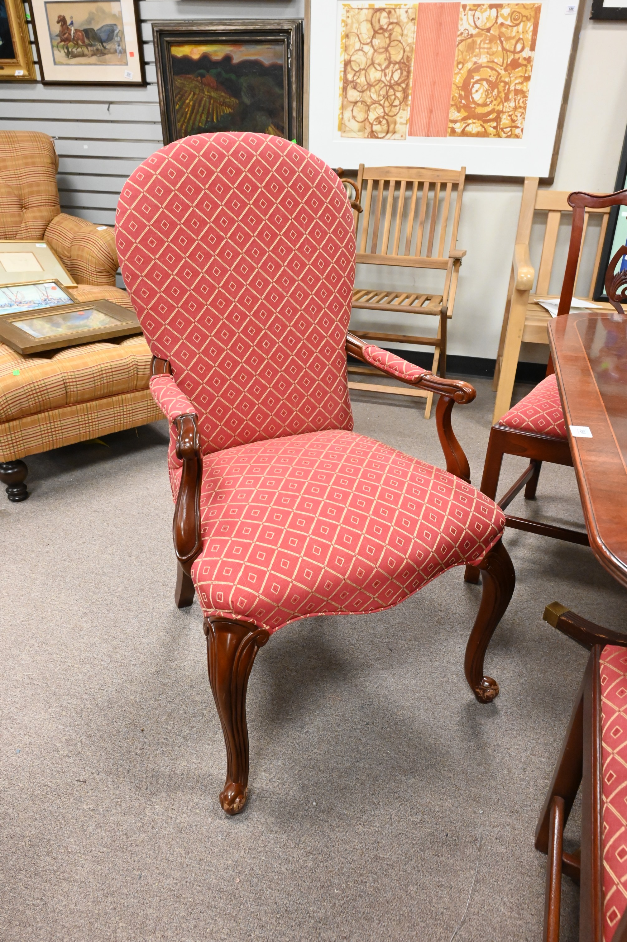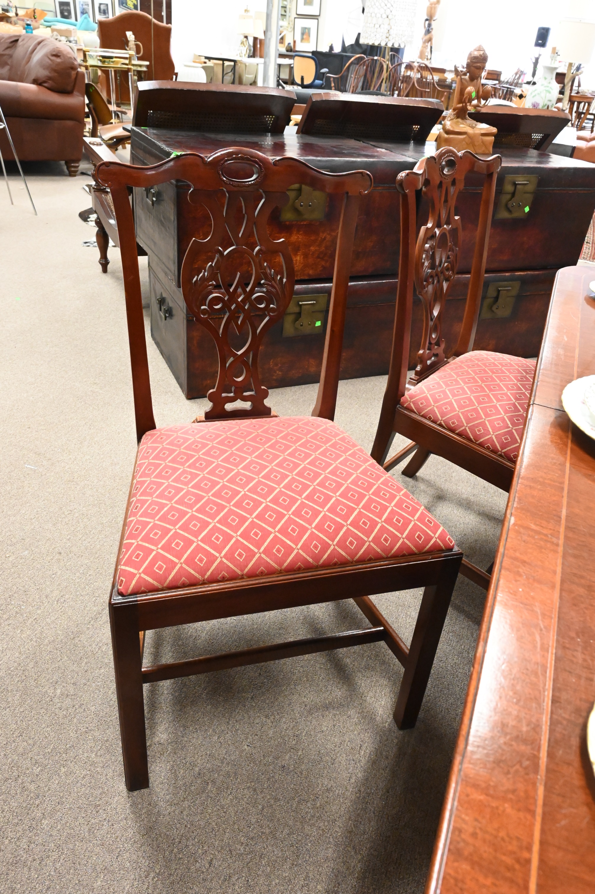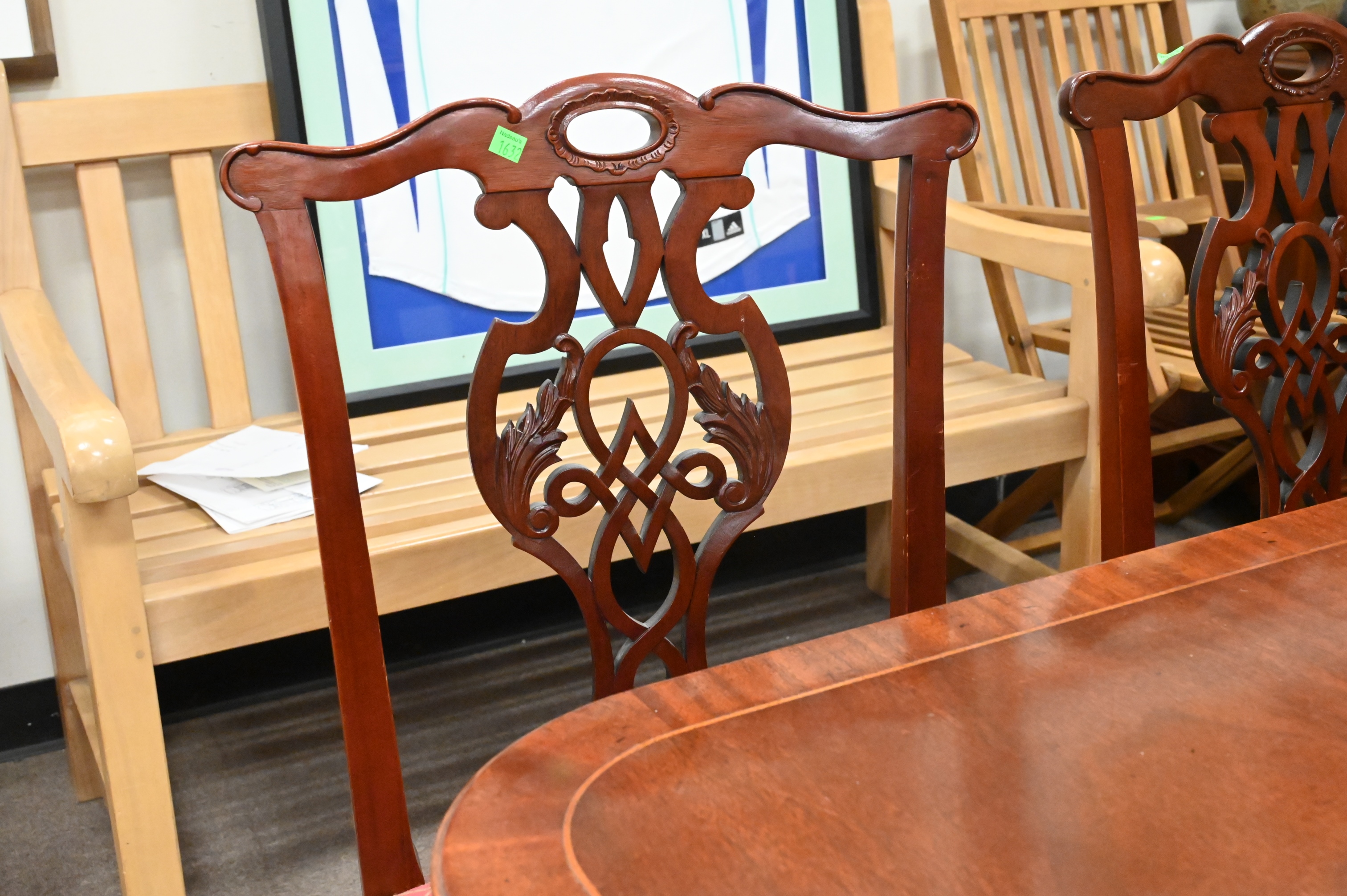Nine Piece Baker Mahogany Dining Room Set, to include six chippendale style chairs, two Louis XV style arm chairs, along with a double pedestal table having banded inlaid top, two leaves, height 29 inches, top 46″ x 68″ (with leaves 46″ x 108″)