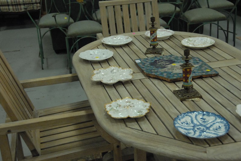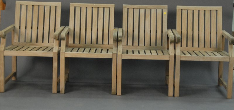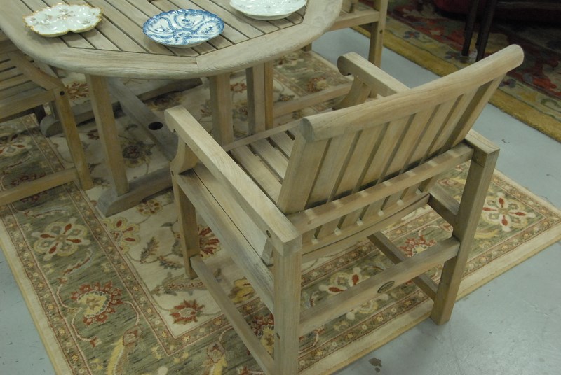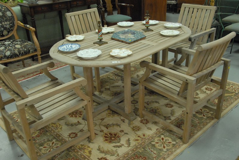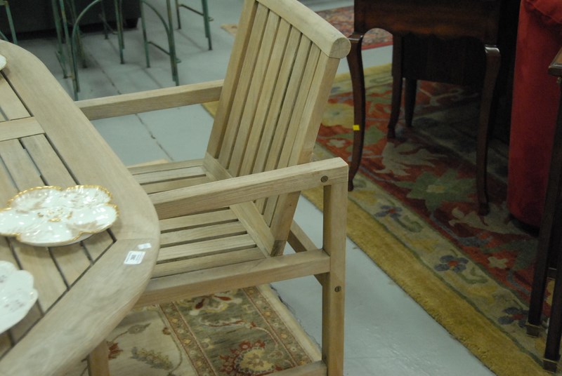 Lot 360: Outdoor Classics teak five piece set including a table and four armchairs, top: 39 x 67.