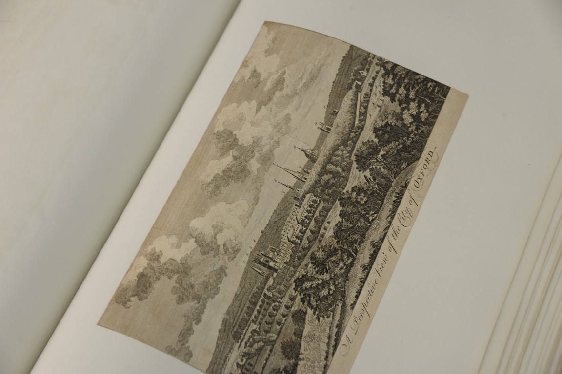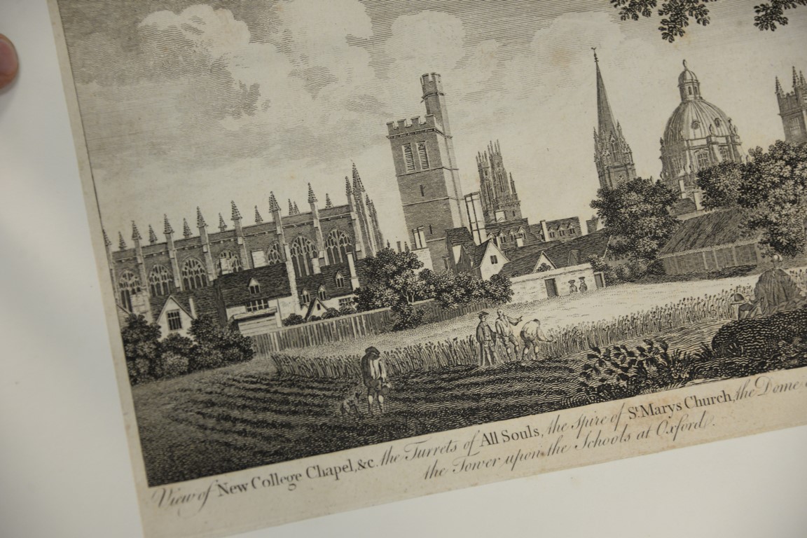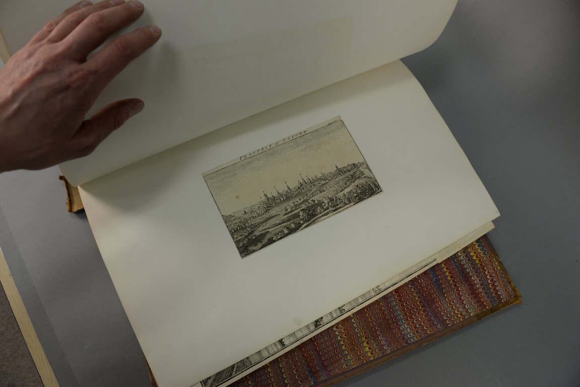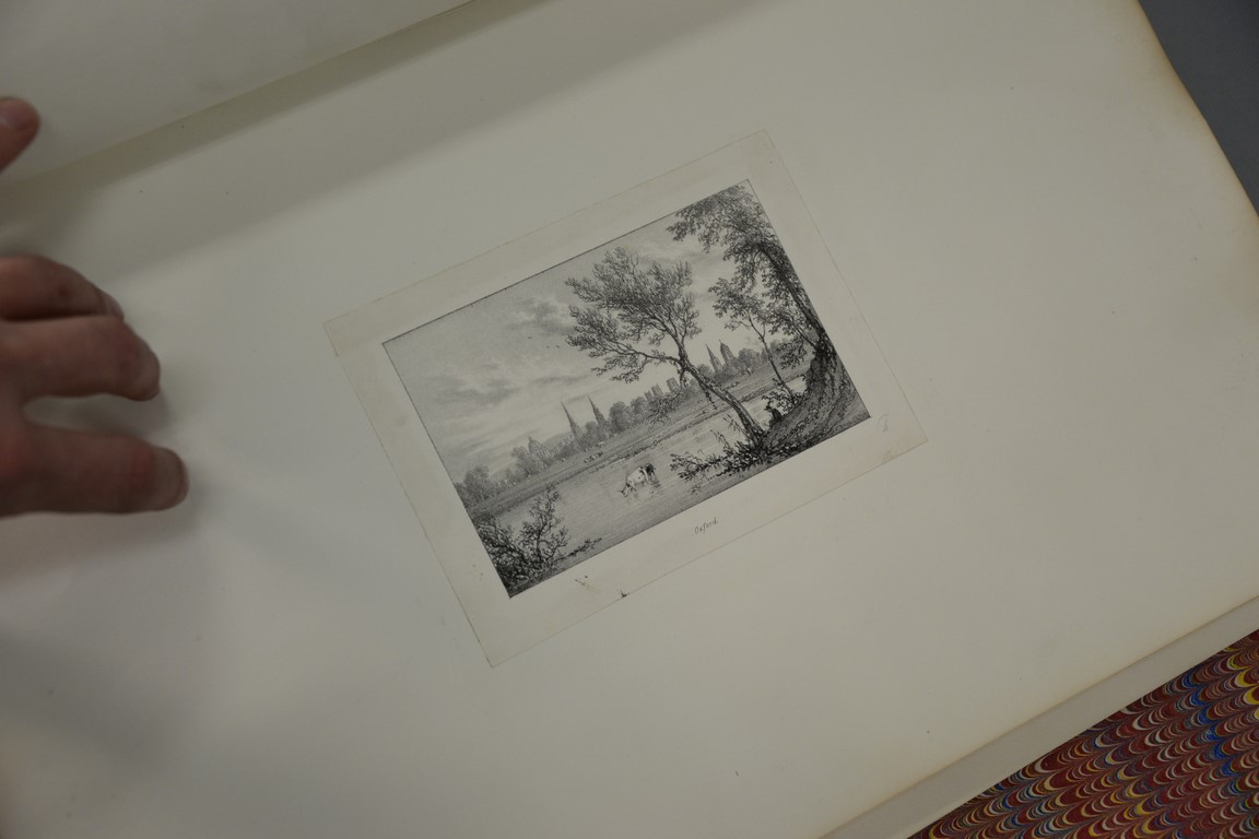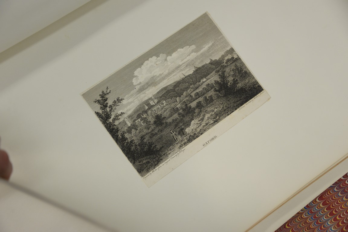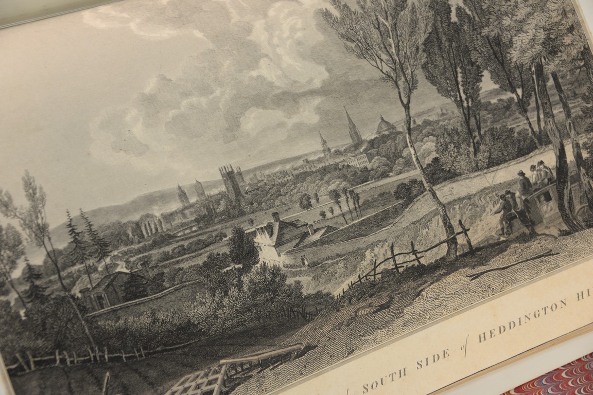 Oxford General Views of the City, scrapbook of engravings to include: Oxoniae Prospectus, A Prospect of the University and City of Oxford engraving , Frederick Christ Lewis, Universit of Oxford, Perspective View of the City of Oxford, View of Oxford from the South Side of Heddington, Eastern View of Oxford, An East Prospect of the City of Oxford, The South Prospect of the City of Oxford, The Southwest Prospect of the University and the City of Oxford, The General View of the University, View of Oxford, From the Castle Keep, Prospetus Oxoniea Orientalis, A General View of the City of Oxford, plus many more. 4 3/4 x 6 1/4 to 22 x 32