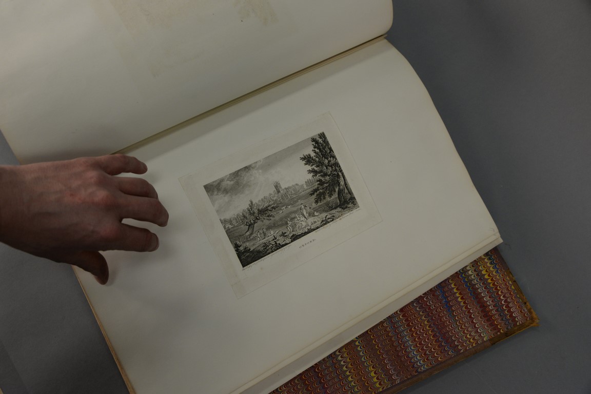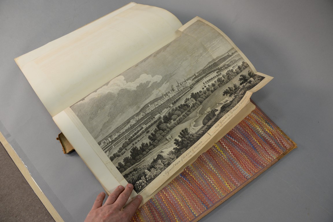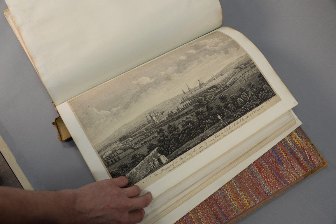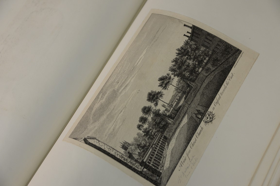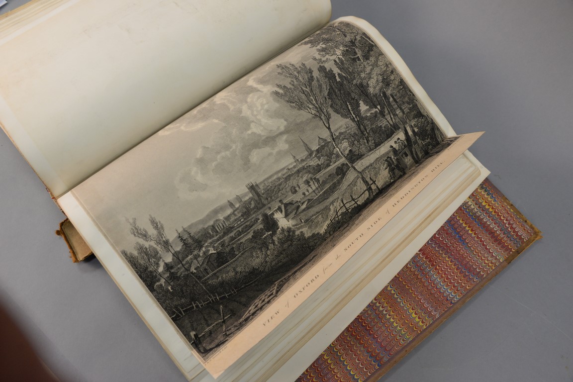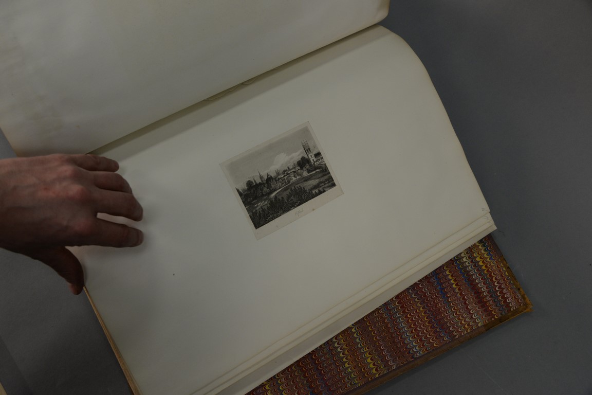 Oxford General Views of the City, scrapbook of engravings to include: Oxoniae Prospectus, A Prospect of the University and City of Oxford engraving , Frederick Christ Lewis, Universit of Oxford, Perspective View of the City of Oxford, View of Oxford from the South Side of Heddington, Eastern View of Oxford, An East Prospect of the City of Oxford, The South Prospect of the City of Oxford, The Southwest Prospect of the University and the City of Oxford, The General View of the University, View of Oxford, From the Castle Keep, Prospetus Oxoniea Orientalis, A General View of the City of Oxford, plus many more. 4 3/4 x 6 1/4 to 22 x 32