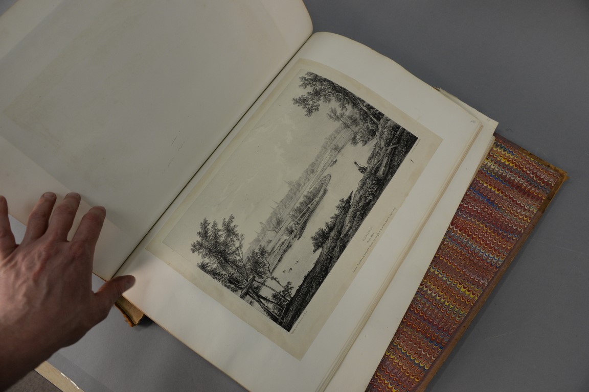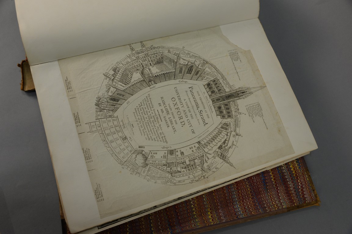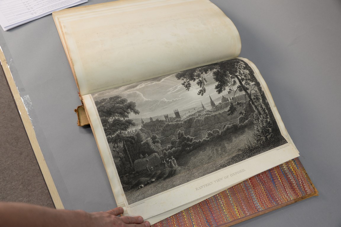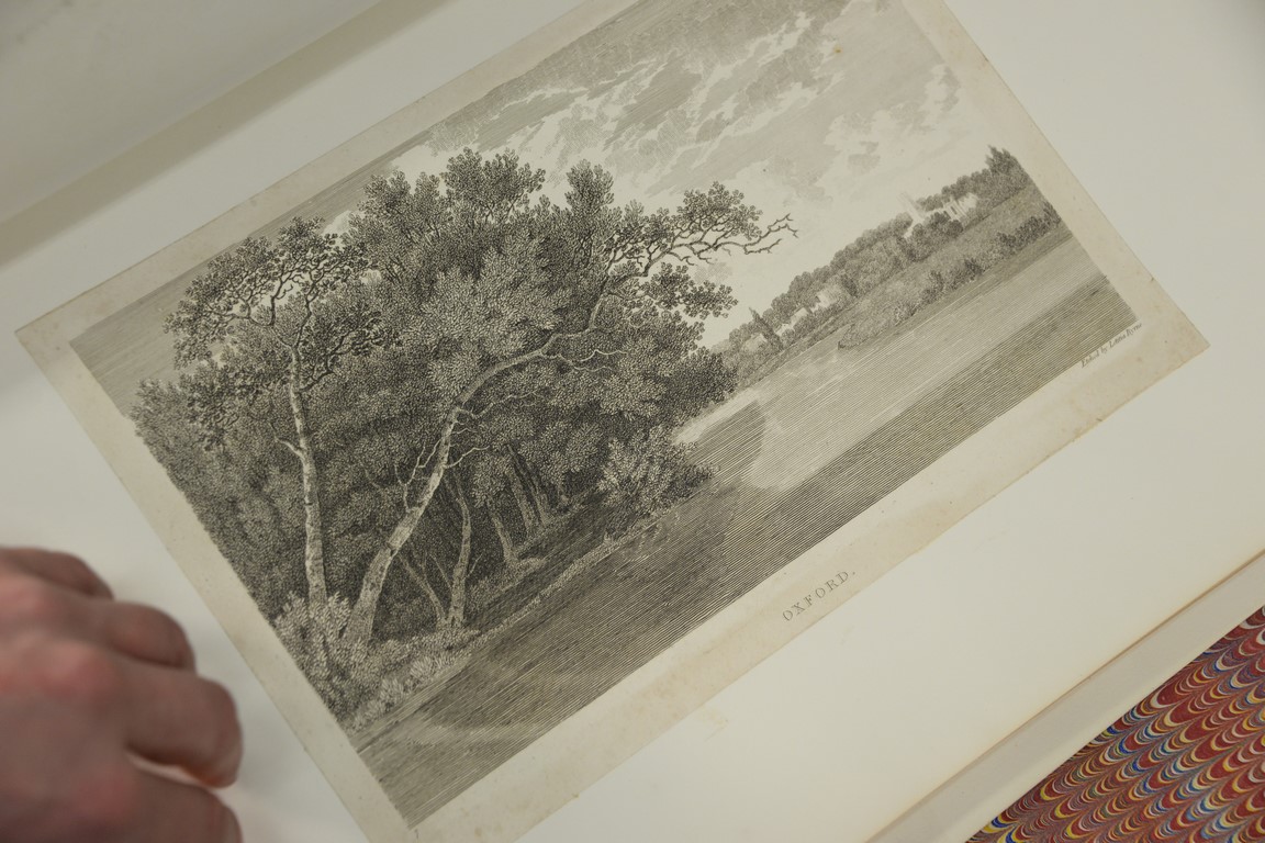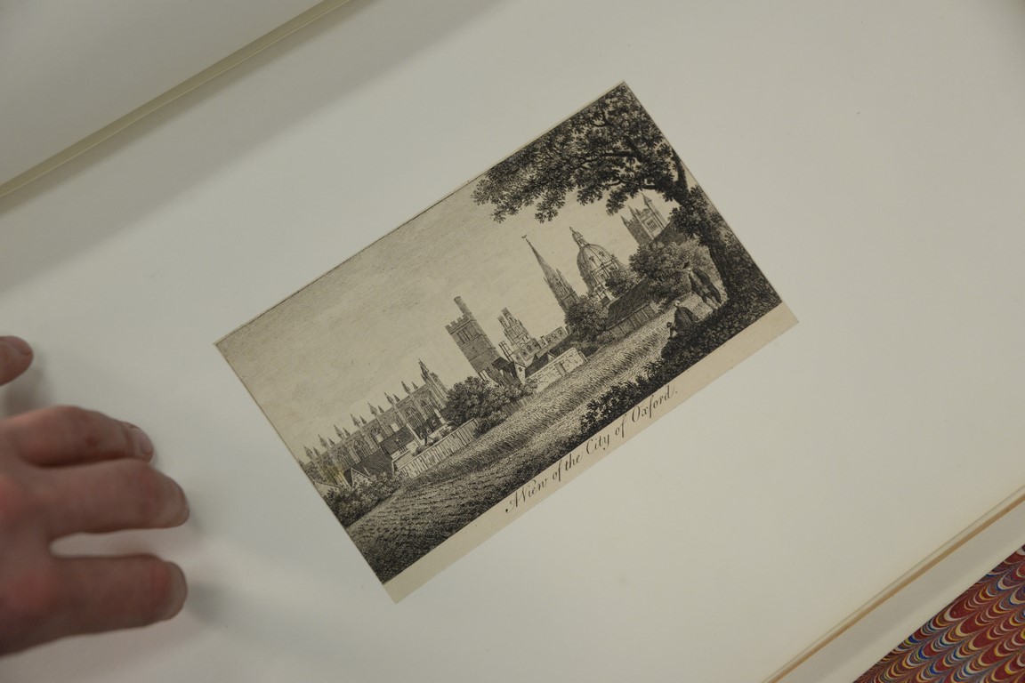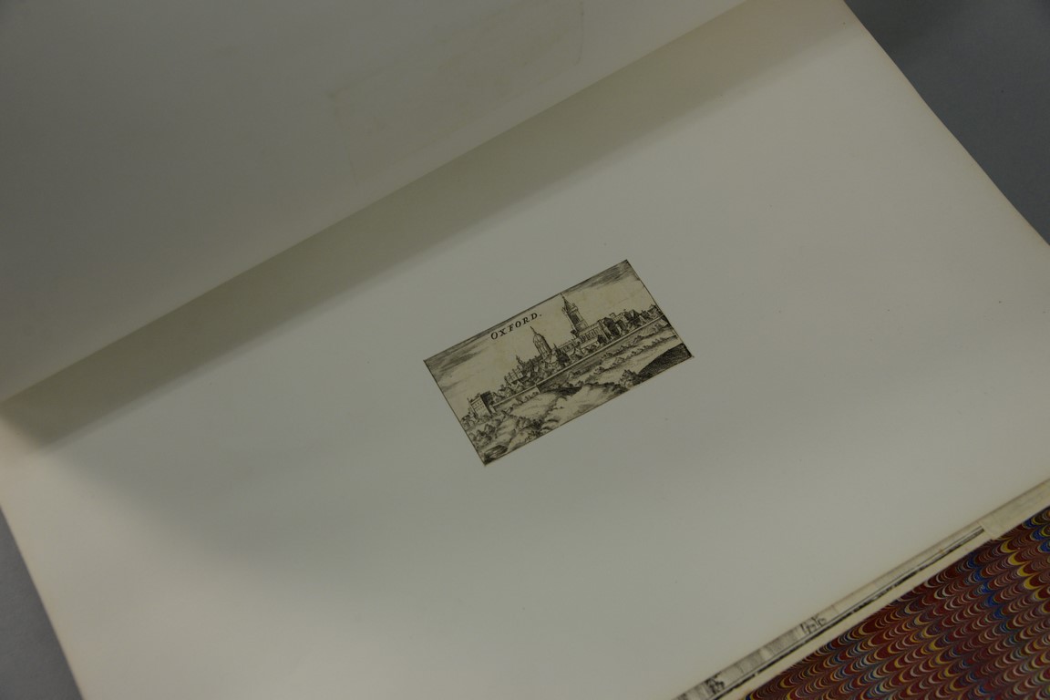 Oxford General Views of the City, scrapbook of engravings to include: Oxoniae Prospectus, A Prospect of the University and City of Oxford engraving , Frederick Christ Lewis, Universit of Oxford, Perspective View of the City of Oxford, View of Oxford from the South Side of Heddington, Eastern View of Oxford, An East Prospect of the City of Oxford, The South Prospect of the City of Oxford, The Southwest Prospect of the University and the City of Oxford, The General View of the University, View of Oxford, From the Castle Keep, Prospetus Oxoniea Orientalis, A General View of the City of Oxford, plus many more. 4 3/4 x 6 1/4 to 22 x 32