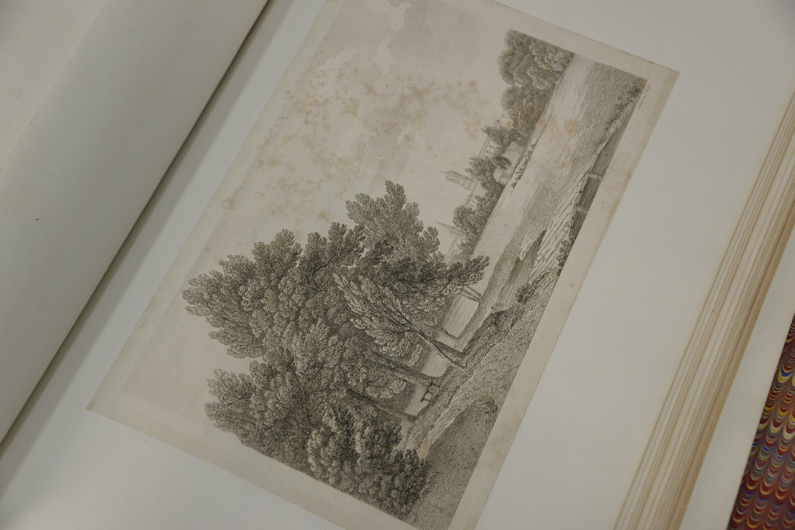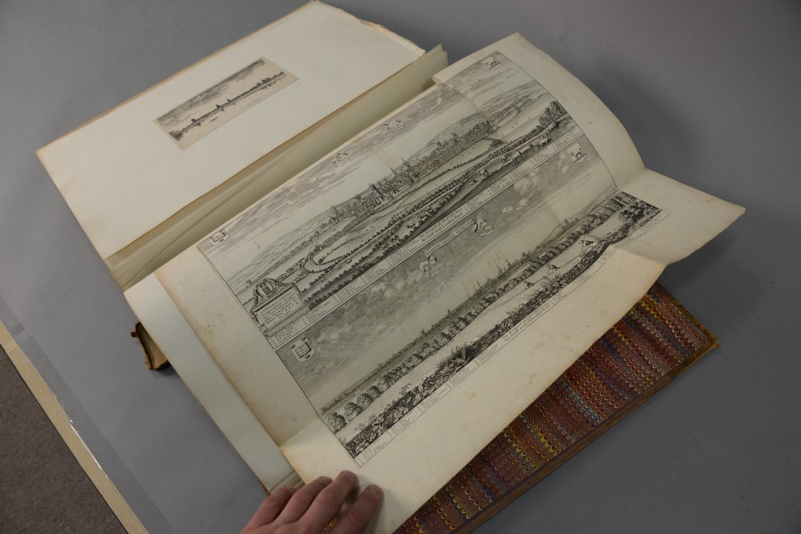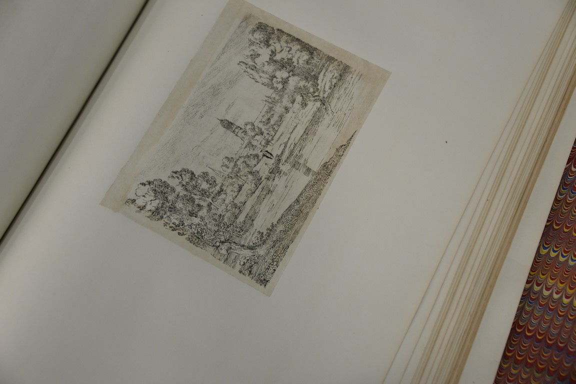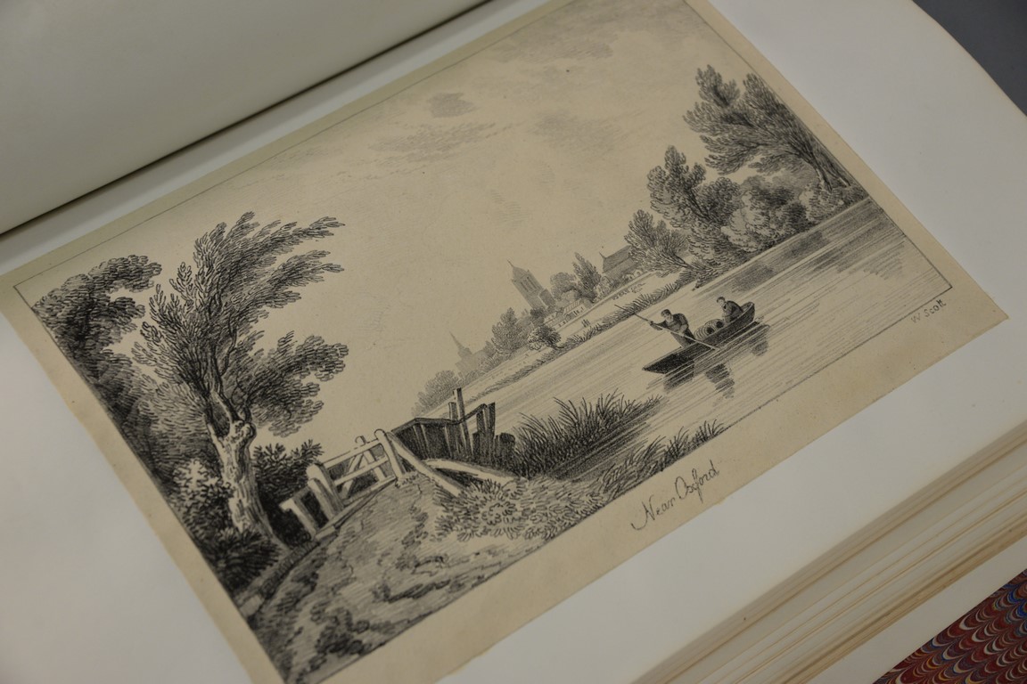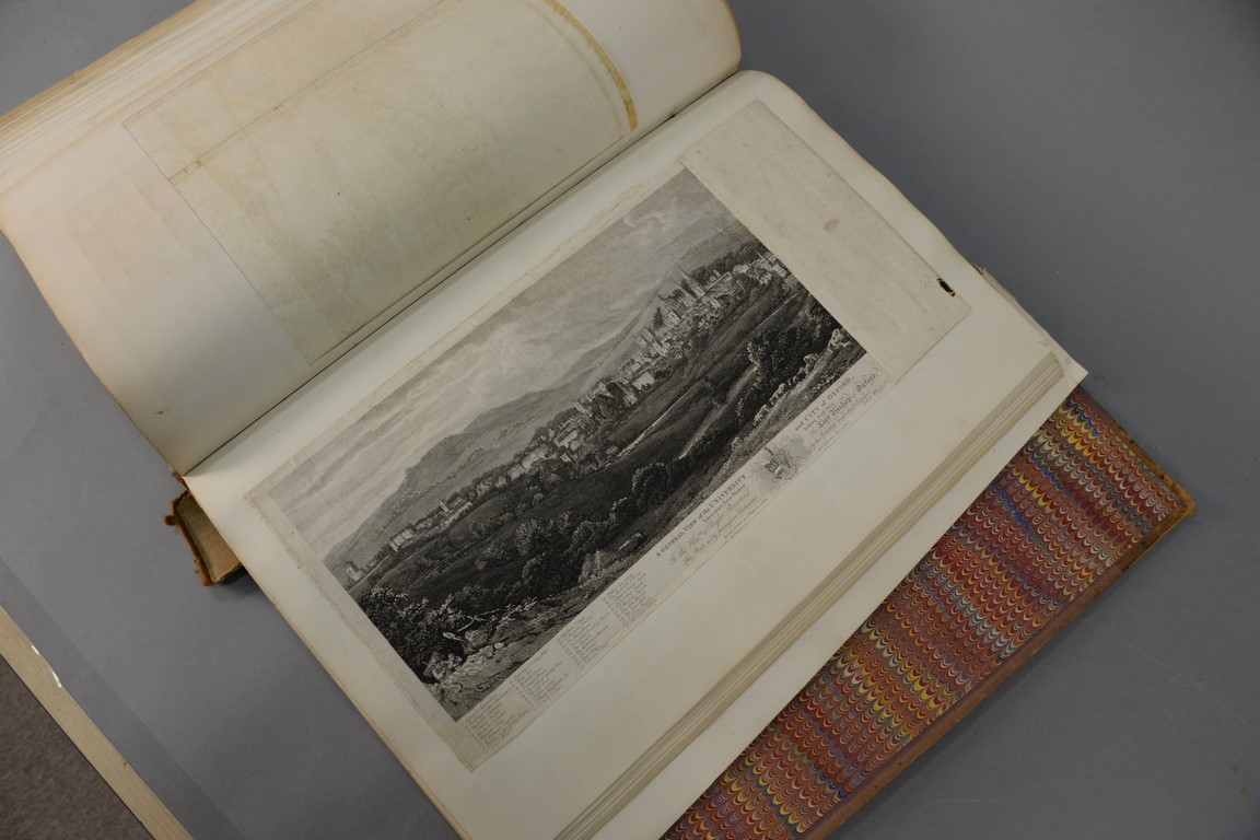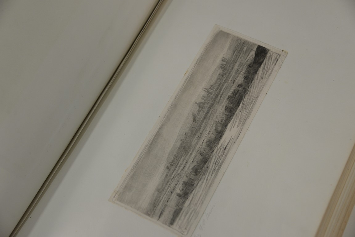 Oxford General Views of the City, scrapbook of engravings to include: Oxoniae Prospectus, A Prospect of the University and City of Oxford engraving , Frederick Christ Lewis, Universit of Oxford, Perspective View of the City of Oxford, View of Oxford from the South Side of Heddington, Eastern View of Oxford, An East Prospect of the City of Oxford, The South Prospect of the City of Oxford, The Southwest Prospect of the University and the City of Oxford, The General View of the University, View of Oxford, From the Castle Keep, Prospetus Oxoniea Orientalis, A General View of the City of Oxford, plus many more. 4 3/4 x 6 1/4 to 22 x 32