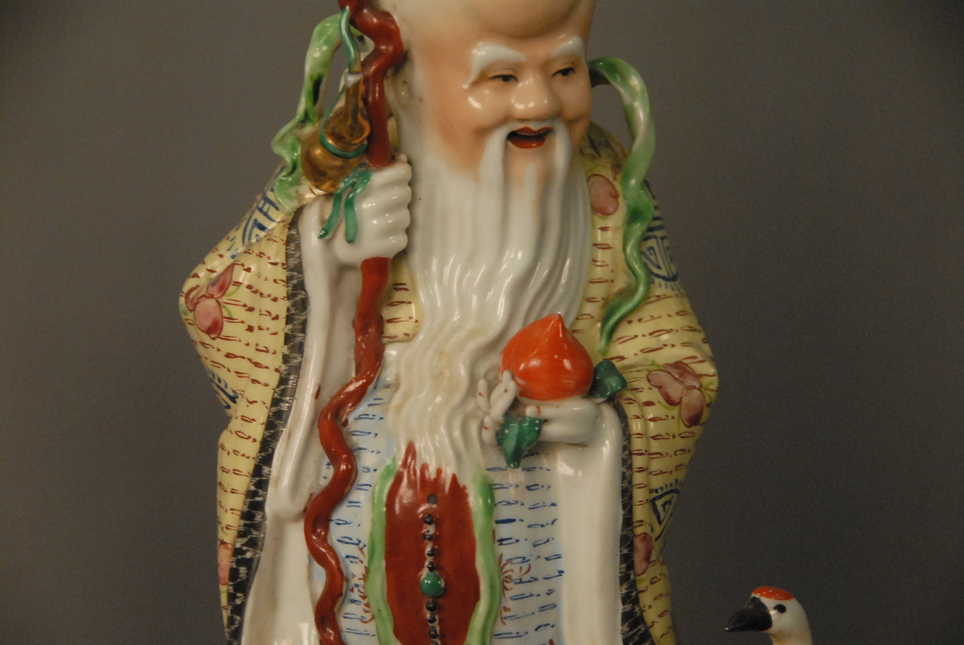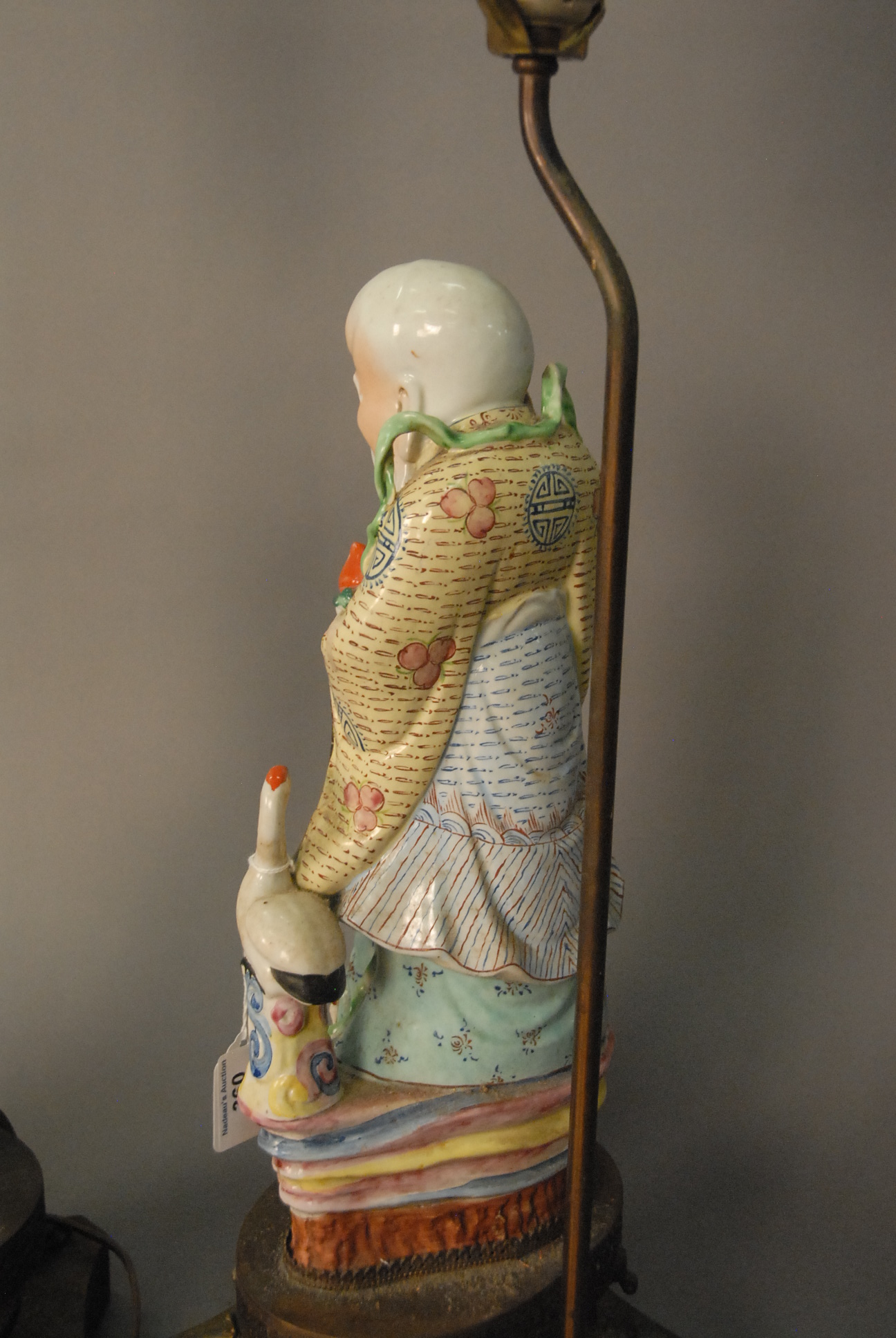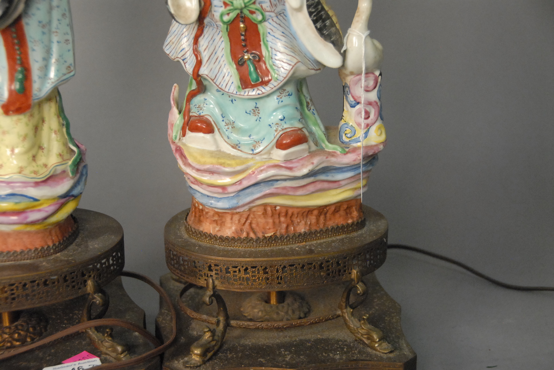 Lot 360: Pair of Famille Rose figures made into table lamps, a scholar holding a fruit and Guanyin with a basket. ht. 14 1/2 in.