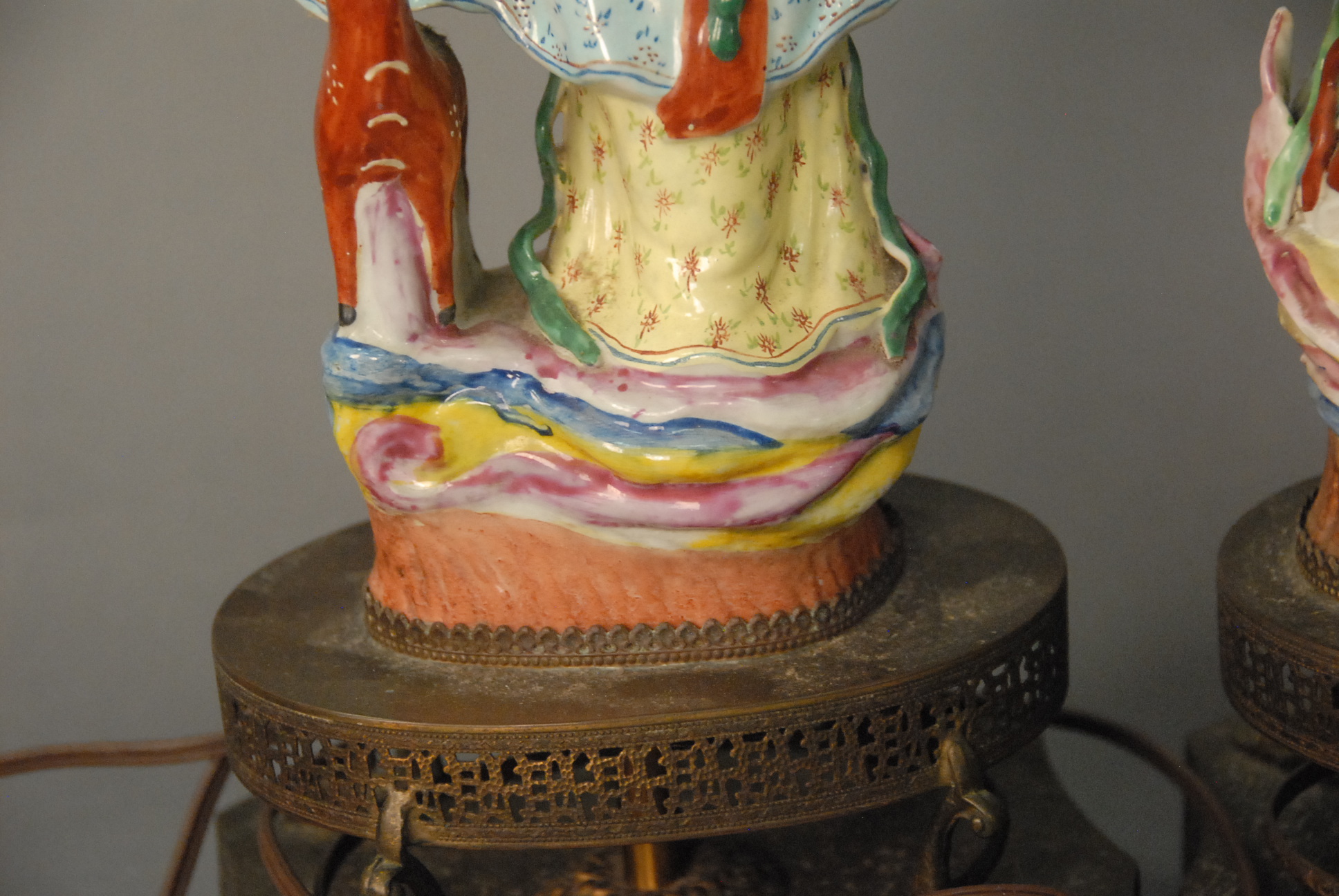 Pair of Famille Rose figures made into table lamps, a scholar holding a fruit and Guanyin with a basket. ht. 14 1/2 in.